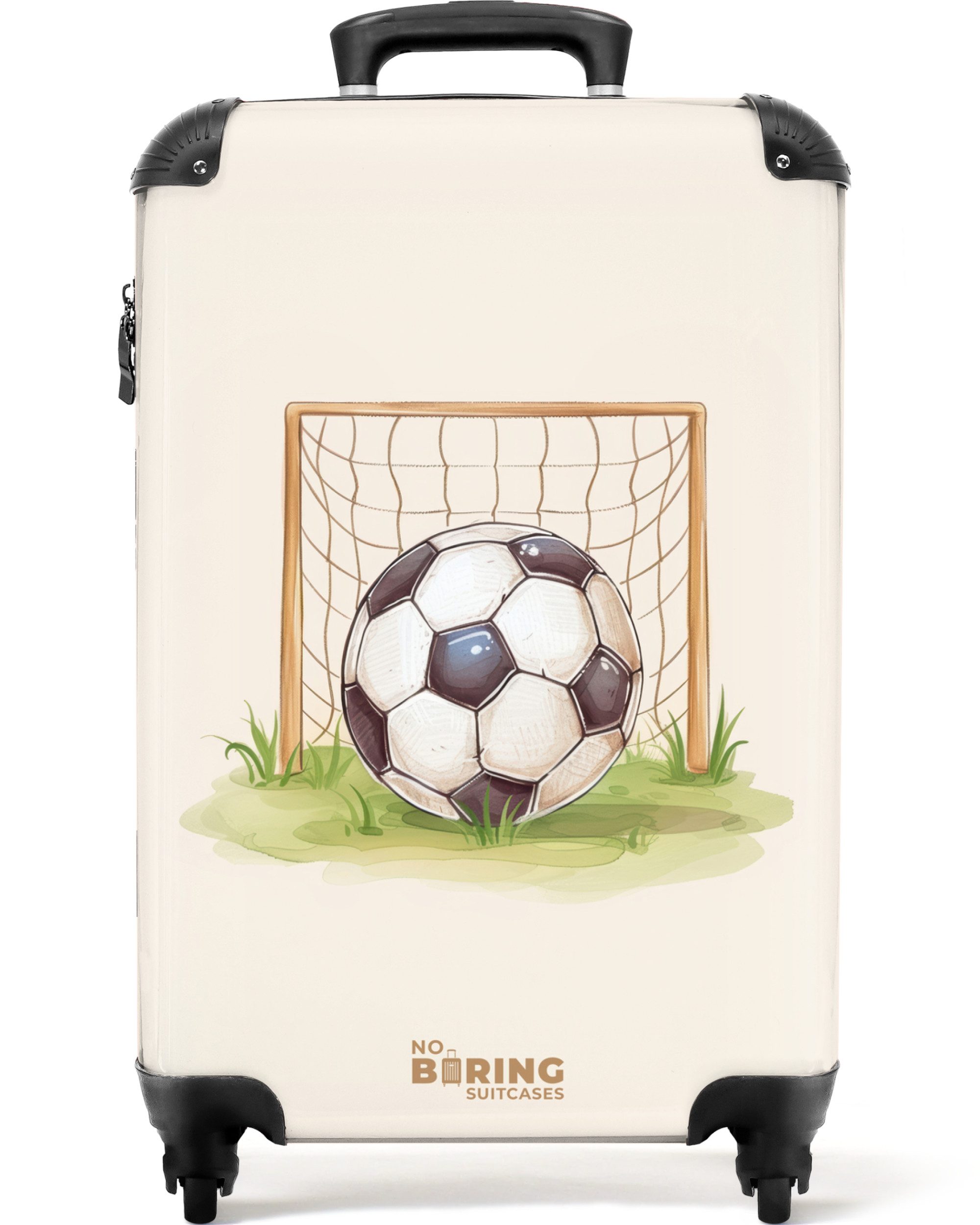 Ein schwarz-weißer Fußball rollt kraftvoll gegen das Netz eines Holztores, umgeben von frischem grünen Gras und einem weichen beigen Hintergrund voller sommerlicher Ruhe.Optik | bedruckt |