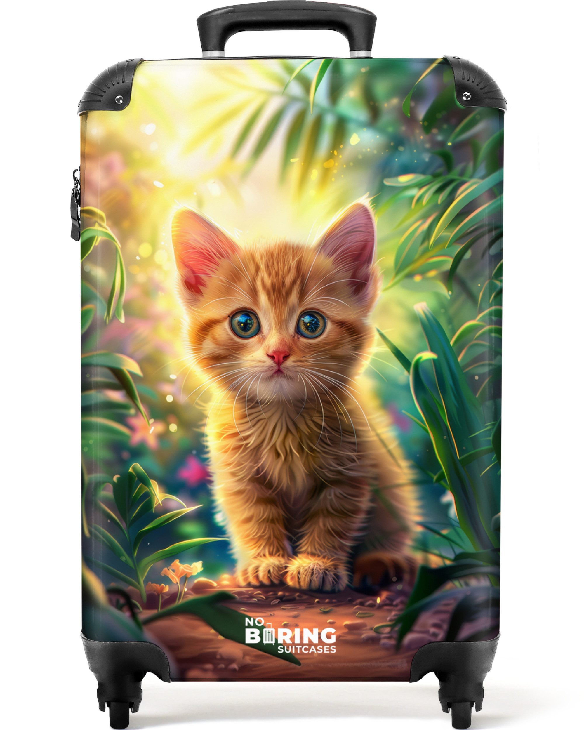 Ein entzückendes rothaariges Kätzchen sitzt inmitten üppiger grüner Pflanzen, durch deren Blätter die Sonnenstrahlen scheinen. Das Kätzchen blickt neugierig nach vorne.Optik | bedruckt |
