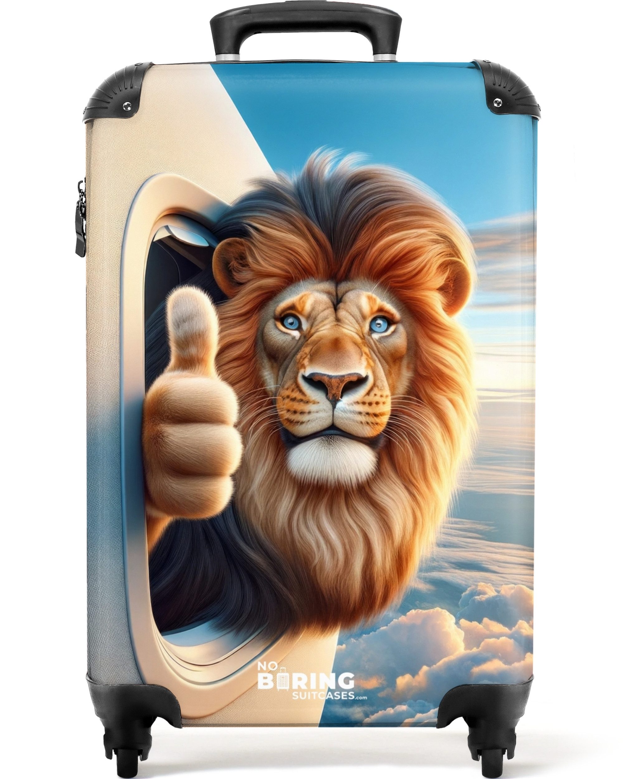 Eine Illustration zeigt einen Löwen, der mit erhobenem Daumen aus dem Fenster eines Flugzeugs ragt. Im Hintergrund sind ein blauer Himmel und eine Wolkendecke zu sehen, wobei die Sonnenstrahlen den Wolken eine warme orange Farbe verleihen. Ein einzigartiges und fröhliches Bild.Optik | bedruckt |