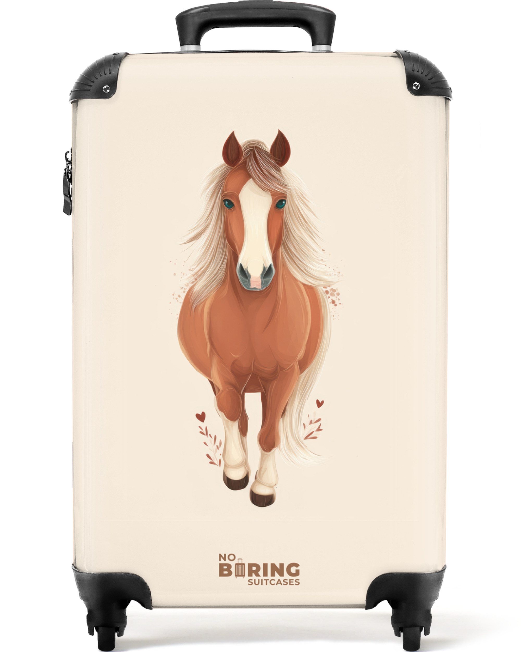 Ein braunes Pferd mit weißer Blesse und Mähne stürmt geradeaus über einen einfarbig beigen Hintergrund. Sanfte Farben betonen die Bewegung, während kleine Herzen und Blätter an den Beinen dem Pferd einen Hauch von Verspieltheit verleihen.Optik | bedruckt |