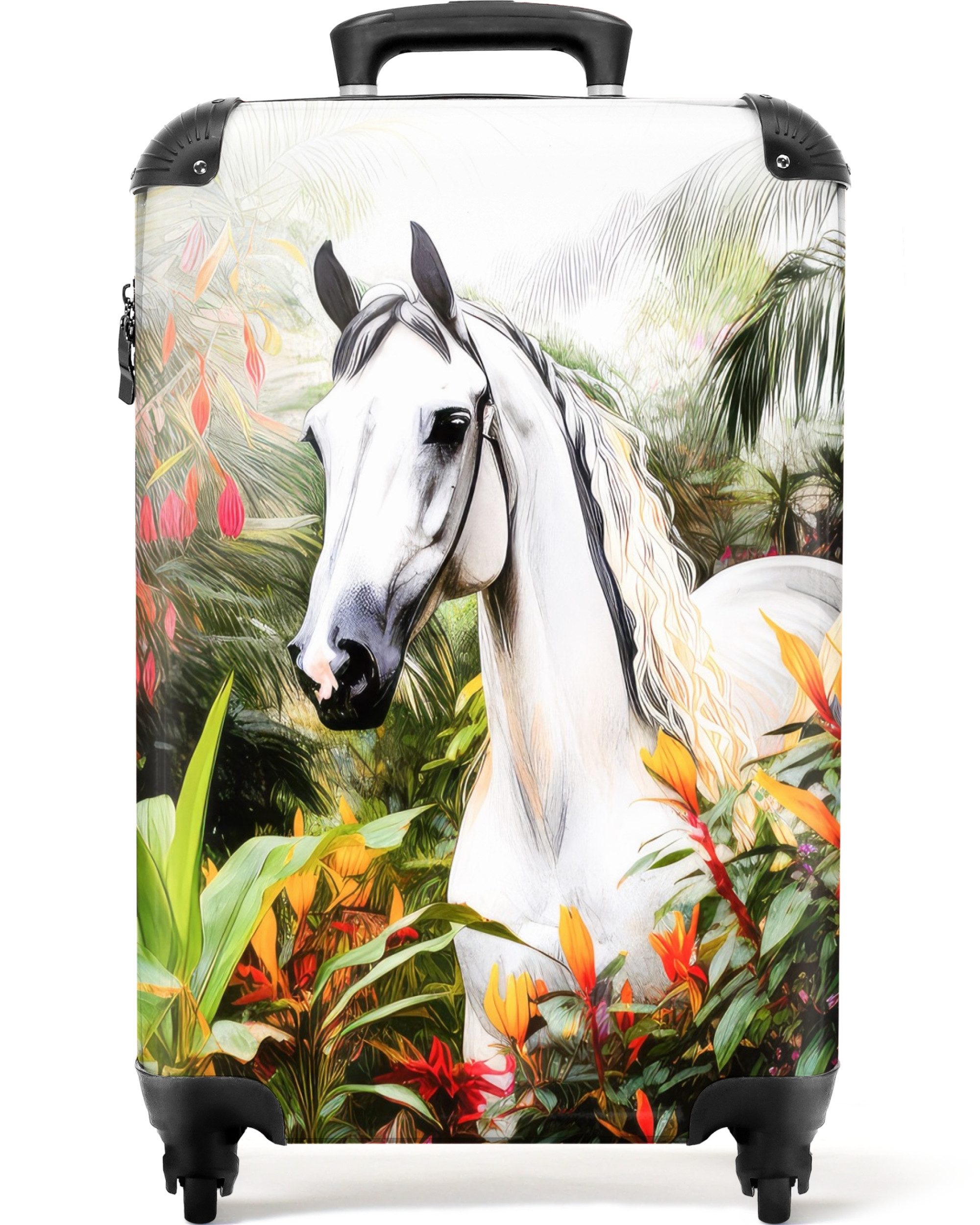Eine Illustration eines weißen Pferdes inmitten von bunten Blumen und Pflanzen.Optik | bedruckt |