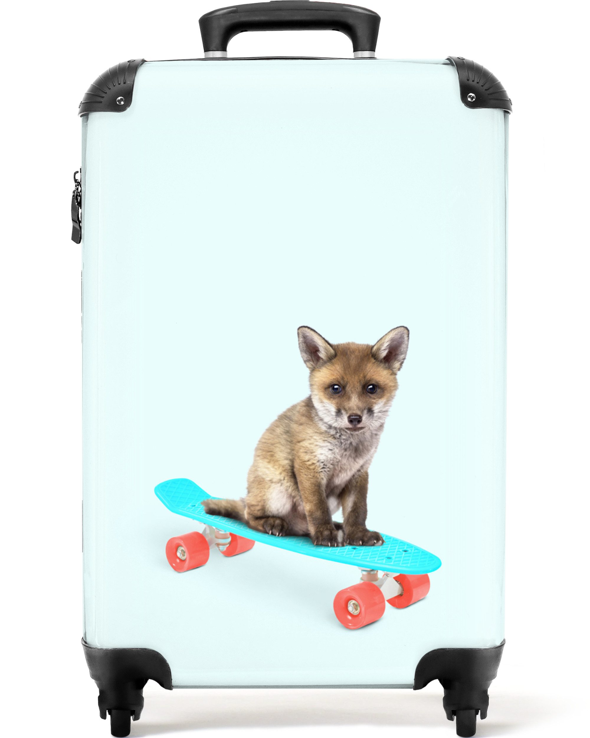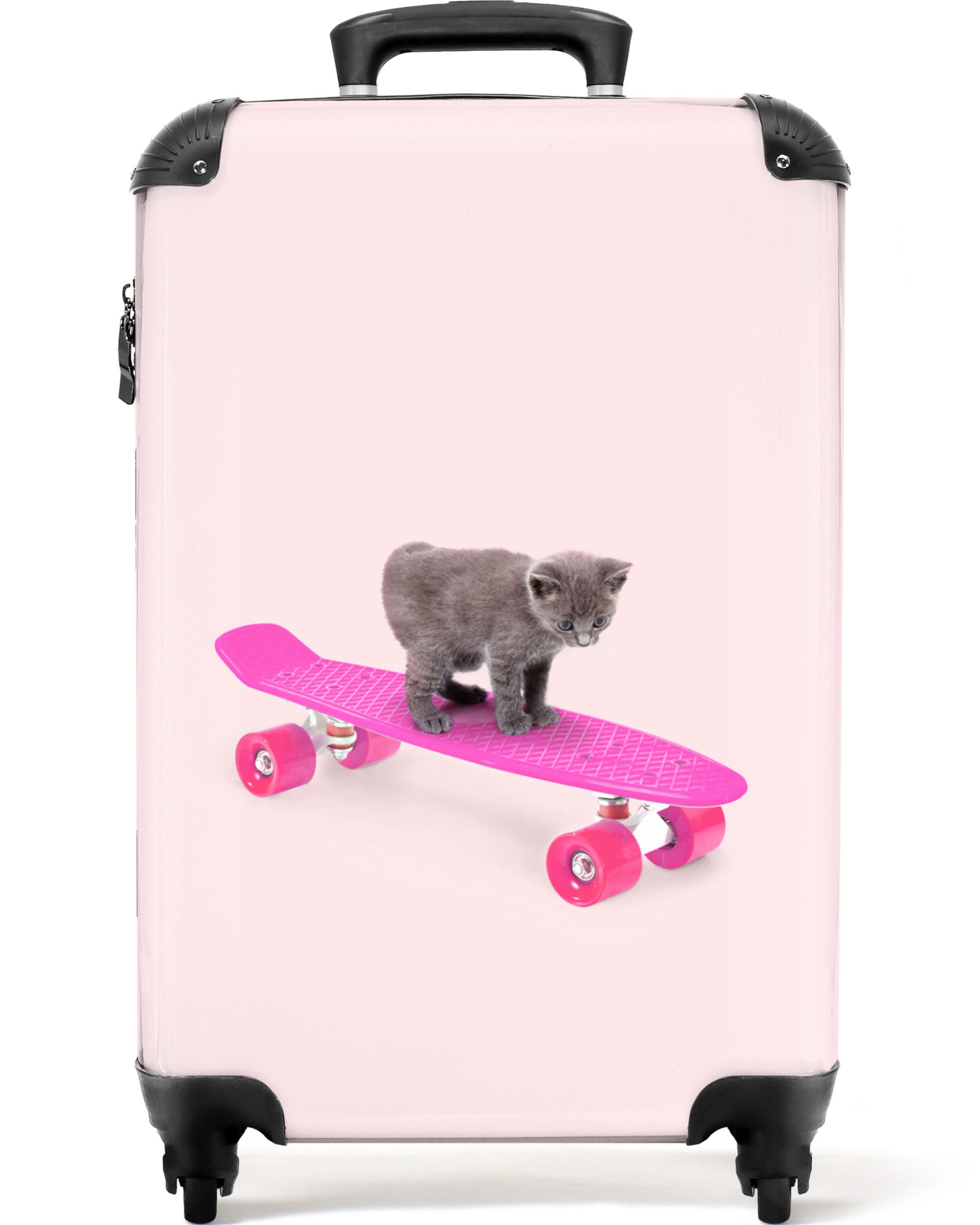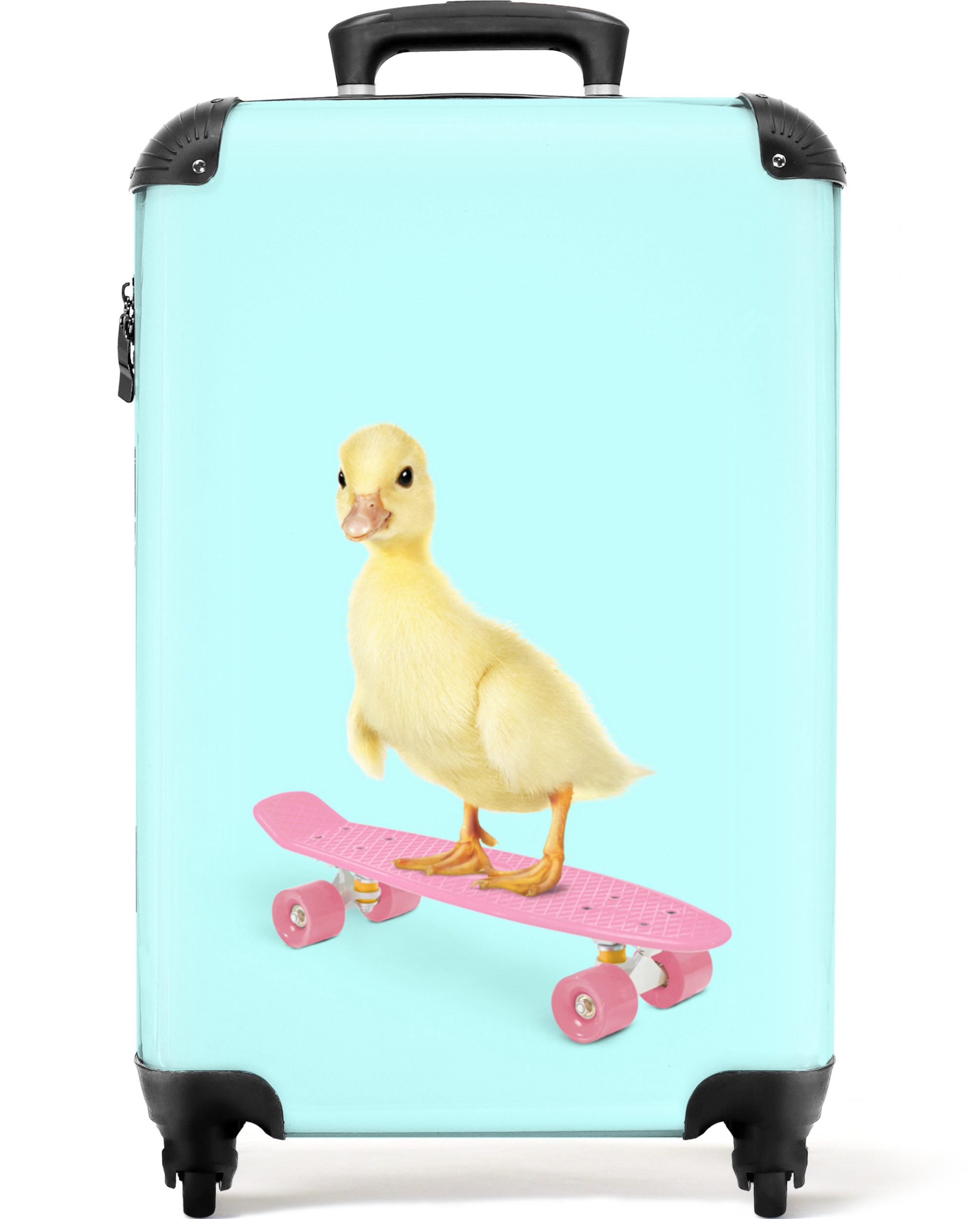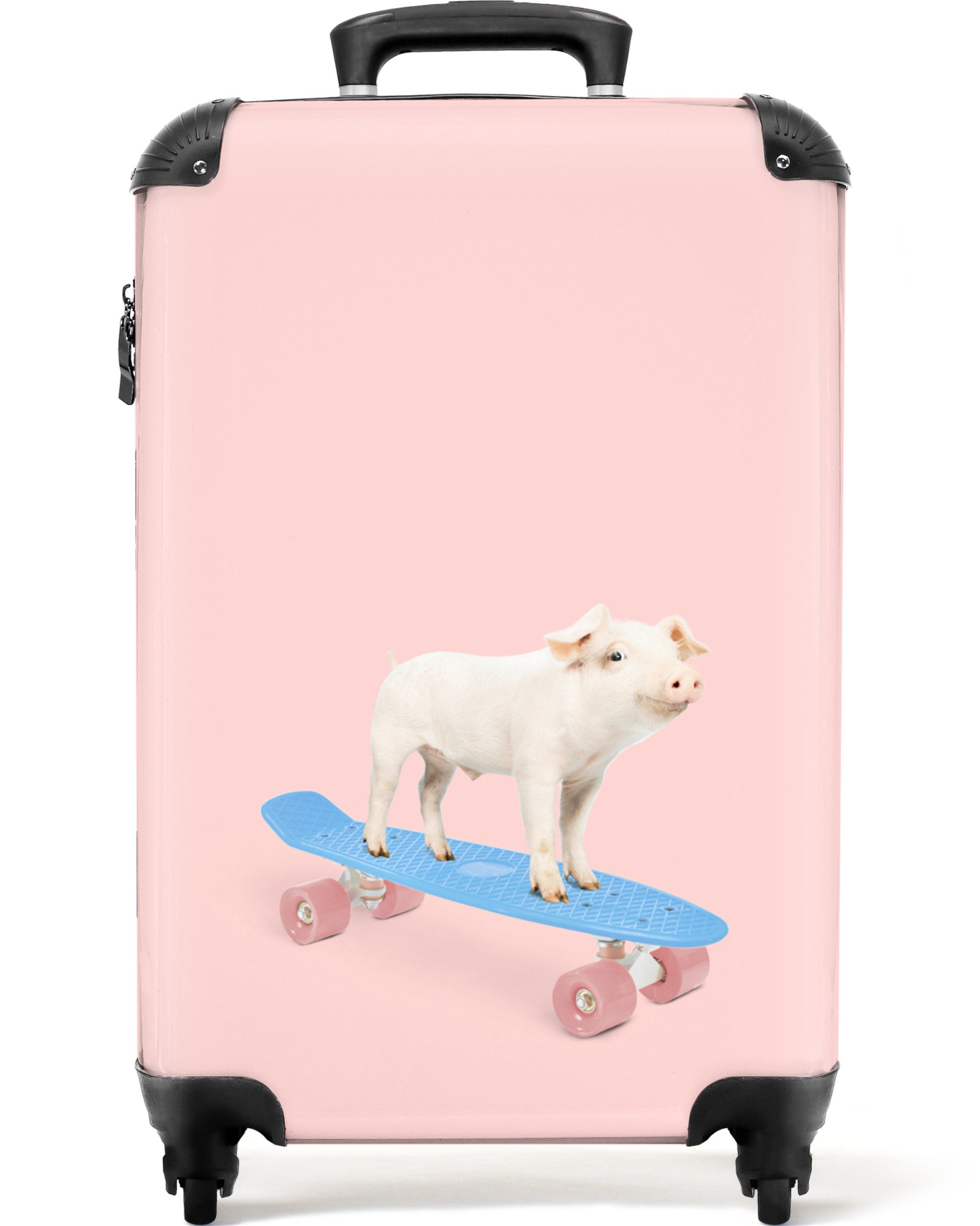 Sind Sie noch auf der Suche nach einem Kinderkoffer? Dann ist dies genau das Richtige für Sie! Die Fototasche zeigt ein Schweinchen auf einem blauen Skateboard mit rosa Rädern.