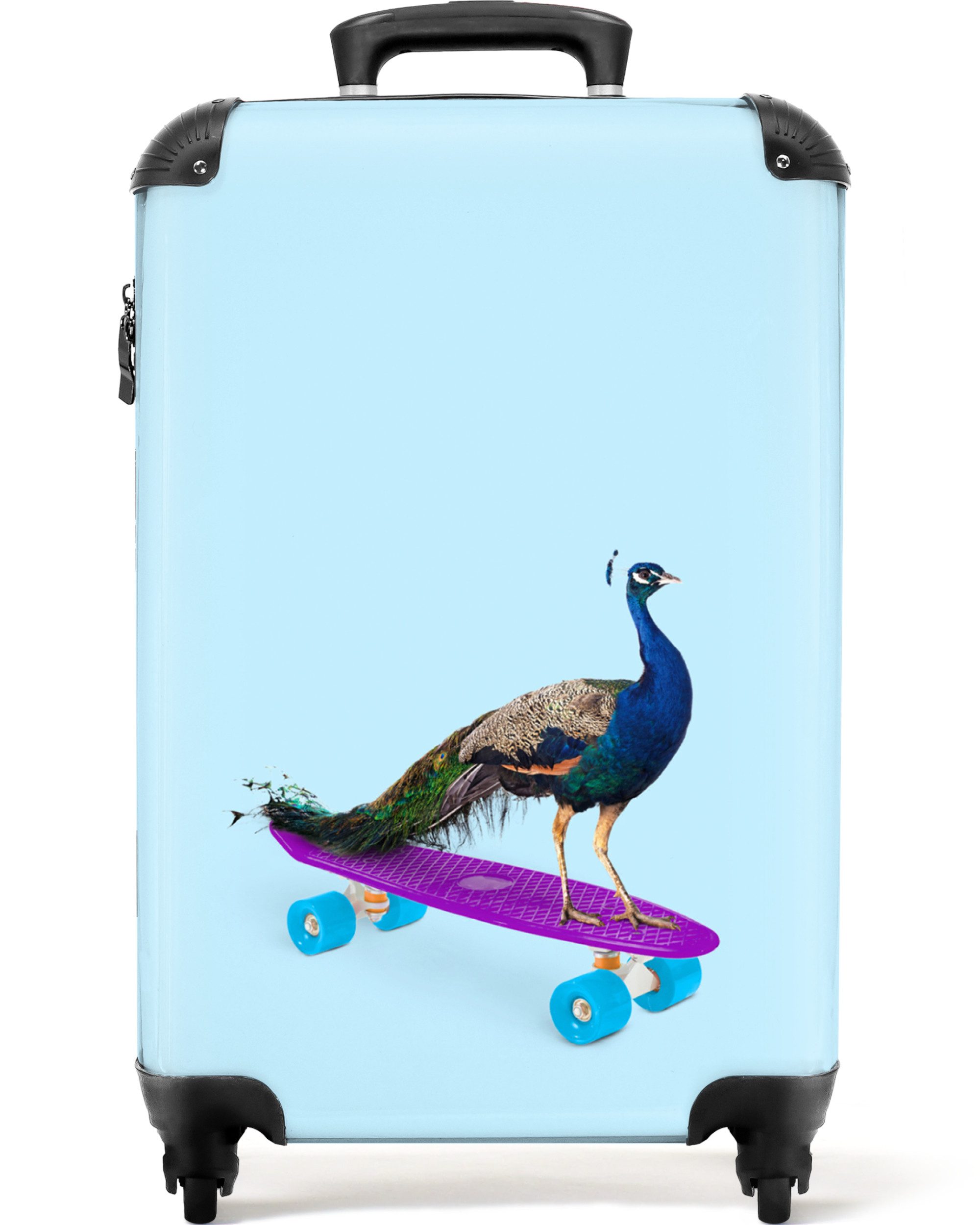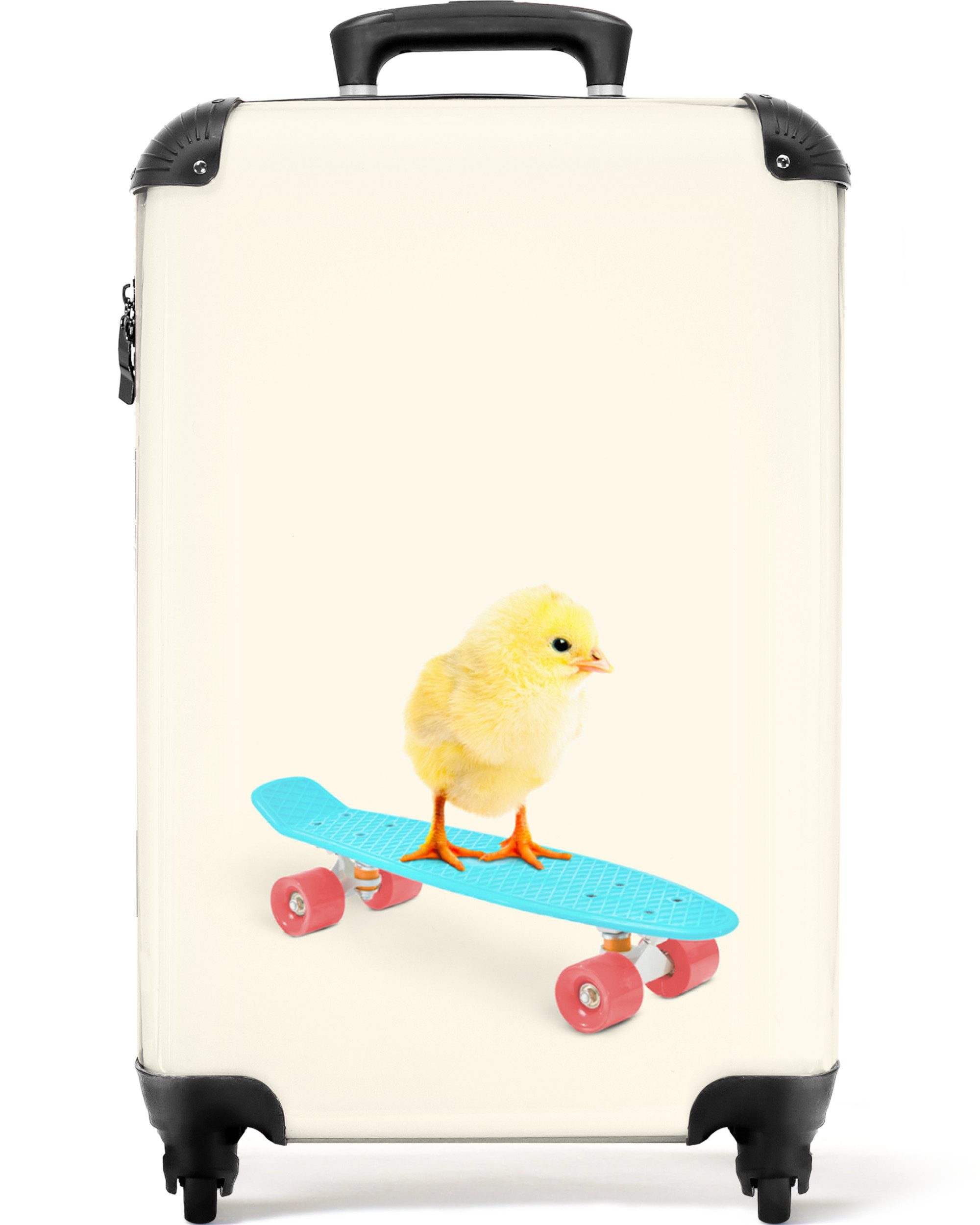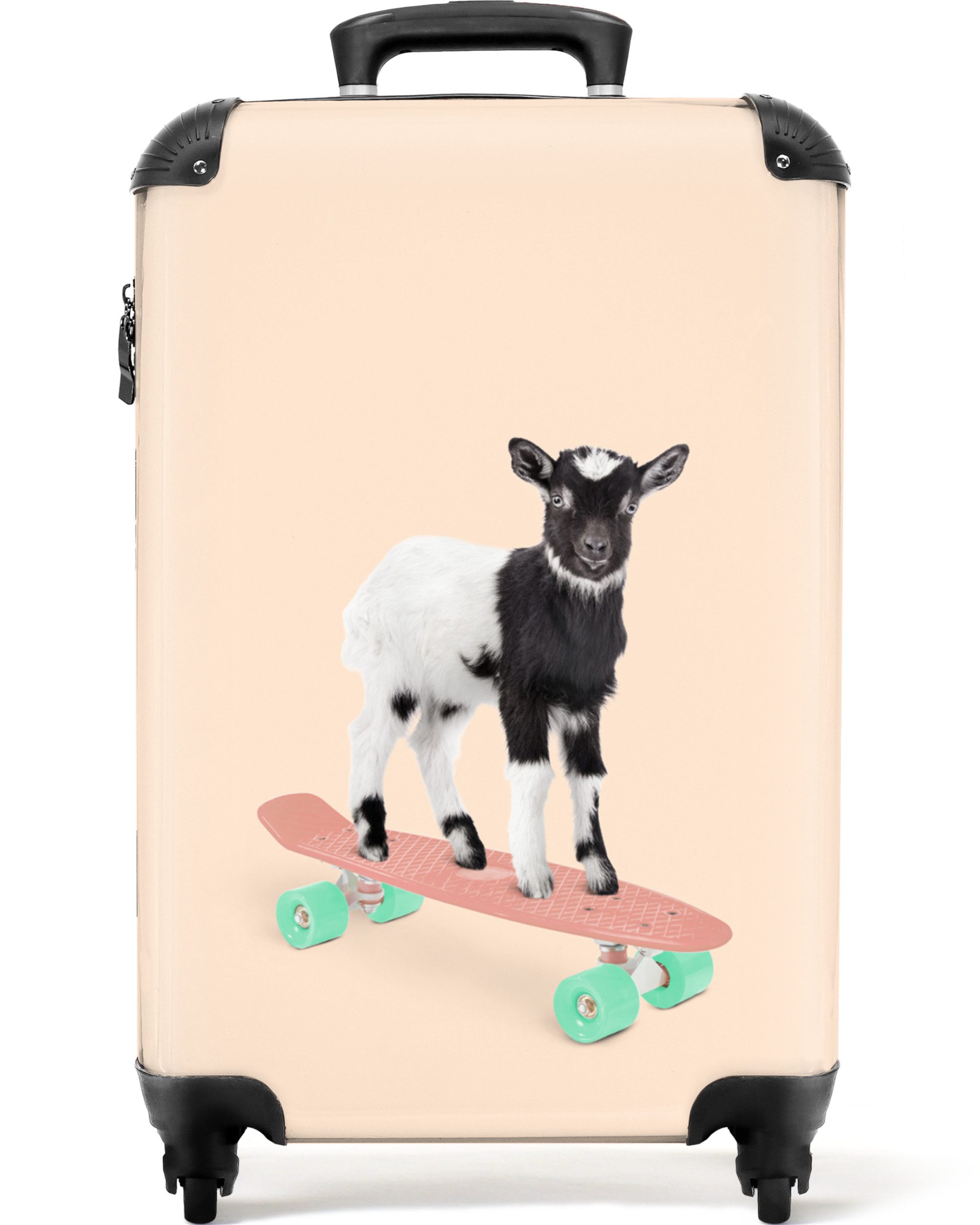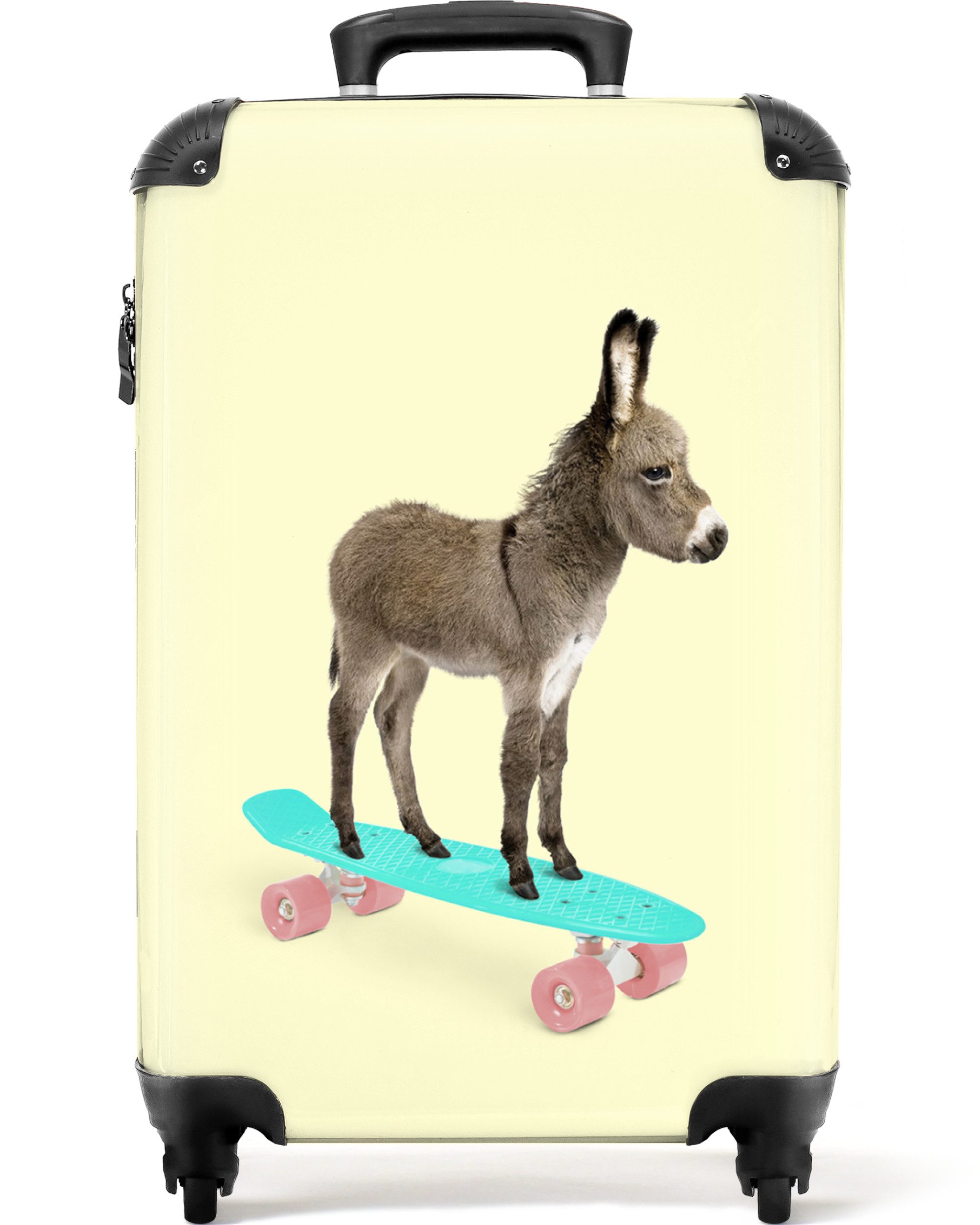 Sind Sie noch auf der Suche nach einem Kinderkoffer? Dann ist dies genau das Richtige für Sie! Die Fototasche zeigt ein Schweinchen auf einem blauen Skateboard mit rosa Rädern.