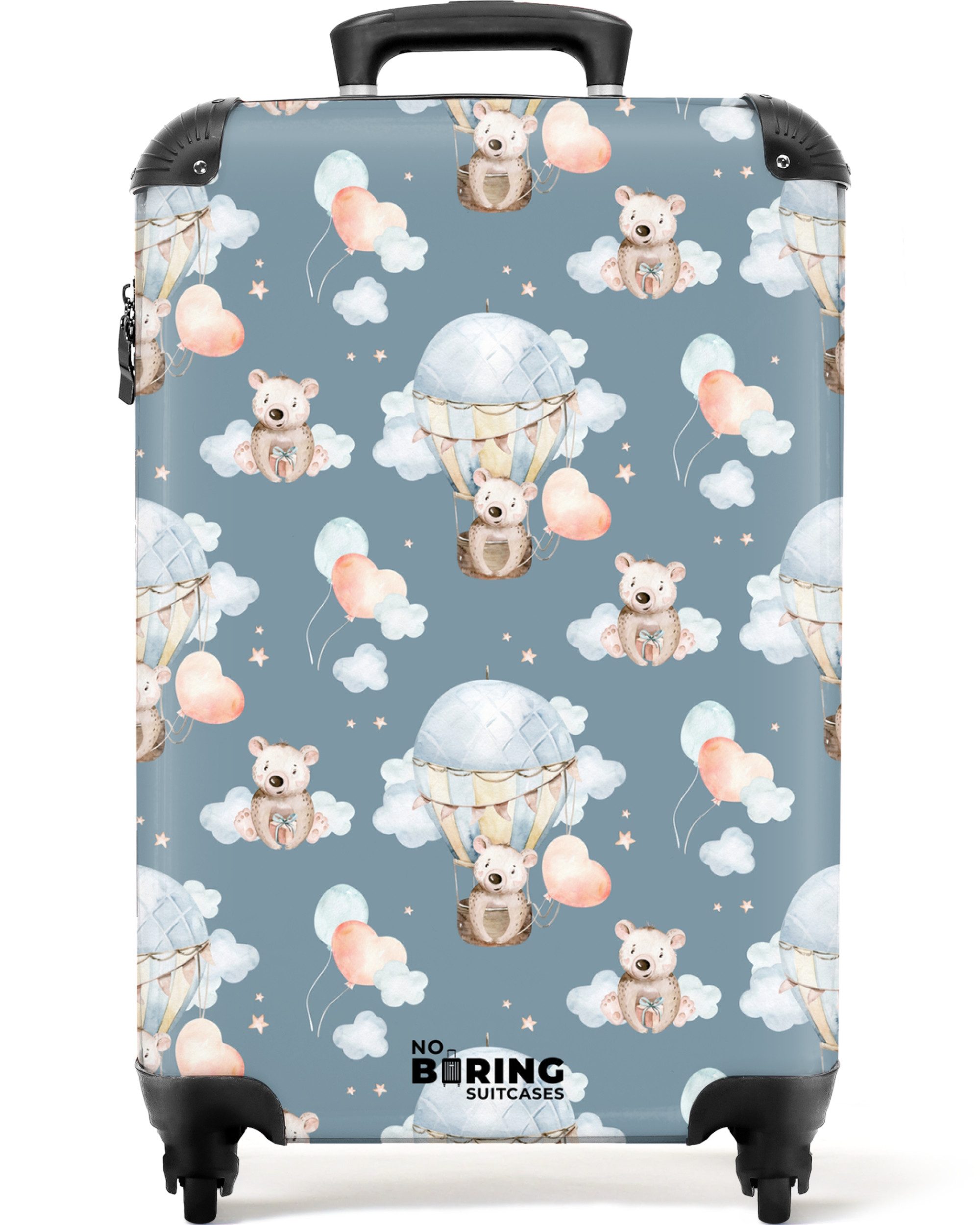 Muster von süßen Teddybären in Heißluftballons und auf Wolken, umgeben von herzförmigen und runden Ballons. Der Hintergrund ist blau mit kleinen Sternen.Optik | bedruckt |