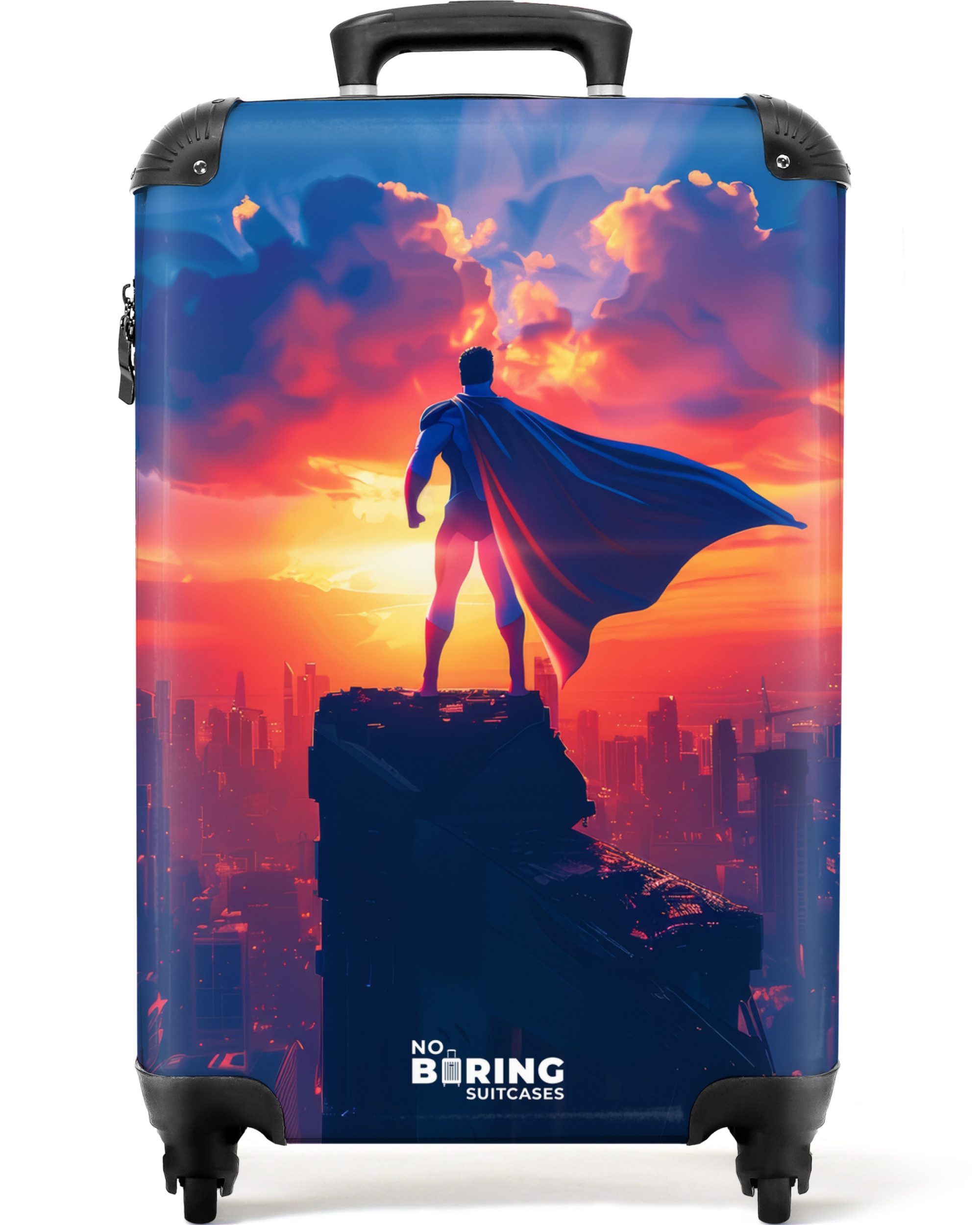 Ein imposanter Superheld steht auf einem hohen Wolkenkratzer mit flatterndem Umhang. Die Stadt wird von einem dramatischen Sonnenuntergang beleuchtet, der eine epische, heldenhafte Atmosphäre schafft.Optik | bedruckt |