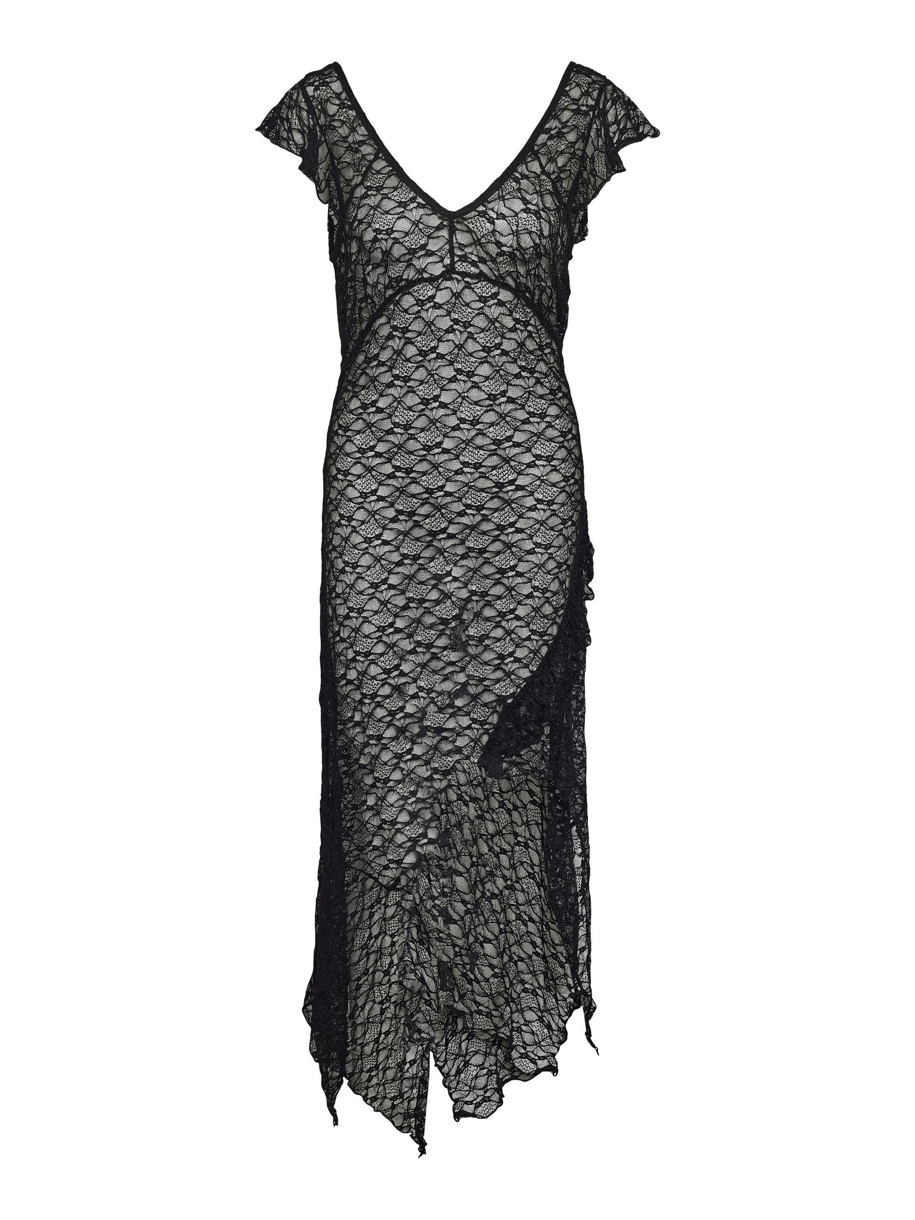 Dieses stilvolle Kleid ist aus feiner Spitze gefertigt und bietet einen charmanten V-Ausschnitt, sowohl vorne als auch hinten.
