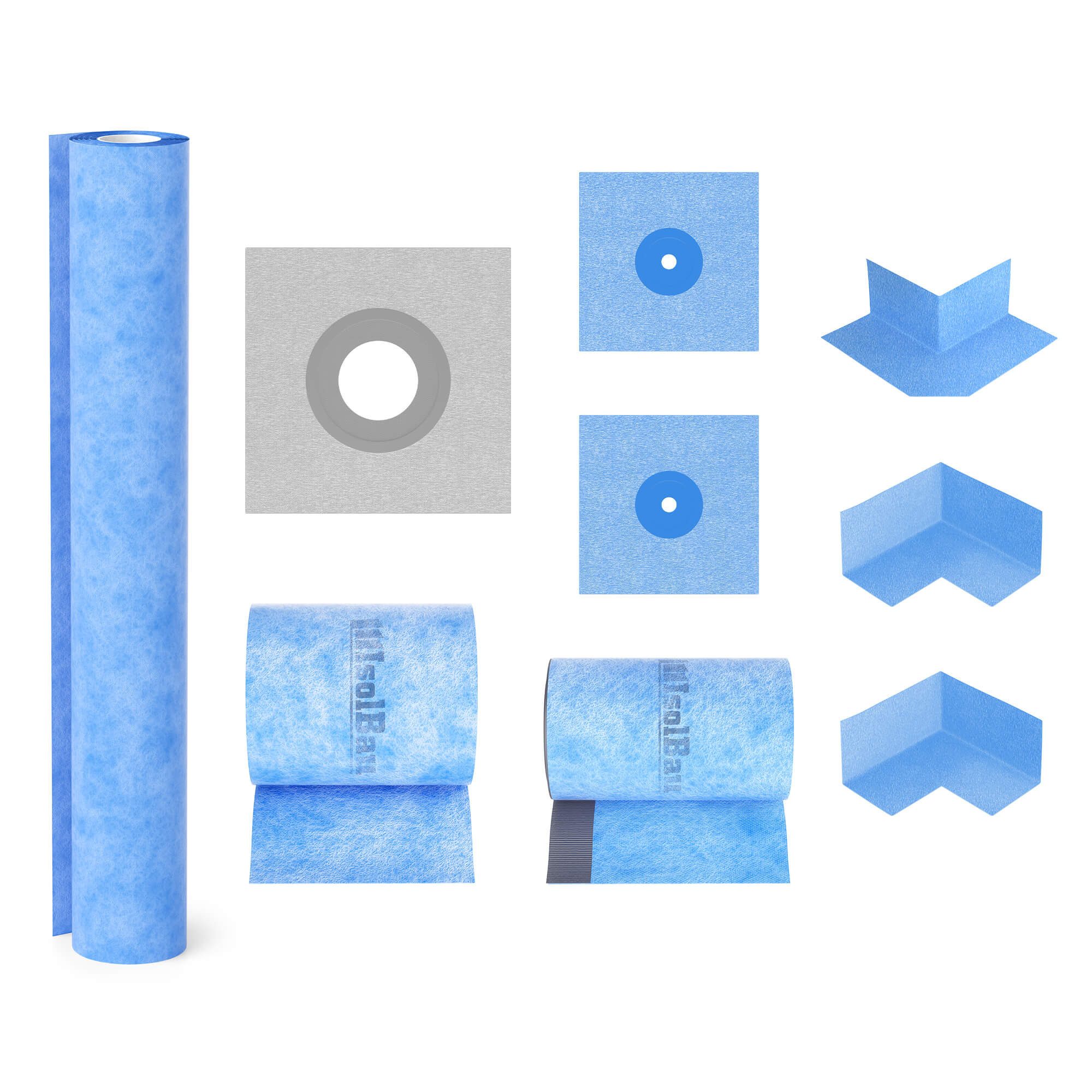 IsolBau Profi Abdichtung Set enthält eine Zusammenstellung von optimal aufeinander abgestimmten Produkten: Dichtband, Innenecken, Außenecken, Dichtbahn, Wannenband