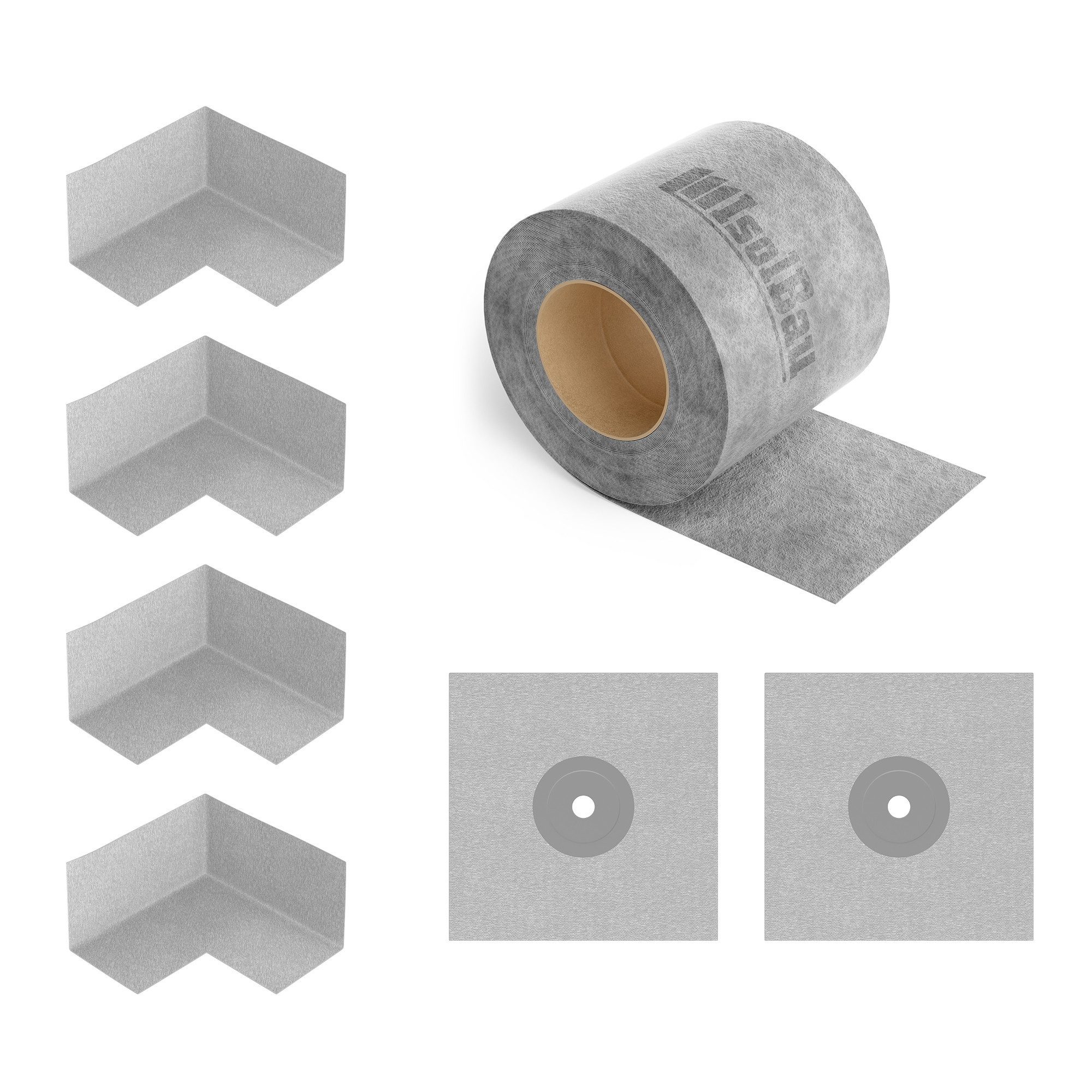 IsolBau Profi Abdichtung Set enthält eine Zusammenstellung von optimal aufeinander abgestimmten Produkten: Dichtband, Innenecken und Wandmanschetten.
