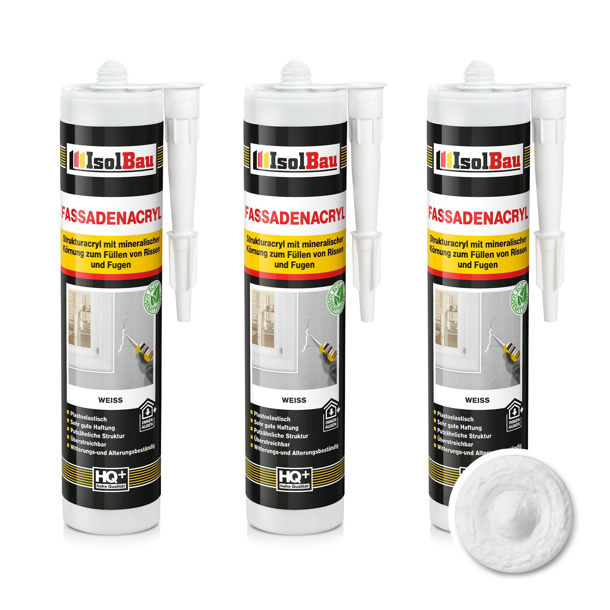 IsolBau Fassadenacryl ist eine gebrauchsfertige, plastoelastische, einkomponentige Acryl Dichtmasse mit mineralischer Körnung. Nach Durchhärtung hat eine putzähnliche Struktur. Der Acryl-Dichtstoff ist anstrichverträglich, überstreichbar und überlackierbar. Haftet ohne Voranstrich auf allen Baumaterialien, auch auf feuchten Untergründen. Ideal zum Füllen von Rissen und Fugen im Innen- und Außenbereich an Putz, Beton, Gasbeton, Gipskarton, Faserzement, Stein und Holz. Aufgrund der putzähnlichen körnigen Struktur lassen sich Risse in Fassaden hervorragend kaschieren.