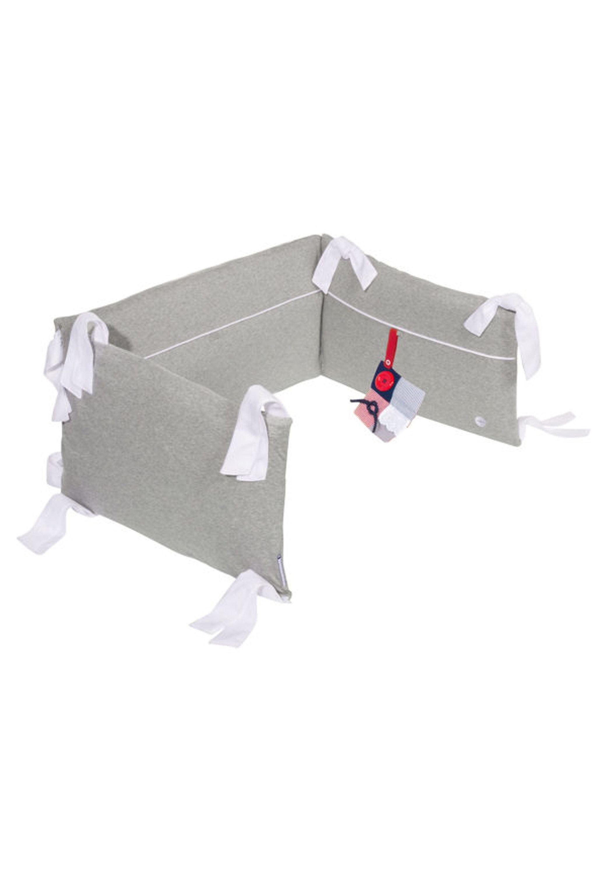 Schlaufen an den inneren Seitenteilen ermöglichen das Anbringen von Spielzeug. So hat das Baby etwas zum Anschauen oder Spielen. Die Bänder bestehen aus weißem Baumwollsatin und können aufgrund ihrer Festigkeit sehr gut an das Bett geknotet werden.