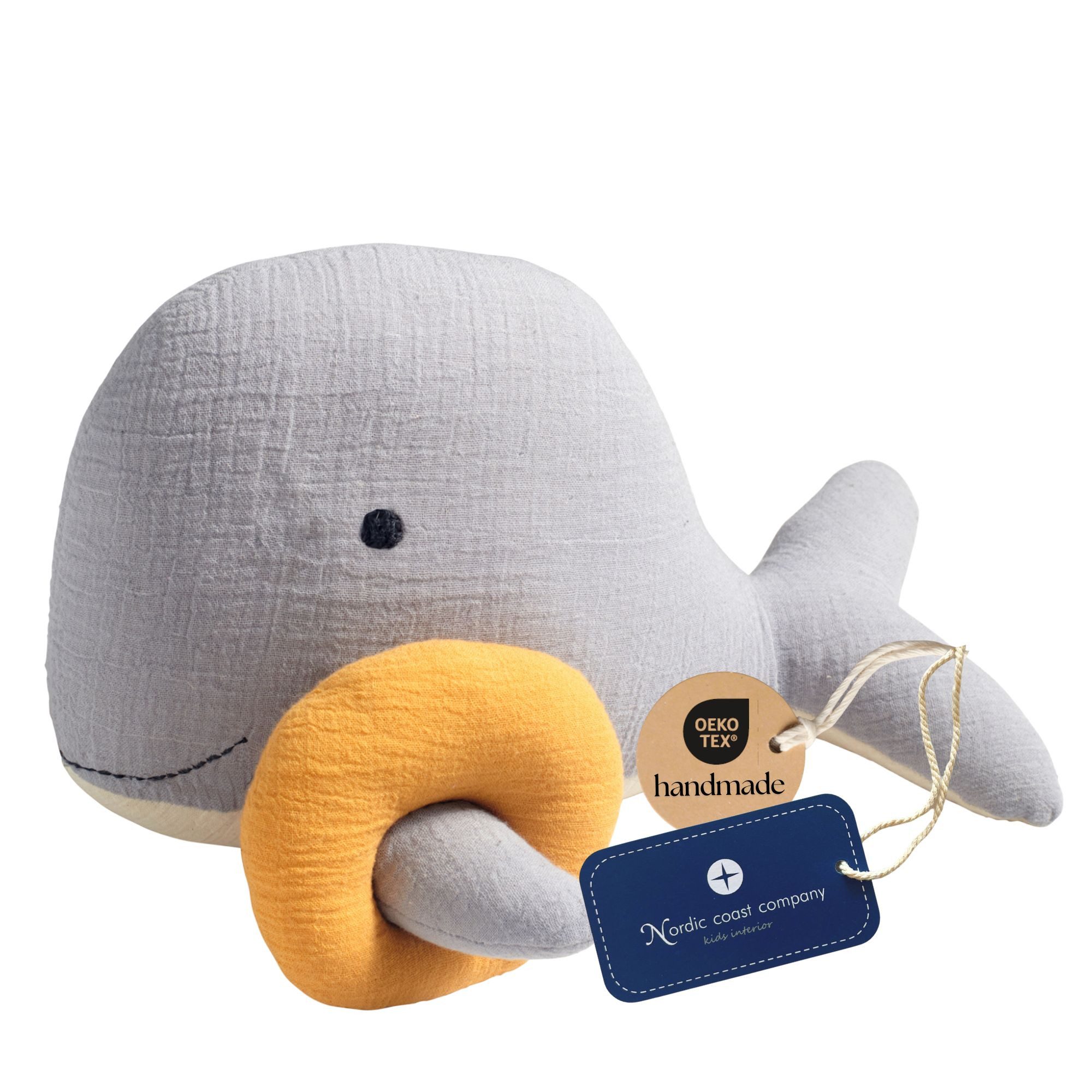 Kuscheltier Wal Bobby Das niedliche Kuscheltier wird schon bald zum Lieblingskuscheltier deines Babys und gleichzeitig zum originellen Hingucker im Kinderzimmer. Die praktische Размер macht das Kuscheltier zu einem richtigen Beschützer und sorgt beim Kuscheln für besonders viel Nestwärme. Die kleinen Flossen und der rundliche Körper des Kuschelwals lassen sich perfekt von Säuglingen greifen und laden so zum Kuscheln und Spielen ein. Kuscheltiere geben Kindern schon von Geburt an Halt und Geborgenheit. Meistens entwickeln Kinder auch schon im ersten Lebensjahr eine enge Beziehung zu ihrem Lieblingskuscheltier. Sie nehmen es in jeder Situation mit und können ohne den treuen Begleiter nicht einschlafen. Bitte beachte jedoch, dass die Kuscheltiere aus Sicherheitsgründen aus dem Bettchen der Neugeborenen fernbleiben sollten, während die Kleinen schlafen. Der weiche Musselinstoff aus 100% zertifizierter Baumwolle macht das Stofftier kuschelig weich und qualitativ besonders hochwertig. Sollte das Kuscheltier doch mal schmutzig werden, ist es einfach bei 30 Grad waschbar. Im Handwaschprogramm und geschützt durch ein Wäschenetz behält es seine Form und sieht auch nach mehrmaligem Waschen aus wie neu. Der Kuschelwal ist außerdem mit zertifiziertem Polyester Vlies gefüttert. Damit ist er nicht nur antiallergen, sondern auch atmungsaktiv und besonders für Babys und Kleinkinder geeignet. Anders als bei normalen Baumwollfüllungen, verklumpt diese beim Waschen nicht und hält ebenfalls keine Gerüche. Das Kuscheltier eignet sich bereits ab der Geburt und wird schon bald zum kuscheligen besten Freund deines Babys. Dadurch eignet es sich auch hervorragend als Geschenk zur Geburt, zur Baby Shower Party oder zur Taufe. Größe: ca. 33 cm