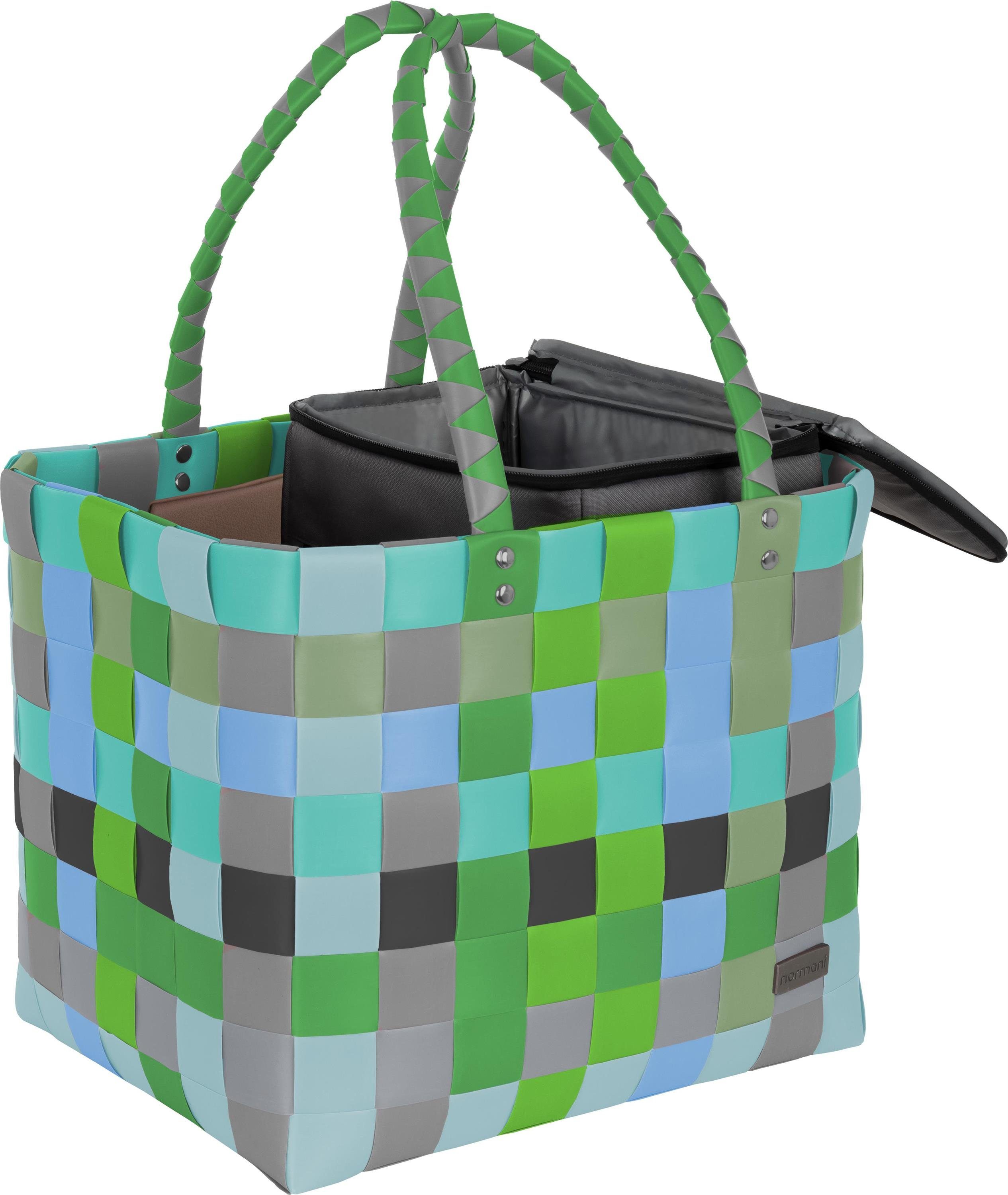 Die Kühltasche besteht aus leichtem und stark isolierenden Material bietet die perfekte Voraussetzung für gut gekühlte Snacks und Getränke. Beim Einkaufen kann in der Kühltasche Tiefgekühltes gelagert werden und die andere Hälfte des Korbes für den restlichen Einkauf genutzt werden. Der Flechtkorb ist aus 70% und die Kühltasche aus 100% recyceltem Material somit sind die Taschen nicht nur umweltfreundlich, sondern tragen auch dazu bei, den ökologischen Fußabdruck zu verringern.