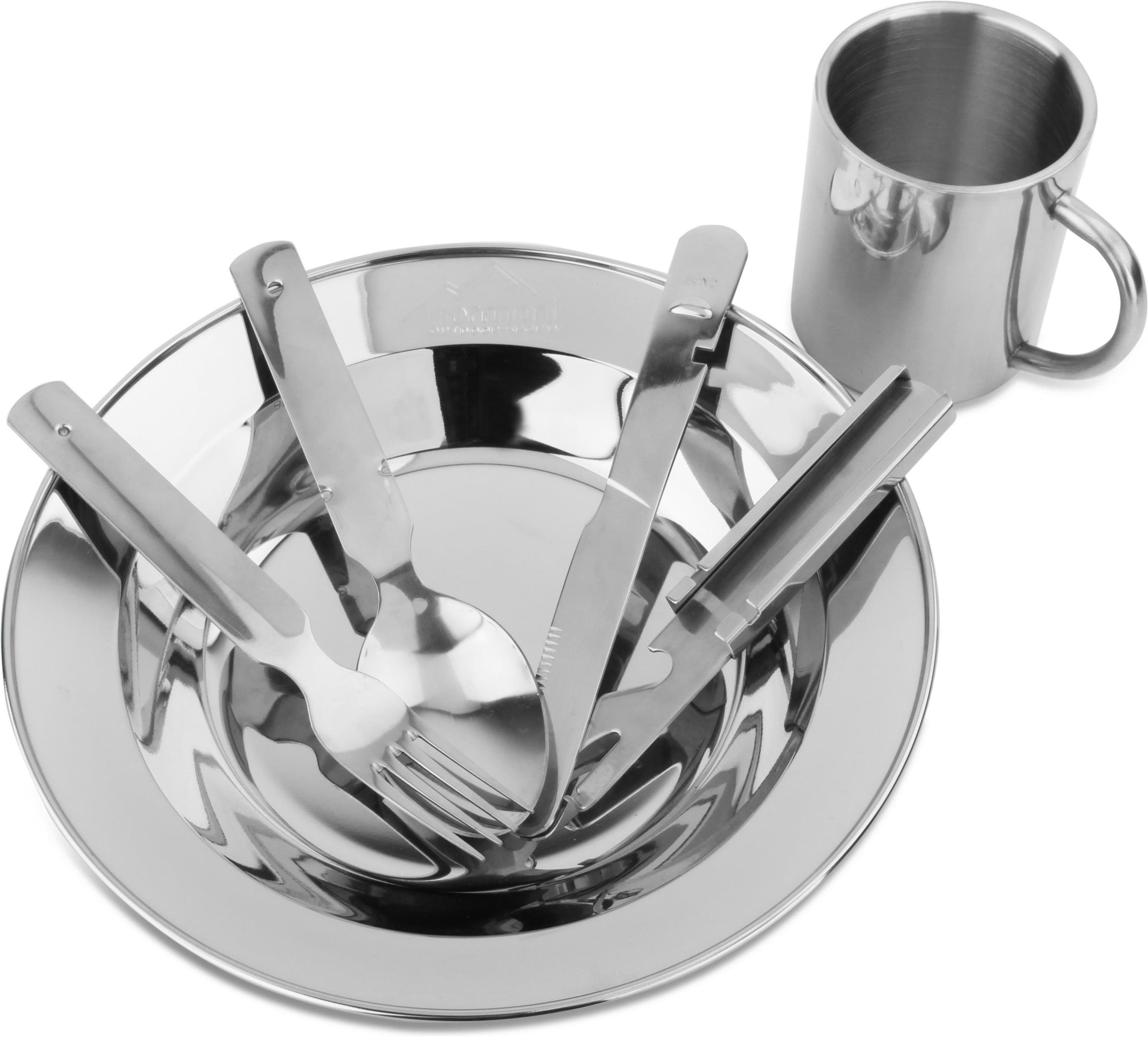 Das glänzend polierte Camping-Geschirrset aus rostfreiem 430 Edelstahl kommt mit kompaktem Bund Besteckset nach TL, Thermotasse und Suppenteller und ist die perfekte Outdoor-Grundausstattung für 1 Person: Bruchsicher, leicht, hitzebeständig und spülmaschinenfest. Absolut praktisch ist das 4-teilige Bundeswehr Essbesteck aus rostfreiem 430 Edelstahl - ausgeführt als platzsparend ineinander gestecktes Set. Es passt in jede kleine Seitentasche Ihres Trekking-Rucksacks und ist somit stets schnell zur Hand. In der Führungsschiene am Dosen-/Flaschenöffner-Griff werden Messer, Gabel, Löffel genau in der genannten Reihenfolge platzsparend zusammengeschoben. Das Messer ist nachschärfbar und die Gabelzinken laufen spitz zu. Der effiziente Dosenöffner ist scharfkantig genug, um mit stetigen Hebelbewegungen den Konservendeckel rundherum aufzuschneiden. Die doppelwandige 250 ml Edelstahl Outdoor Tasse hält Ihren Tee oder Kaffe länger heiß. Da rostfreier Edelstahl säureresistent ist, können auch Fruchtsäfte eingeschenkt werden. Zudem lassen sich Farbrückstände von Schwarztee oder Kaffee mühelos mit warmen Wasser lösen. So glänzt der Thermobecher auch innen schnell wieder wie neu. Der robuste Edelstahl-Suppenteller von normani OUTDOOR SPORTS® verfügt über einen breiten Rand und lässt sich somit gut greifen, auch wenn er bis zum Rand mit dampfend-heißer Suppe gefüllt ist. Natürlich ist auf dem unzerbrechlichen, tiefen Teller mit 23 cm Durchmesser auch genügend Platz für Nudeln mit reichlich Soße. Das rostfreie Material ist spülmaschinenfest. Der hitzebeständige Edelstahlteller darf auch auf die Kocherflamme gestellt werden, falls das Essen noch einmal kurz erhitzt werden muss.