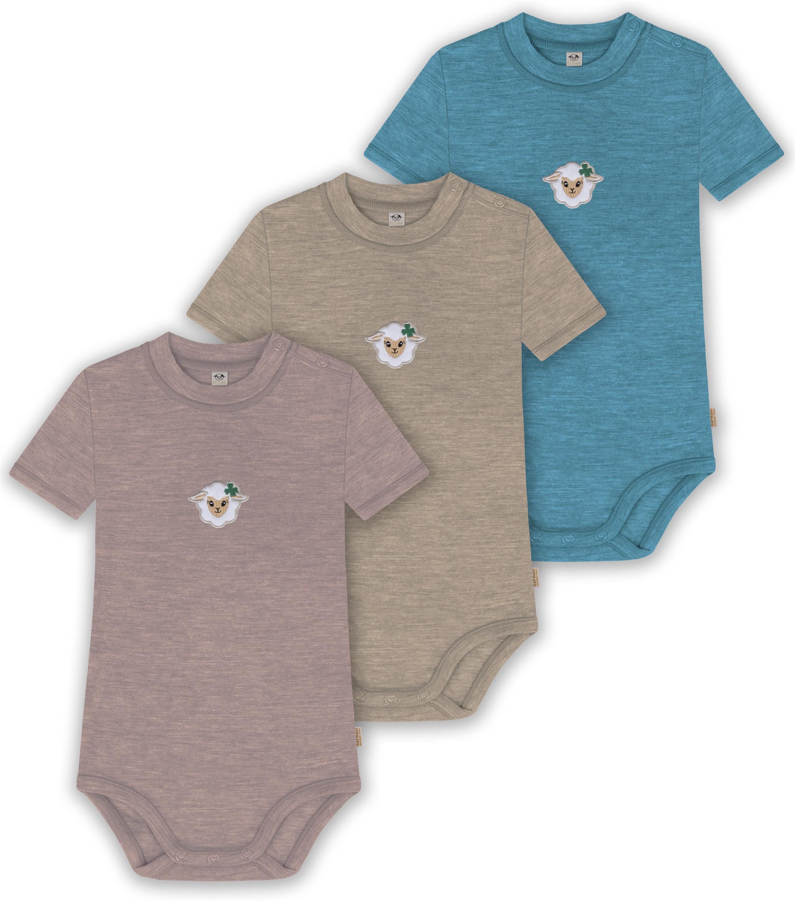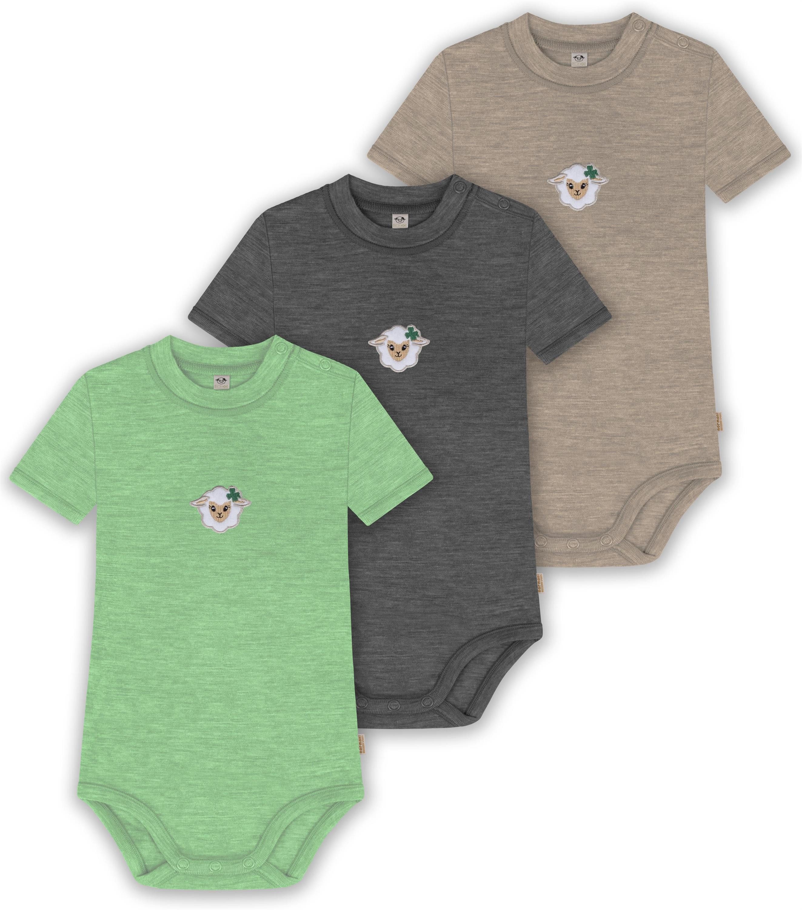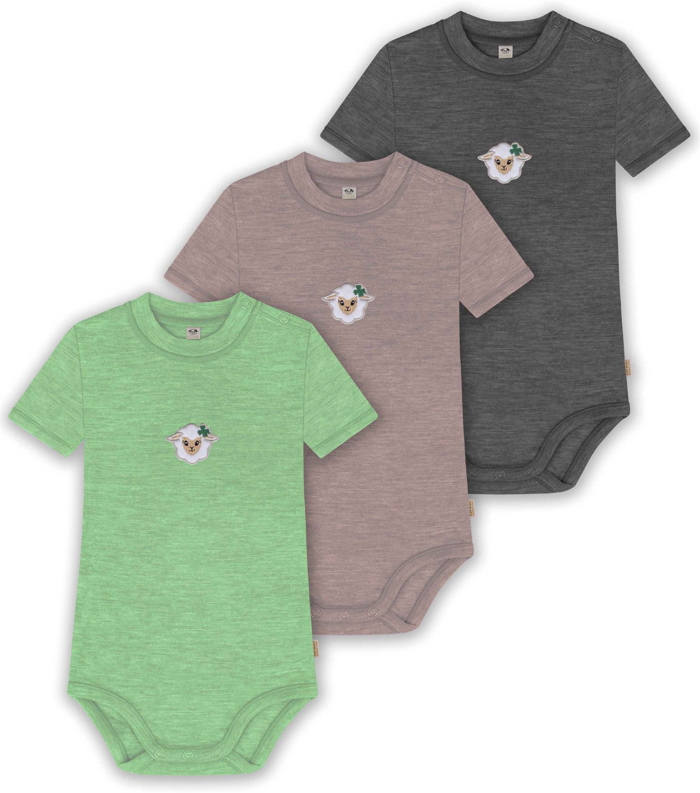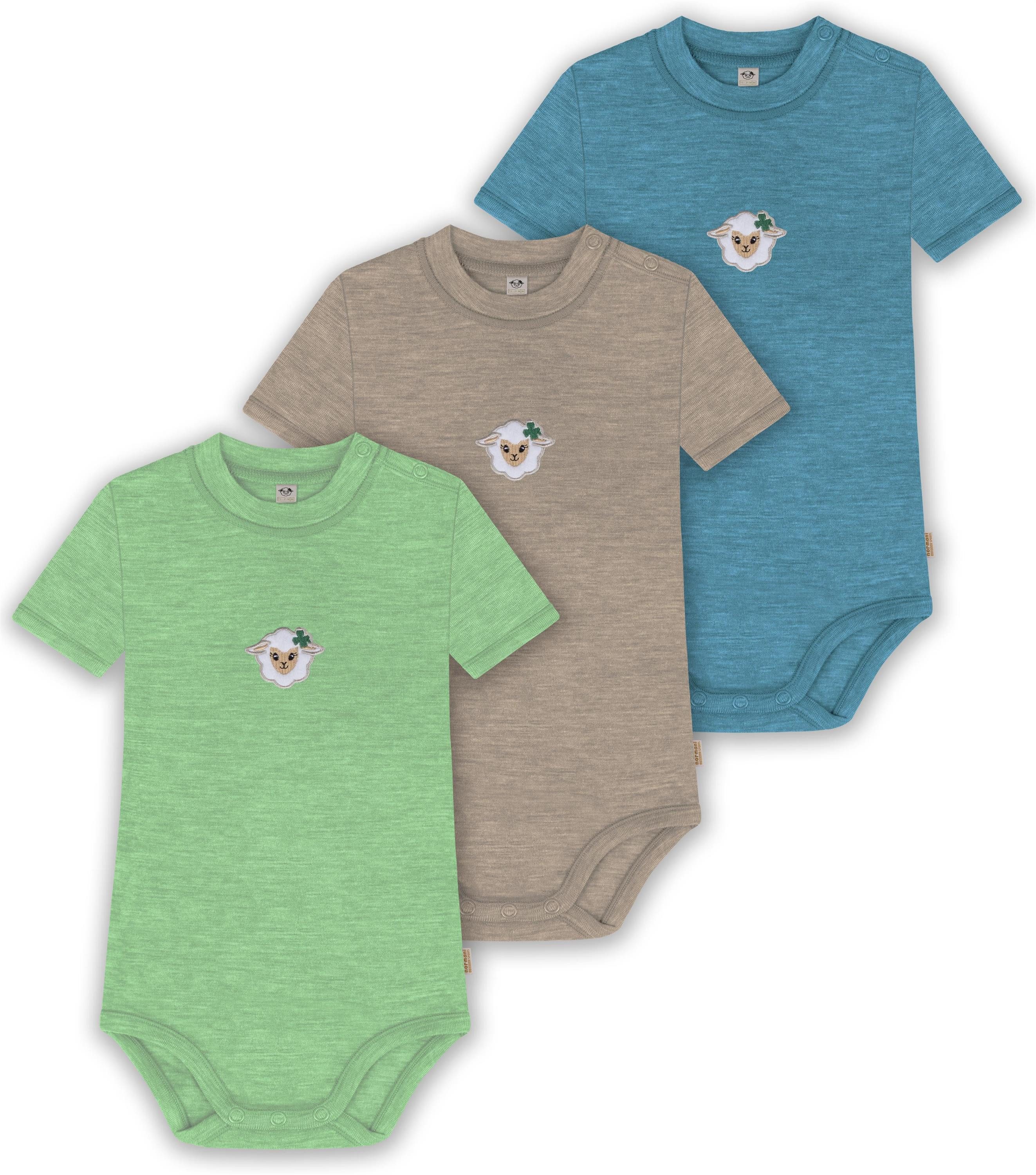 Unser Merino Kurzarm Body "Tihoi", im 3er Pack, ist mehr als nur ein einfacher Baby Body mit kurzen Ärmeln. Hinter seiner schlichten Erscheinung verbirgt sich ein Kleidungsstück, das sich perfekt für alle Wetterbedingungen eignet. Mit einer Grammatur von 200 g/m² bietet dieser Body eine optimale Wärmeisolierung, die ihn im Winter zur idealen wärmenden Schicht unter weiterer Kleidung macht. Auch im Sommer kann der Body wegen seiner natürlichen Thermoregulierung einzeln getragen werden. Die Wärmeregulierung und Atmungsaktivität der Merinowolle ermöglichen es Ihrem Baby, den Body den ganzen Tag über zu tragen – sei es beim Spielen oder beim Nickerchen. Die weiche Merinowolle ist besonders sanft zur empfindlichen Haut Ihres Babys und verursacht keine Hautirritationen. Zudem ist die Merinofaser geruchsneutralisierend, sodass der Body auch nach mehrmaligem Tragen frisch bleibt. Die Elastizität der Merinowolle sorgt für maximale Bewegungsfreiheit beim Spielen. Darüber hinaus ist der Body mit hochwertigen Marken-Druckknöpfen von YKK an den Schultern und zwischen den Beinen ausgestattet. Diese gewährleisten ein zuverlässiges Öffnen und Спрятать und erleichtern das Wickeln und Umziehen. Abgerundet wurde der Body mit einem kindgerechtem, flauschigem Schaf Stick, der als Eyecatcher dient.