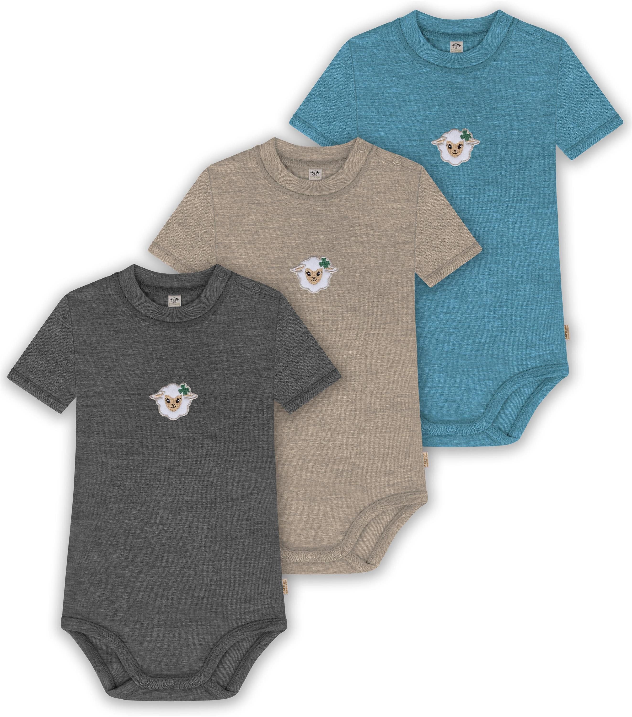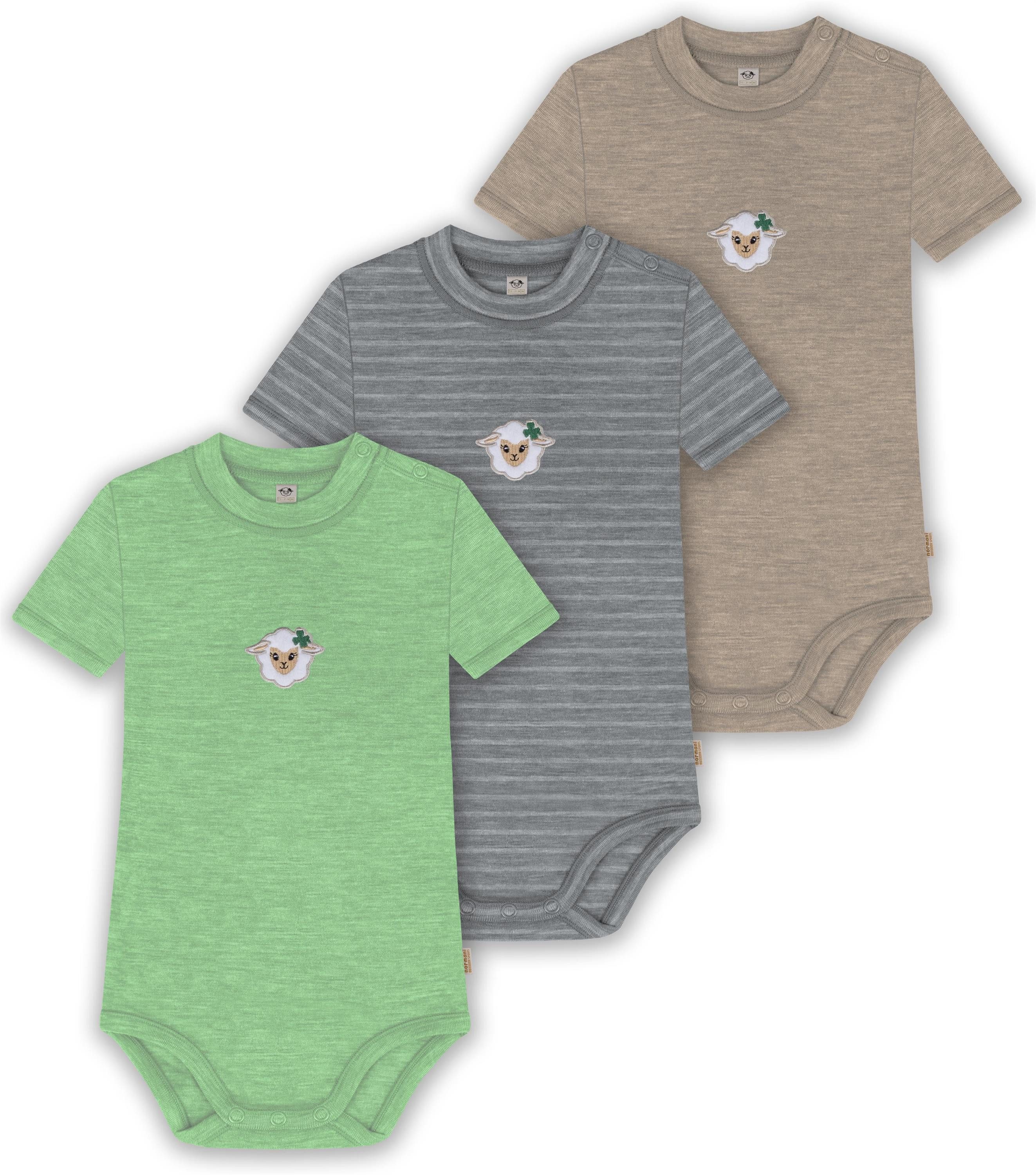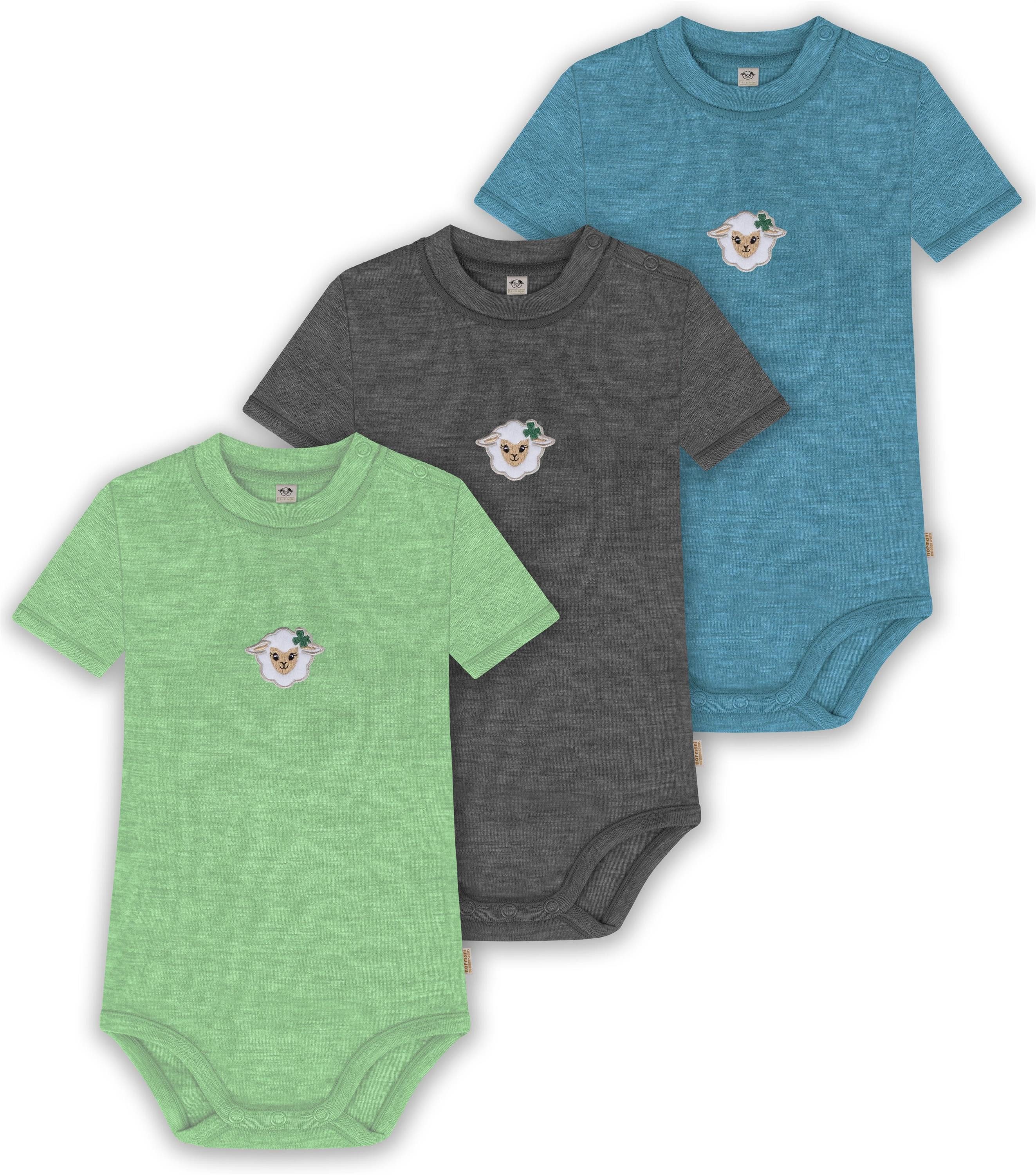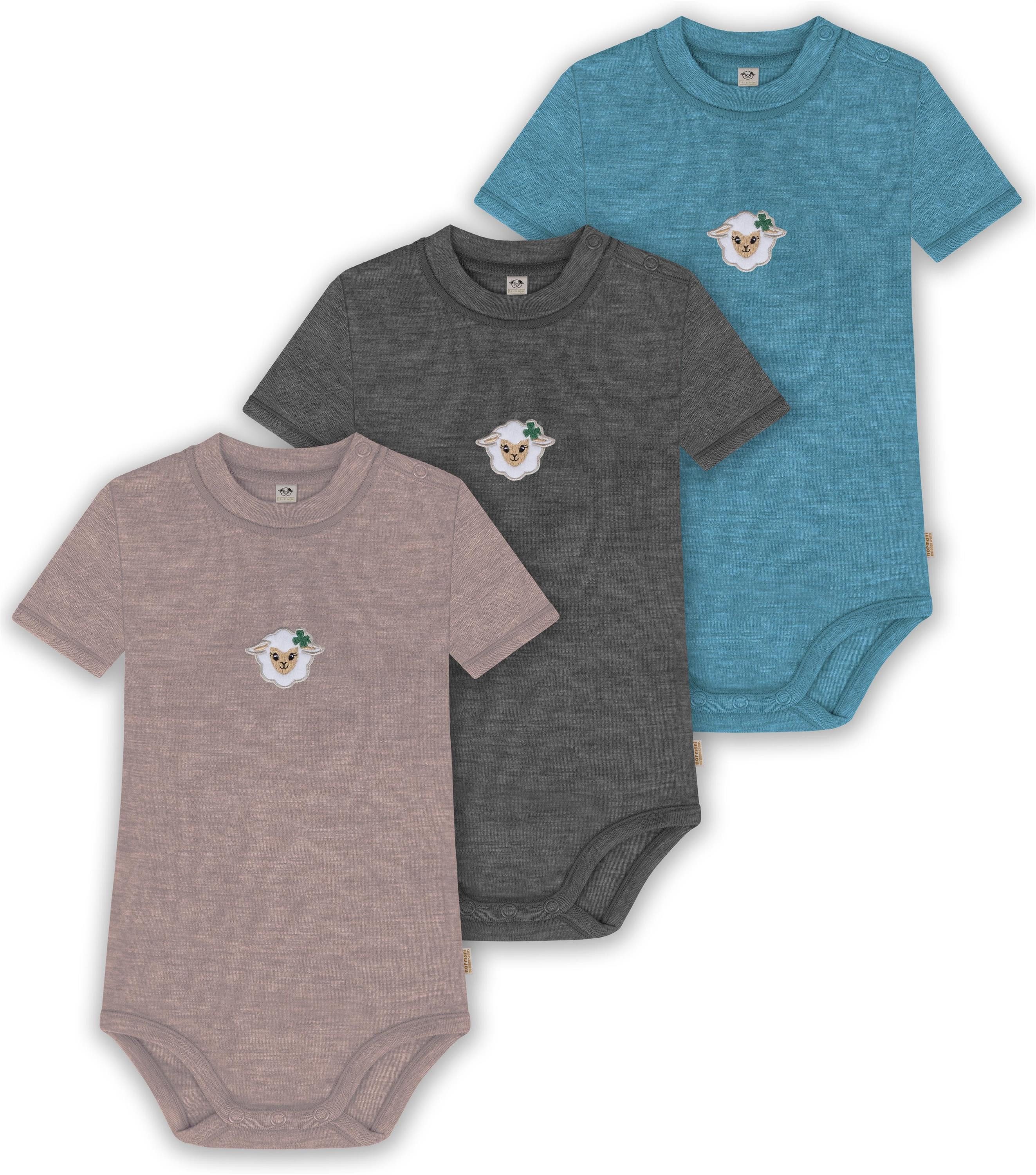 Unser Merino Kurzarm Body "Tihoi", im 3er Pack, ist mehr als nur ein einfacher Baby Body mit kurzen Ärmeln. Hinter seiner schlichten Erscheinung verbirgt sich ein Kleidungsstück, das sich perfekt für alle Wetterbedingungen eignet. Mit einer Grammatur von 200 g/m² bietet dieser Body eine optimale Wärmeisolierung, die ihn im Winter zur idealen wärmenden Schicht unter weiterer Kleidung macht. Auch im Sommer kann der Body wegen seiner natürlichen Thermoregulierung einzeln getragen werden. Die Wärmeregulierung und Atmungsaktivität der Merinowolle ermöglichen es Ihrem Baby, den Body den ganzen Tag über zu tragen – sei es beim Spielen oder beim Nickerchen. Die weiche Merinowolle ist besonders sanft zur empfindlichen Haut Ihres Babys und verursacht keine Hautirritationen. Zudem ist die Merinofaser geruchsneutralisierend, sodass der Body auch nach mehrmaligem Tragen frisch bleibt. Die Elastizität der Merinowolle sorgt für maximale Bewegungsfreiheit beim Spielen. Darüber hinaus ist der Body mit hochwertigen Marken-Druckknöpfen von YKK an den Schultern und zwischen den Beinen ausgestattet. Diese gewährleisten ein zuverlässiges Öffnen und Спрятать und erleichtern das Wickeln und Umziehen. Abgerundet wurde der Body mit einem kindgerechtem, flauschigem Schaf Stick, der als Eyecatcher dient.