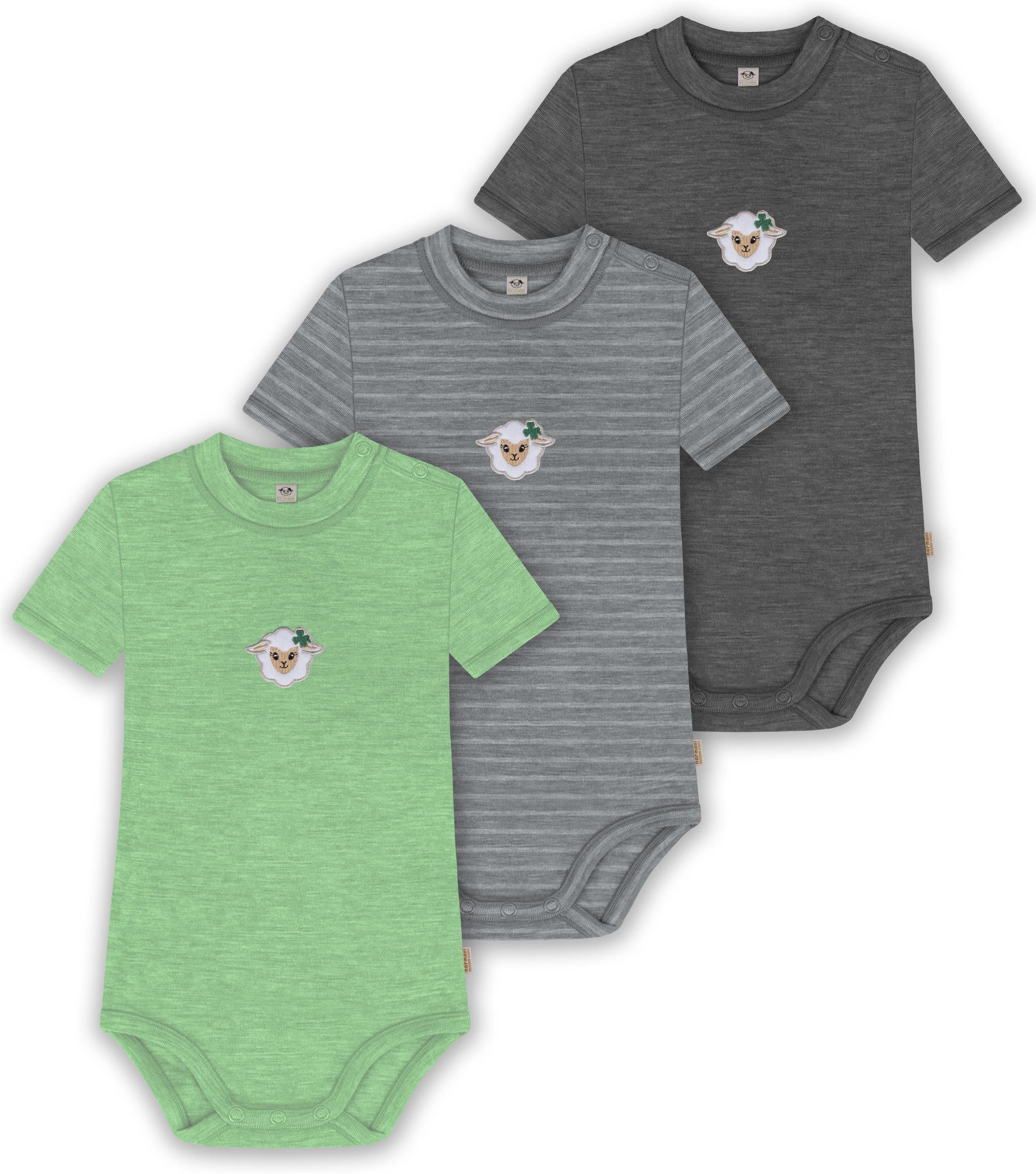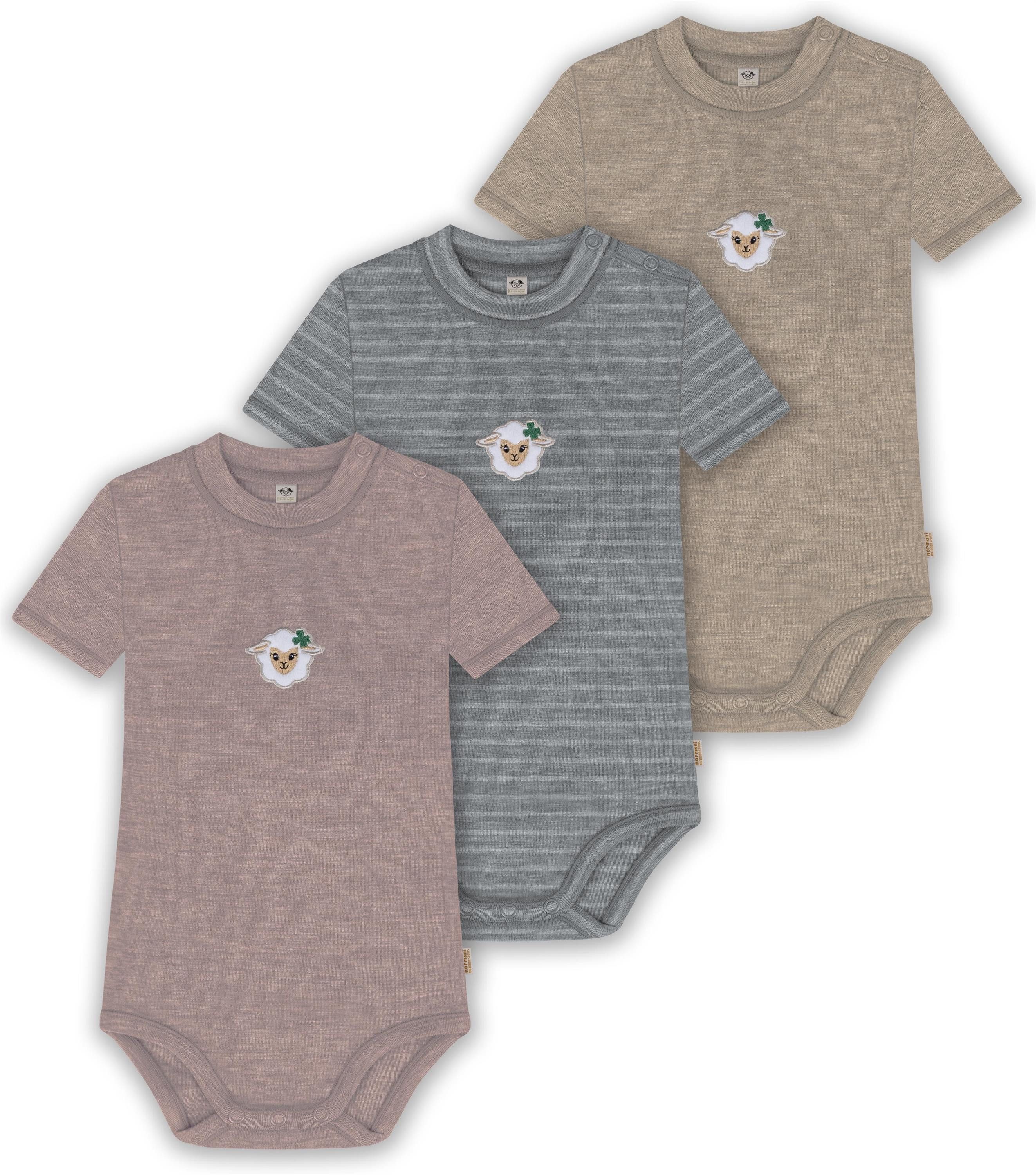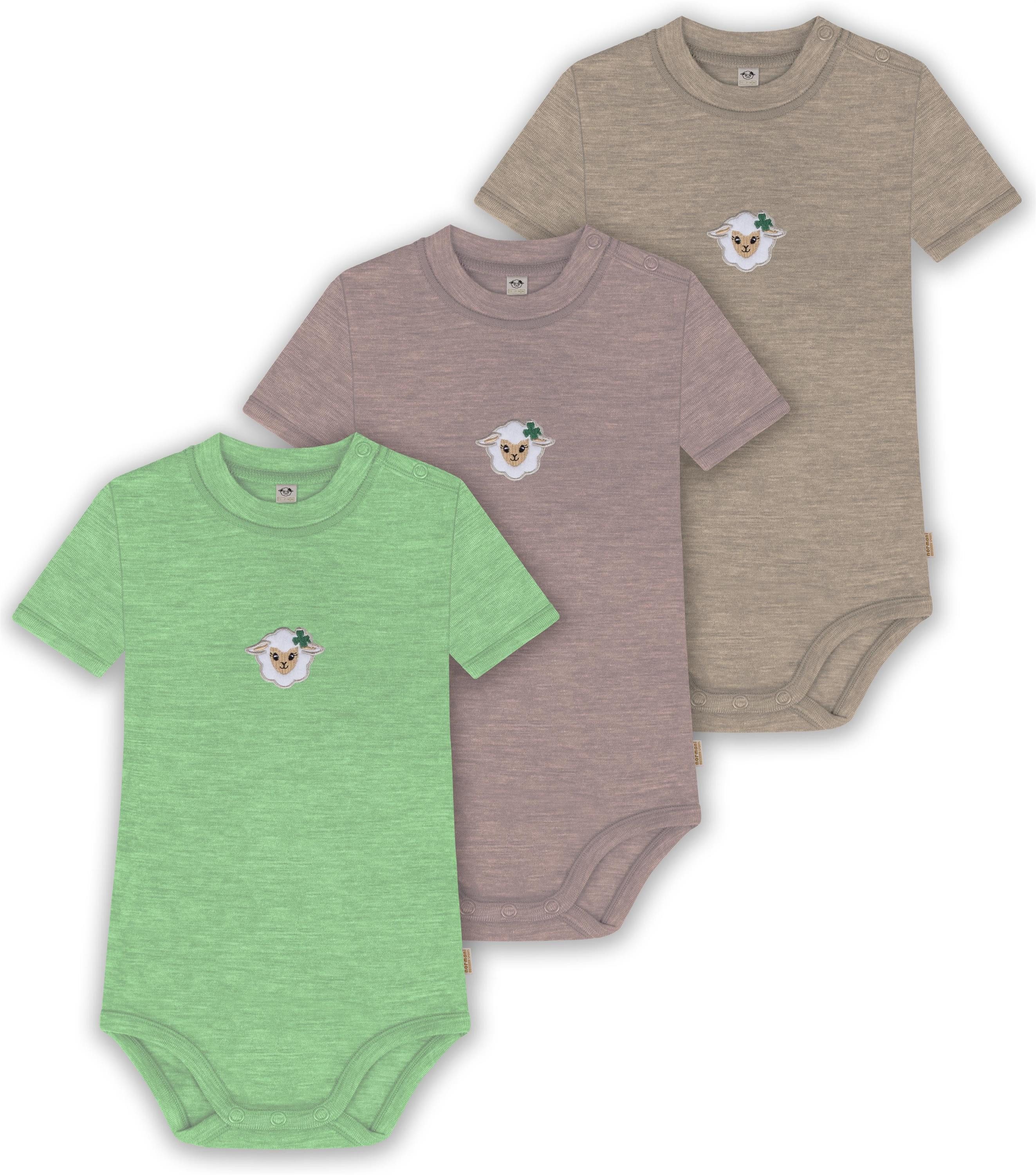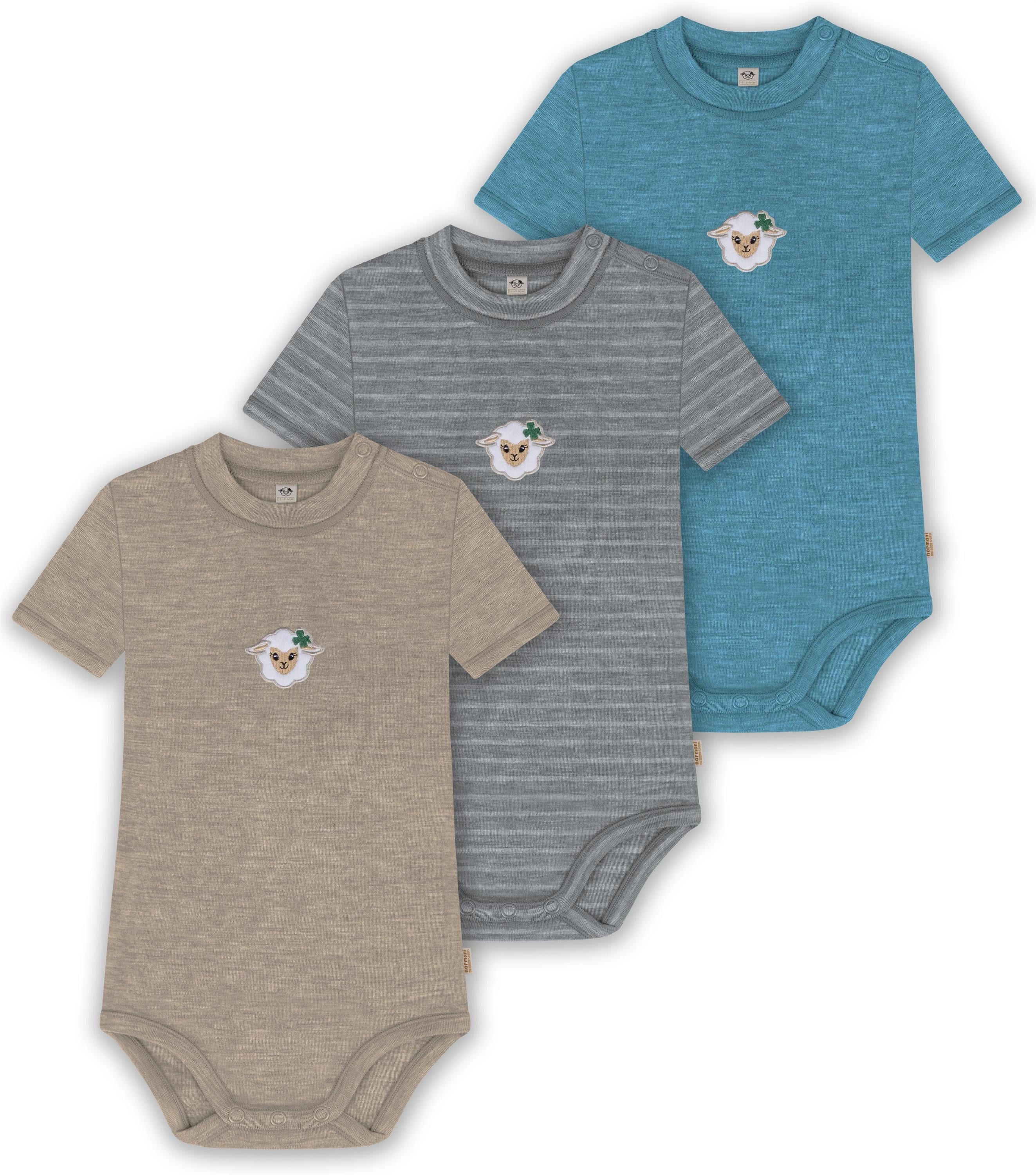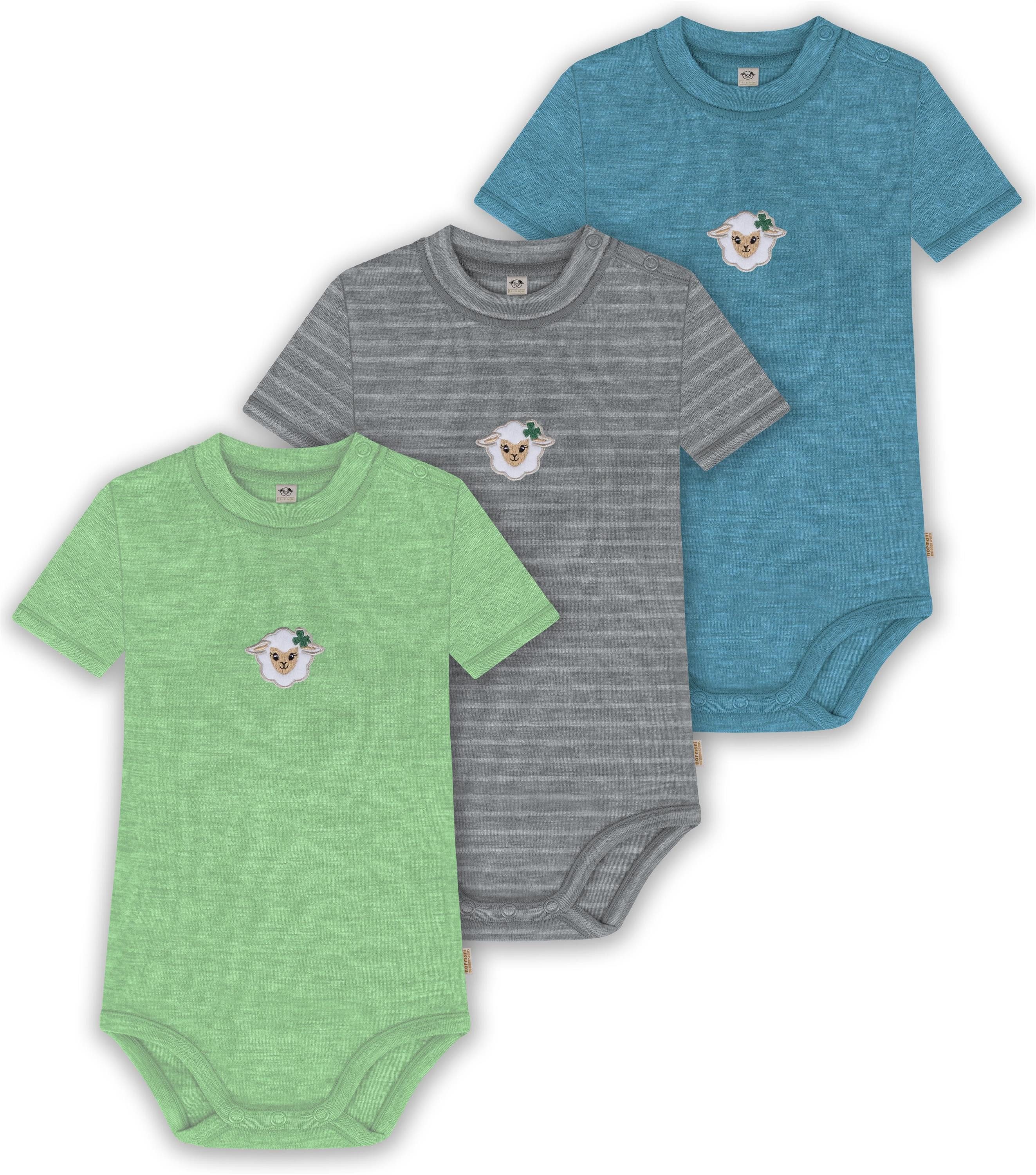 Unser Merino Kurzarm Body "Tihoi", im 3er Pack, ist mehr als nur ein einfacher Baby Body mit kurzen Ärmeln. Hinter seiner schlichten Erscheinung verbirgt sich ein Kleidungsstück, das sich perfekt für alle Wetterbedingungen eignet. Mit einer Grammatur von 200 g/m² bietet dieser Body eine optimale Wärmeisolierung, die ihn im Winter zur idealen wärmenden Schicht unter weiterer Kleidung macht. Auch im Sommer kann der Body wegen seiner natürlichen Thermoregulierung einzeln getragen werden. Die Wärmeregulierung und Atmungsaktivität der Merinowolle ermöglichen es Ihrem Baby, den Body den ganzen Tag über zu tragen – sei es beim Spielen oder beim Nickerchen. Die weiche Merinowolle ist besonders sanft zur empfindlichen Haut Ihres Babys und verursacht keine Hautirritationen. Zudem ist die Merinofaser geruchsneutralisierend, sodass der Body auch nach mehrmaligem Tragen frisch bleibt. Die Elastizität der Merinowolle sorgt für maximale Bewegungsfreiheit beim Spielen. Darüber hinaus ist der Body mit hochwertigen Marken-Druckknöpfen von YKK an den Schultern und zwischen den Beinen ausgestattet. Diese gewährleisten ein zuverlässiges Öffnen und Спрятать und erleichtern das Wickeln und Umziehen. Abgerundet wurde der Body mit einem kindgerechtem, flauschigem Schaf Stick, der als Eyecatcher dient.