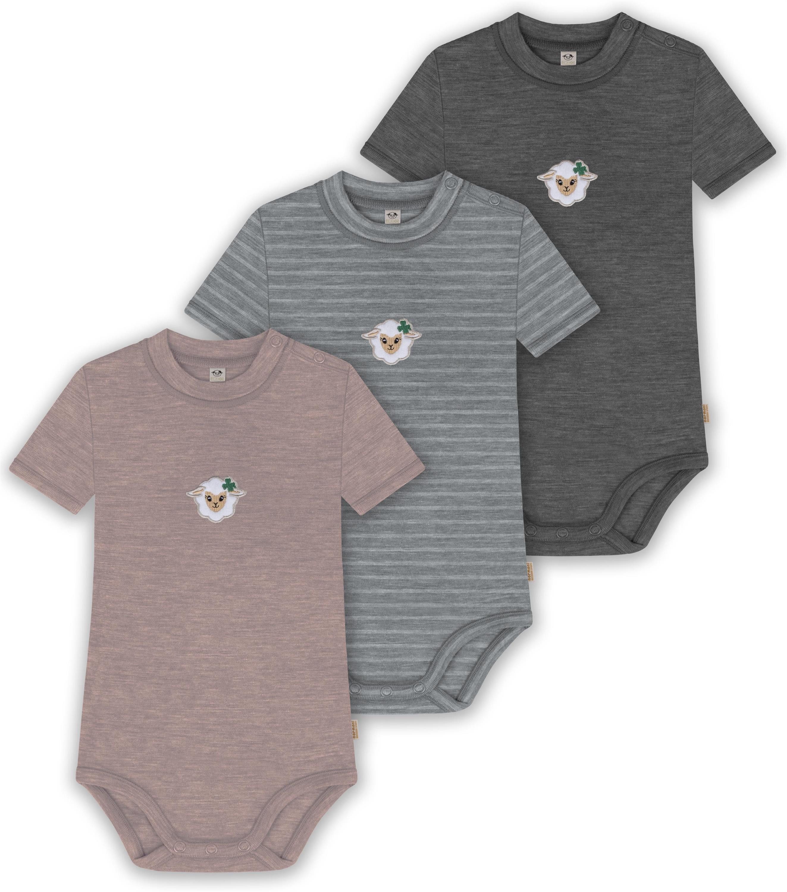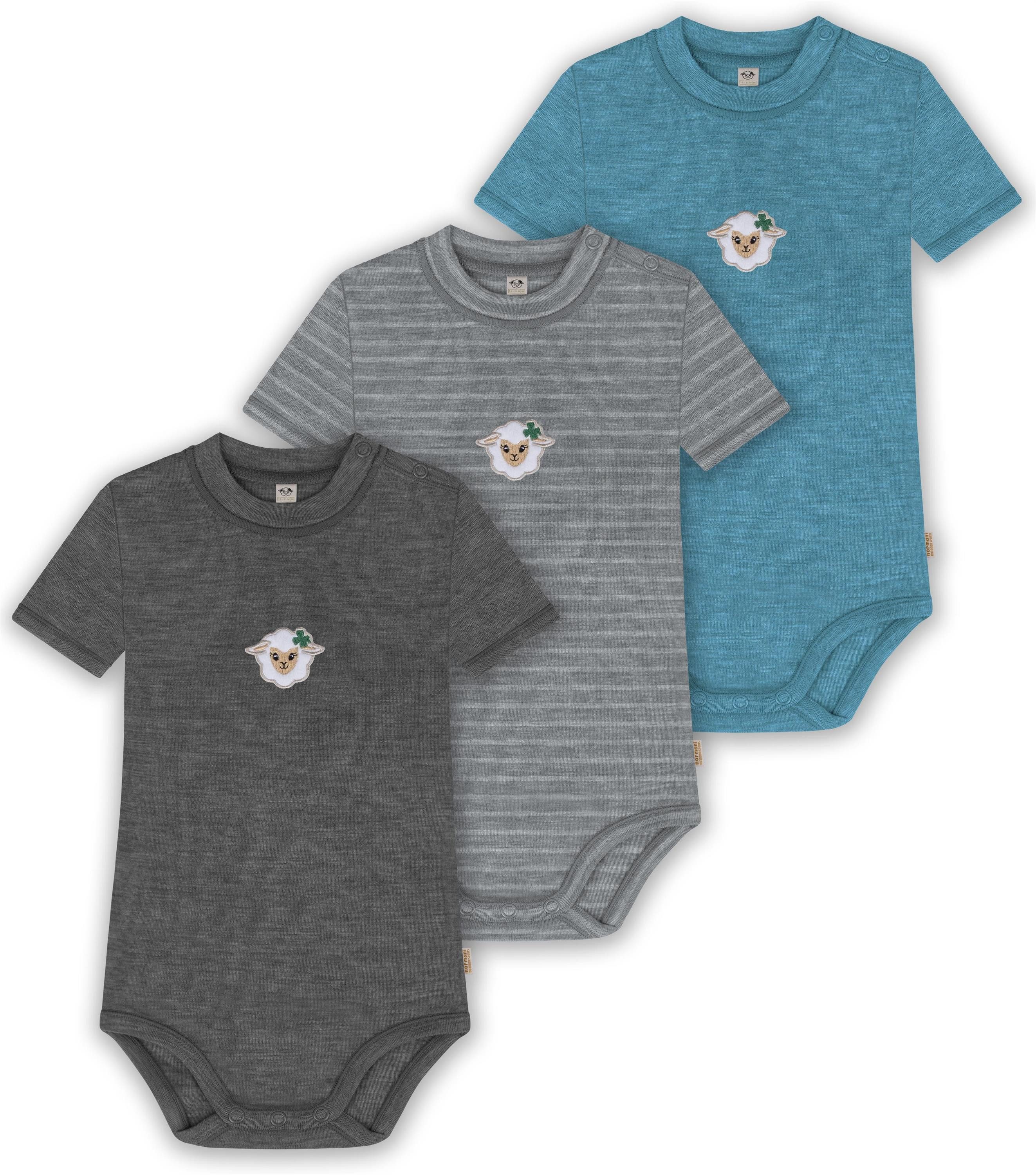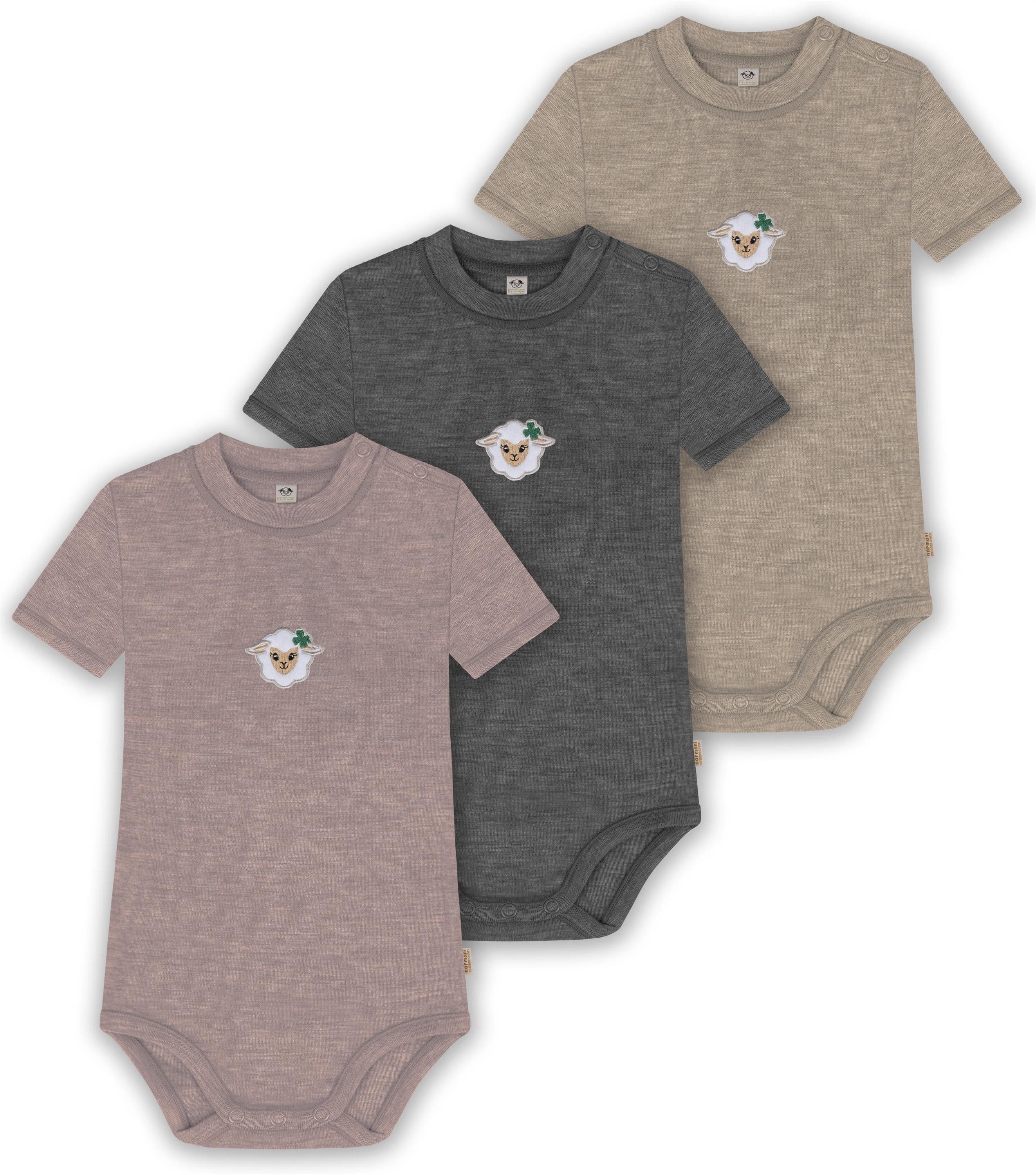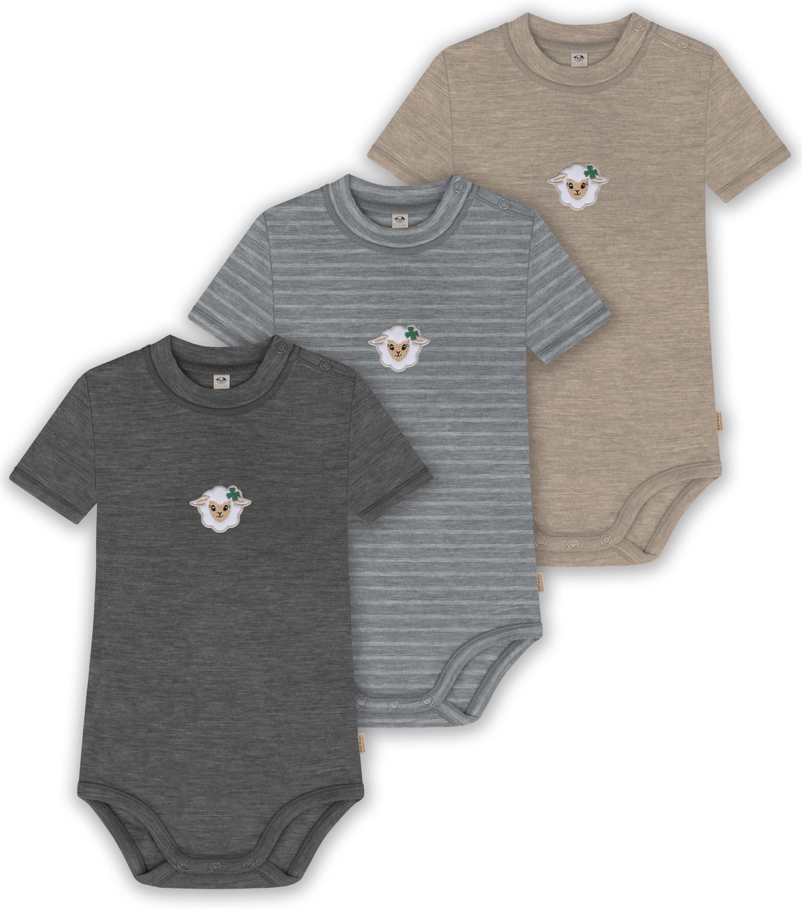 Unser Merino Kurzarm Body "Tihoi", im 3er Pack, ist mehr als nur ein einfacher Baby Body mit kurzen Ärmeln. Hinter seiner schlichten Erscheinung verbirgt sich ein Kleidungsstück, das sich perfekt für alle Wetterbedingungen eignet. Mit einer Grammatur von 200 g/m² bietet dieser Body eine optimale Wärmeisolierung, die ihn im Winter zur idealen wärmenden Schicht unter weiterer Kleidung macht. Auch im Sommer kann der Body wegen seiner natürlichen Thermoregulierung einzeln getragen werden. Die Wärmeregulierung und Atmungsaktivität der Merinowolle ermöglichen es Ihrem Baby, den Body den ganzen Tag über zu tragen – sei es beim Spielen oder beim Nickerchen. Die weiche Merinowolle ist besonders sanft zur empfindlichen Haut Ihres Babys und verursacht keine Hautirritationen. Zudem ist die Merinofaser geruchsneutralisierend, sodass der Body auch nach mehrmaligem Tragen frisch bleibt. Die Elastizität der Merinowolle sorgt für maximale Bewegungsfreiheit beim Spielen. Darüber hinaus ist der Body mit hochwertigen Marken-Druckknöpfen von YKK an den Schultern und zwischen den Beinen ausgestattet. Diese gewährleisten ein zuverlässiges Öffnen und Спрятать und erleichtern das Wickeln und Umziehen. Abgerundet wurde der Body mit einem kindgerechtem, flauschigem Schaf Stick, der als Eyecatcher dient.