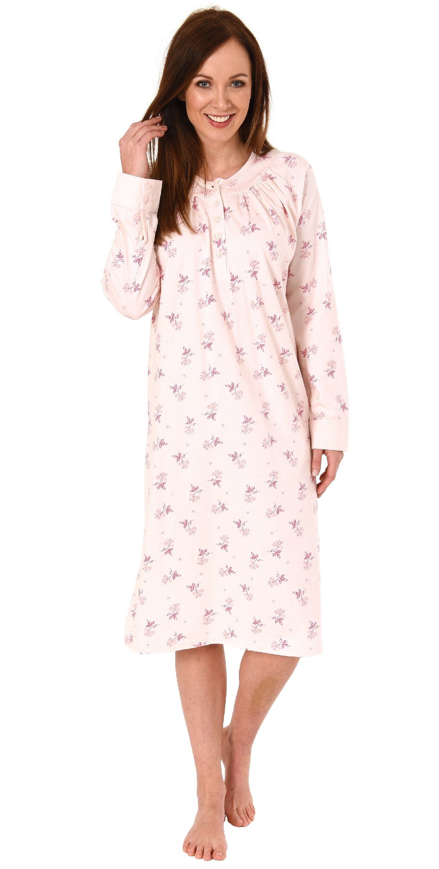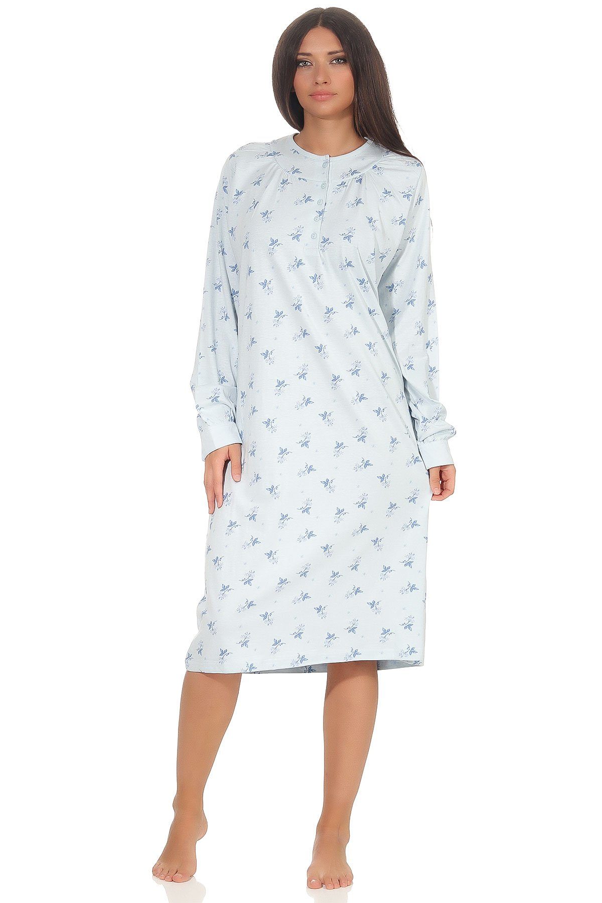 Dieses Damen Nachthemd mit langen Ärmeln hat eine elegante Optik, ist 105 lang und hat einen zeitlosen floralen Druck. Die Knopfleiste am Hals des Nachthemd sorgt für einen angenehmen Tragekomfort.