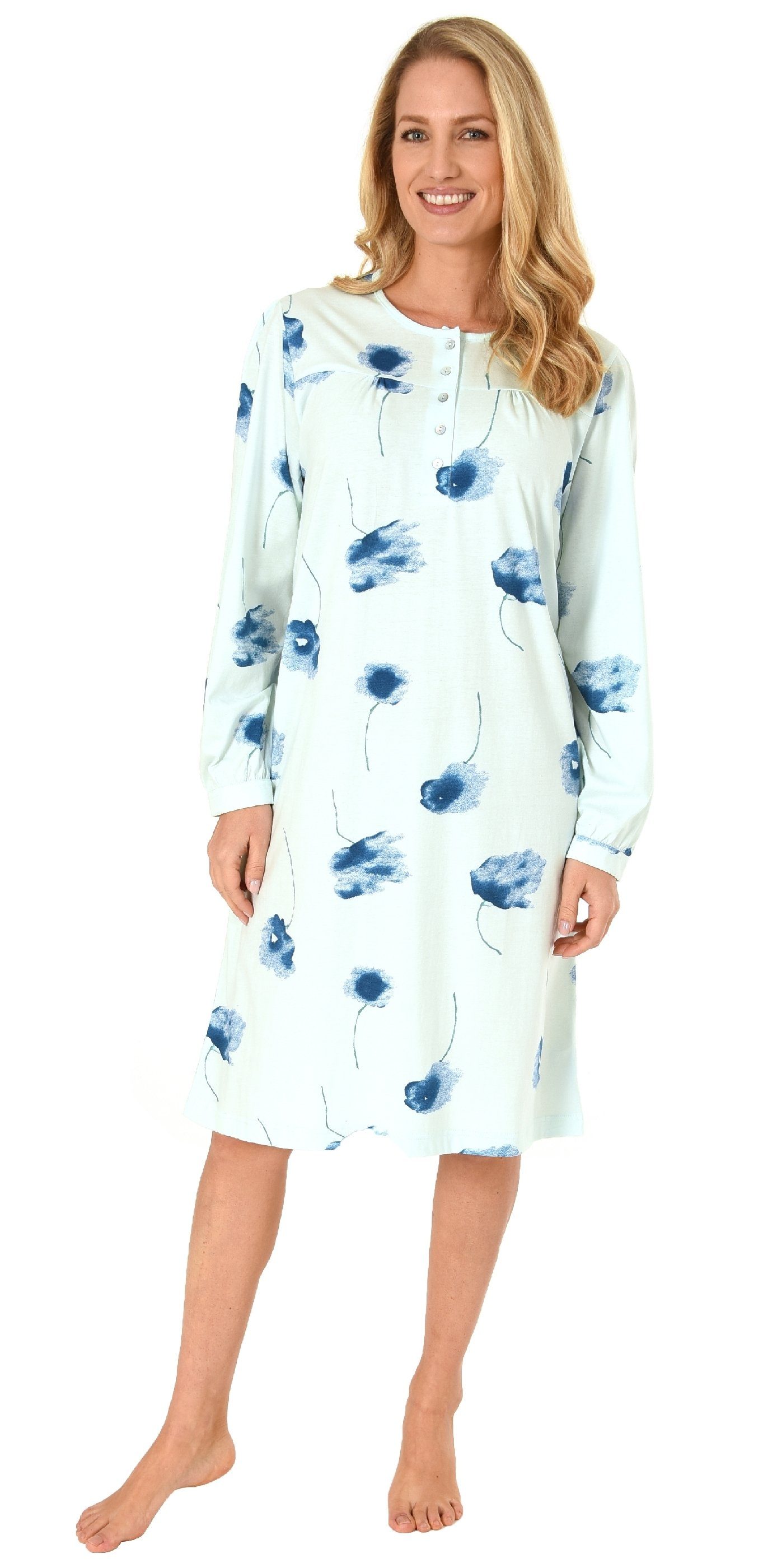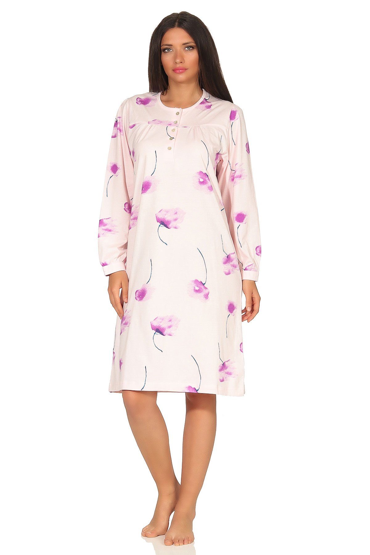 Dieses Damen Nachthemd mit langen Ärmeln hat eine elegante Optik, ist 105 lang und hat einen zeitlosen floralen Druck. Die Knopfleiste am Hals des Nachthemd sorgt für einen angenehmen Tragekomfort.