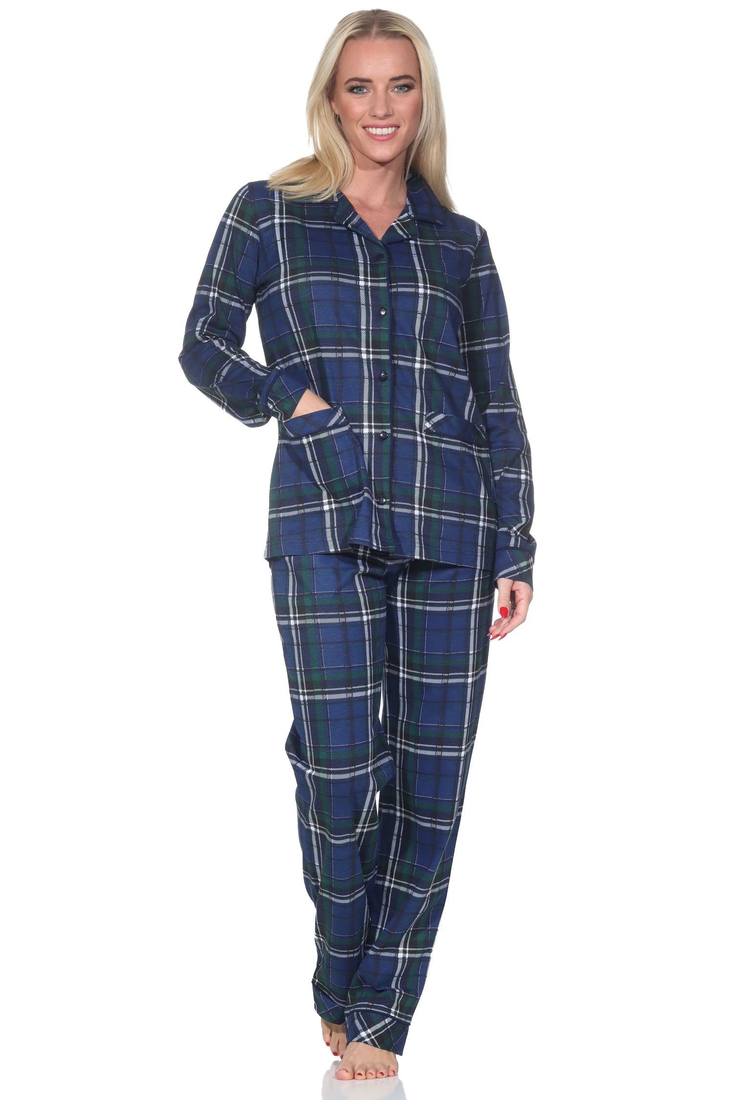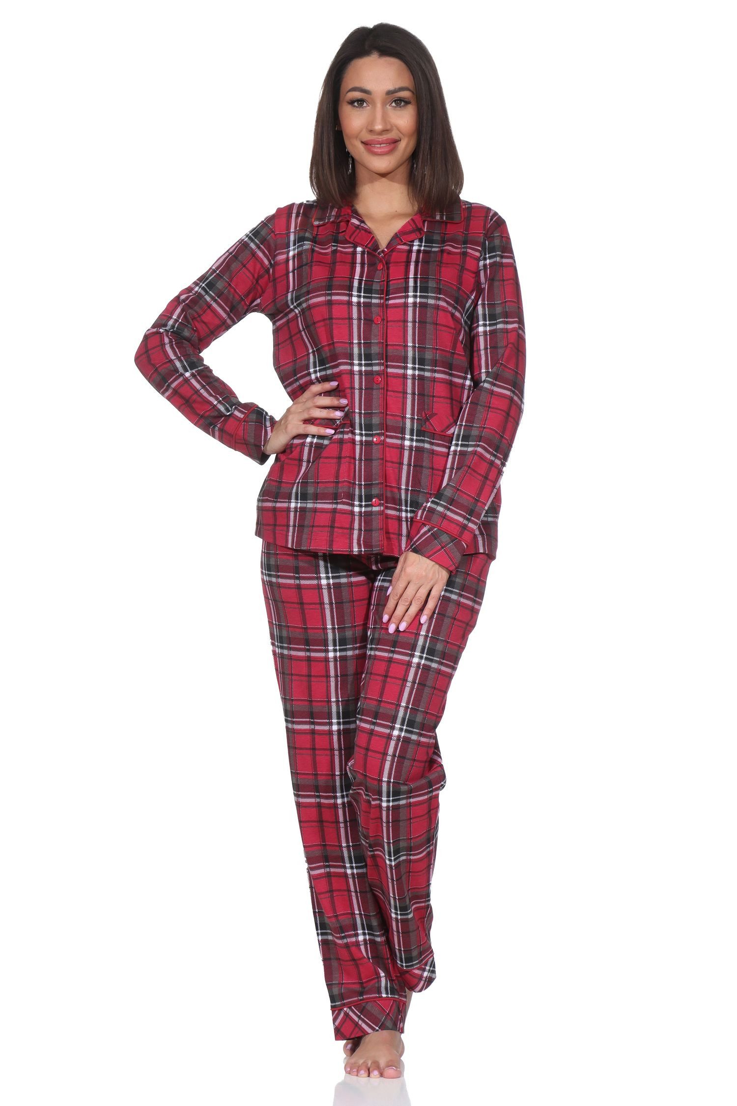 Damen Pyjama langarm Normann aus Single Jersey zum durchknöpfen in Karo Optik - auch in Übergrössen