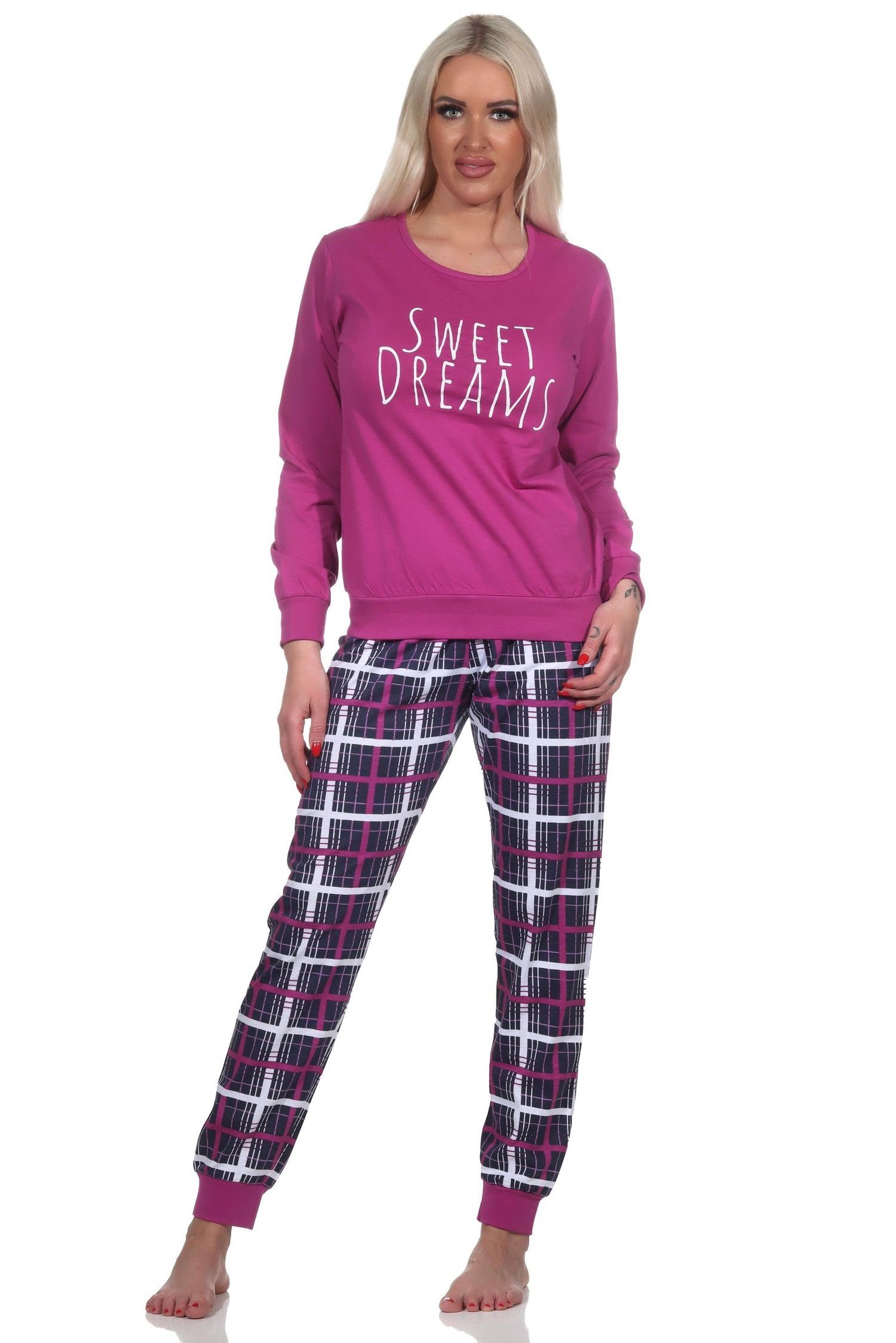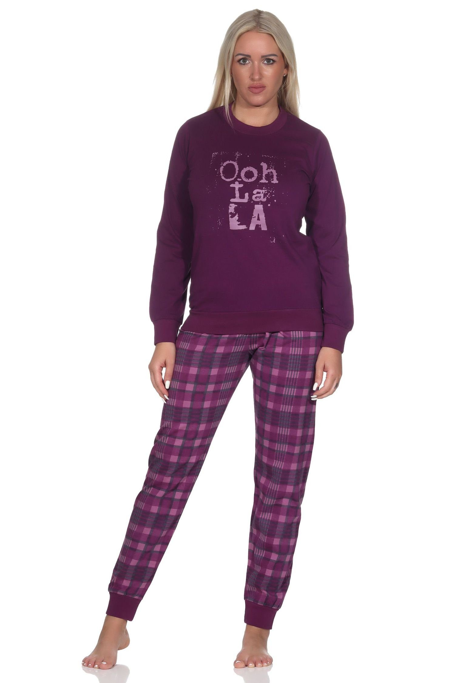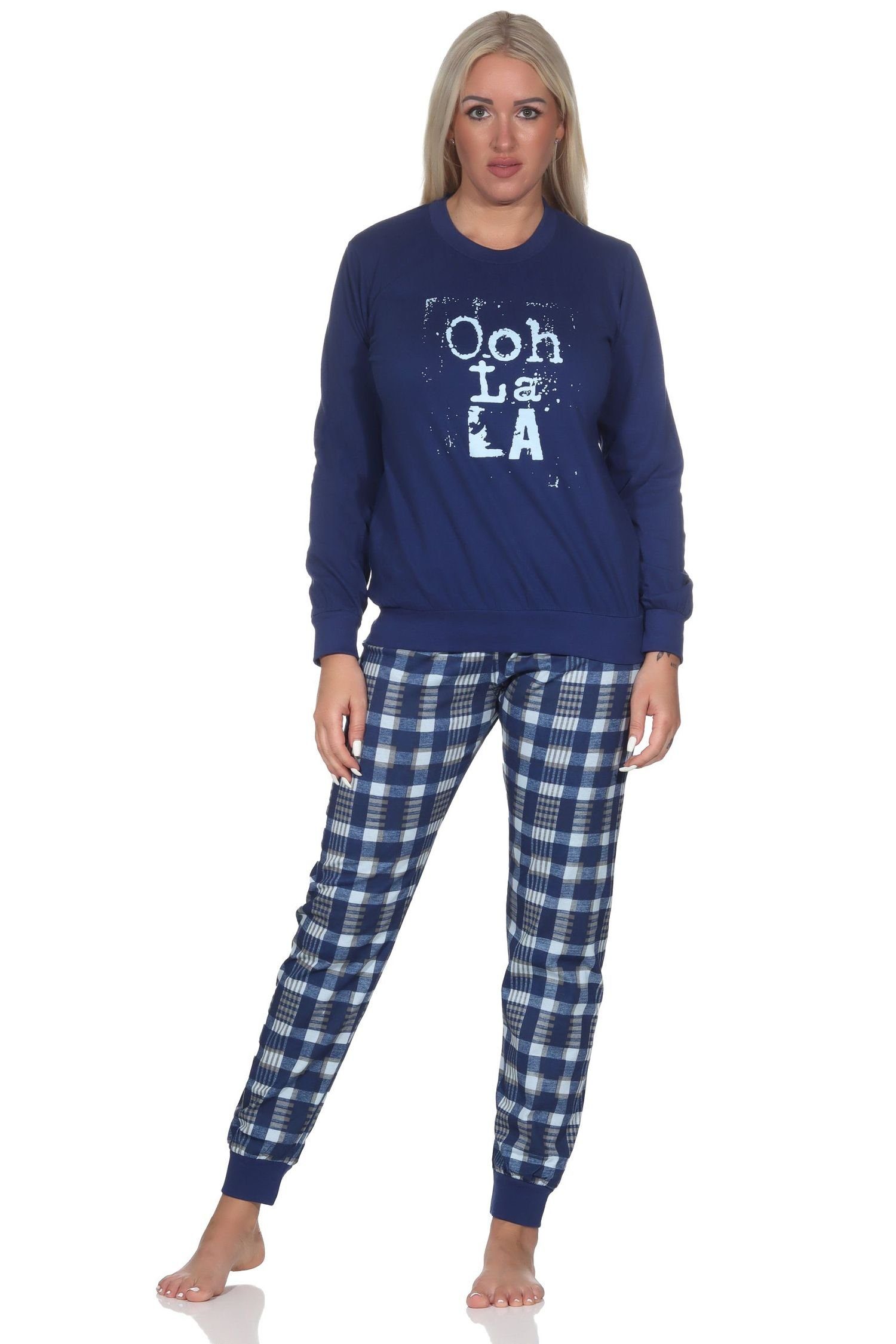 Normann Damen langarm Schlafanzug mit Bündchen Pyjama mit karierter Jersey Hose