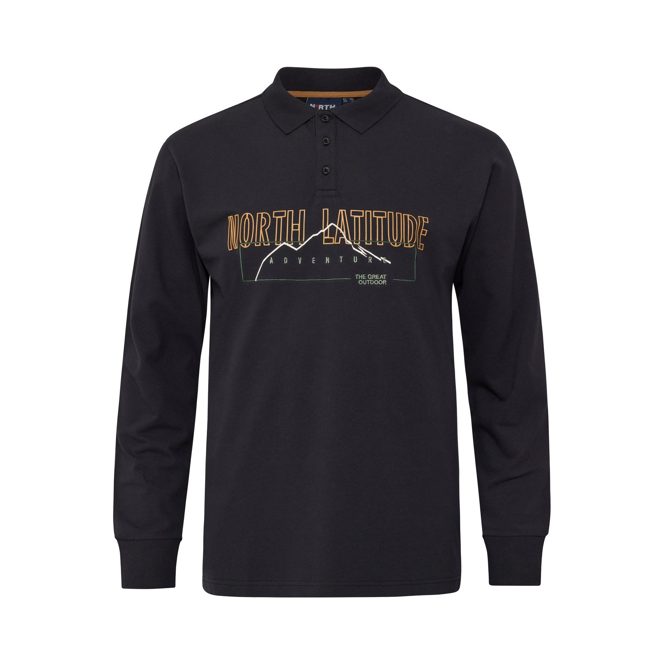 Das Shirt präsentiert sich in klassischem Schwarz mit einem auffälligen Frontprint „North Latitude Adventure“, der dem Poloshirt eine trendige, sportive Note verleiht. Der typische Polokragen mit Knopfleiste rundet den Look ab, während die elastischen Bündchen an den Ärmeln für perfekten Sitz sorgen.