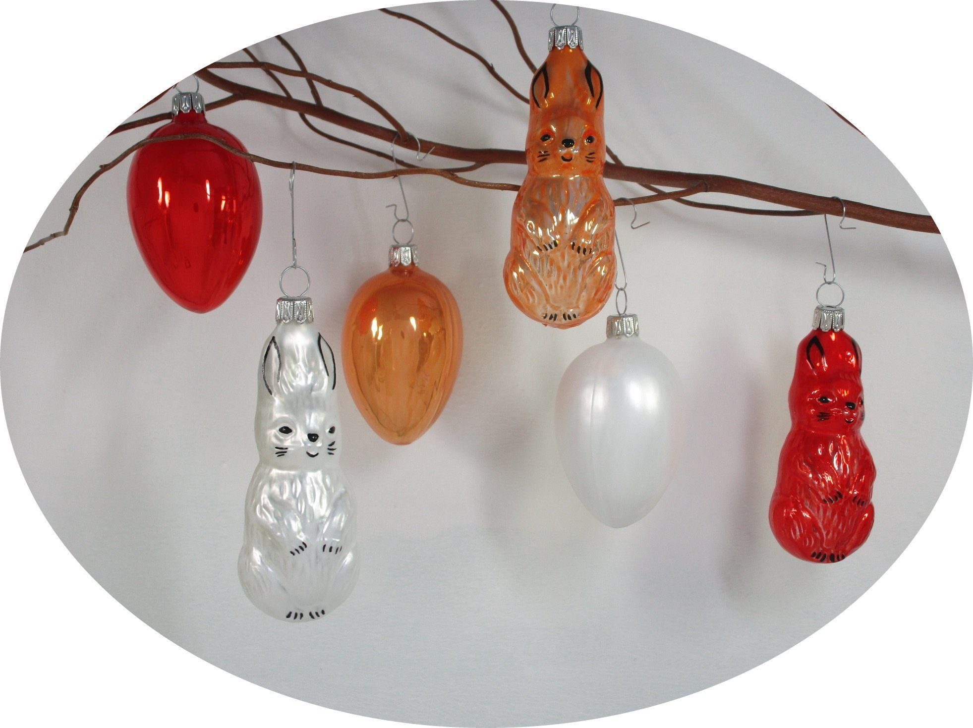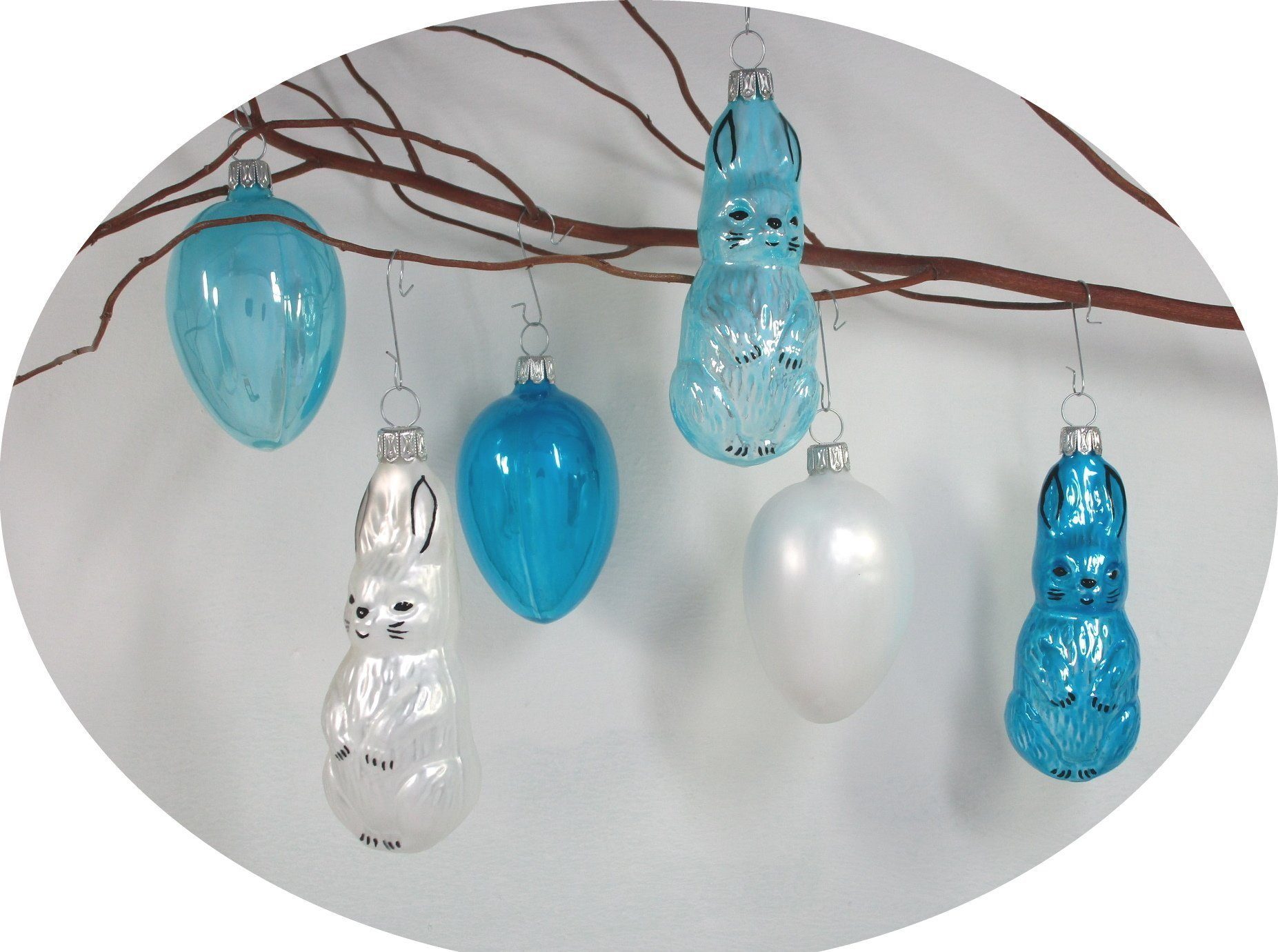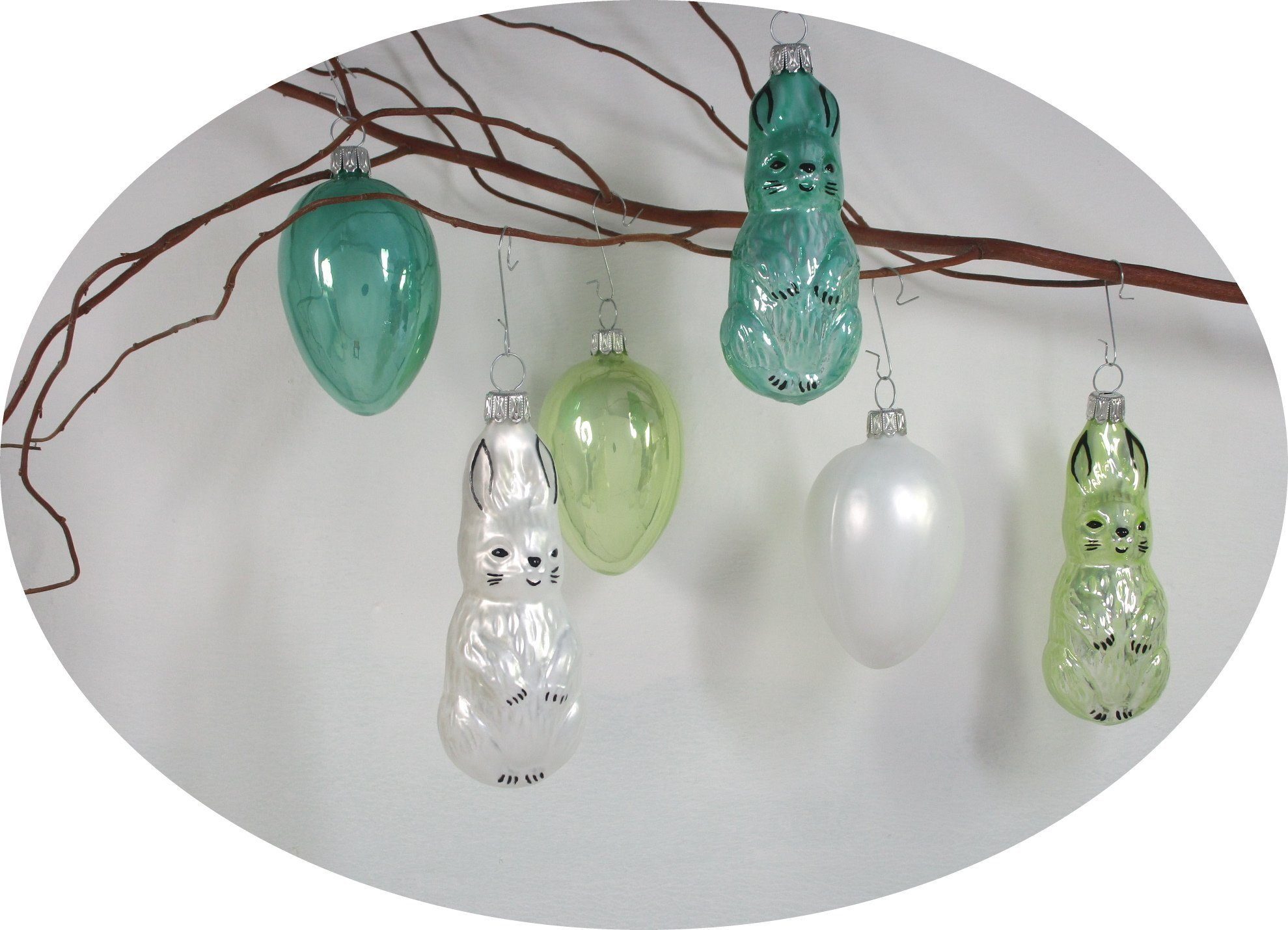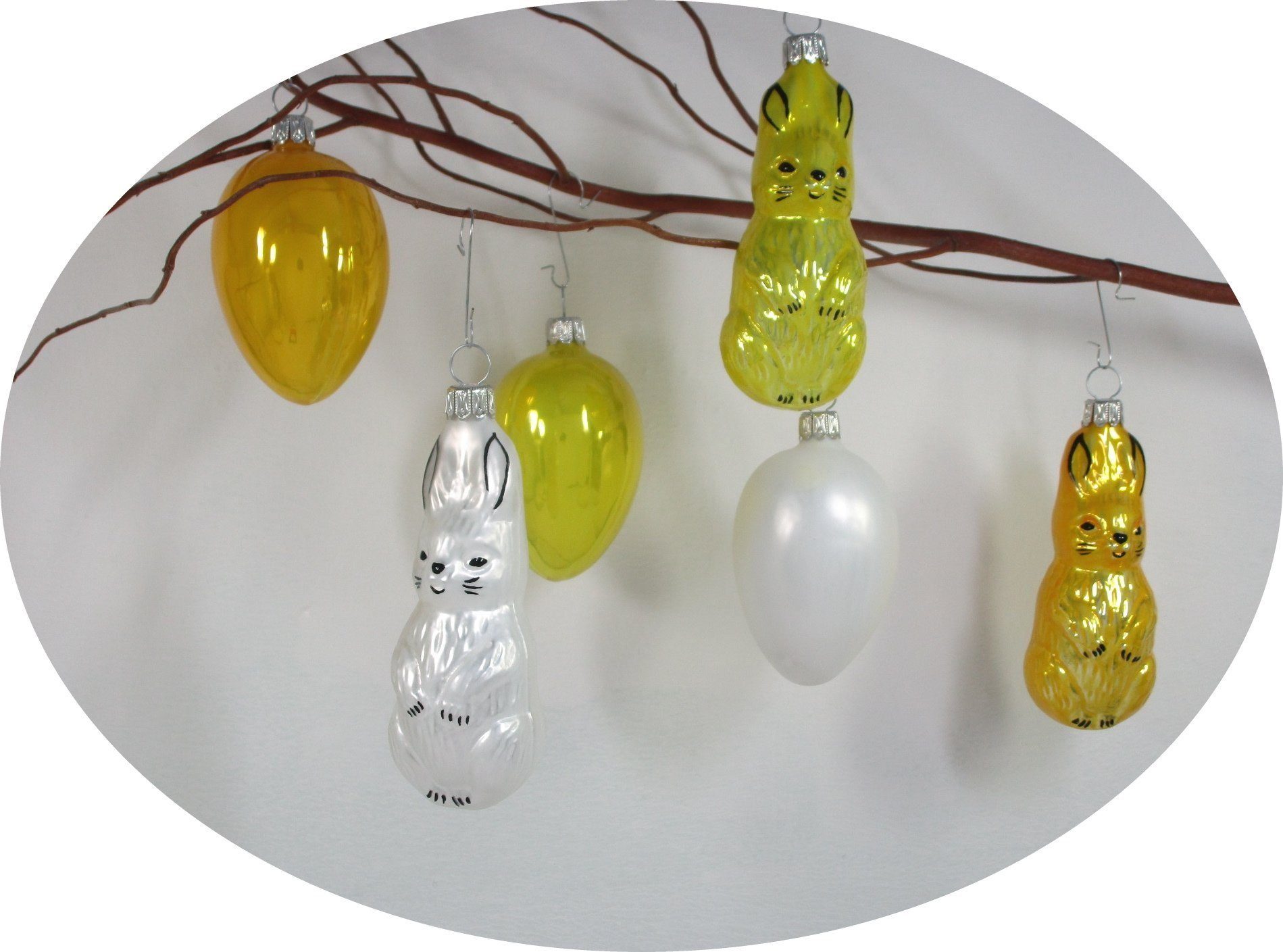 Lieferumfang | 6 Dekoelemente: jeweils 3 Osterhasen und 3 Ostereier in verschiedenen Farben, Satinbänder zum Aufhängen |