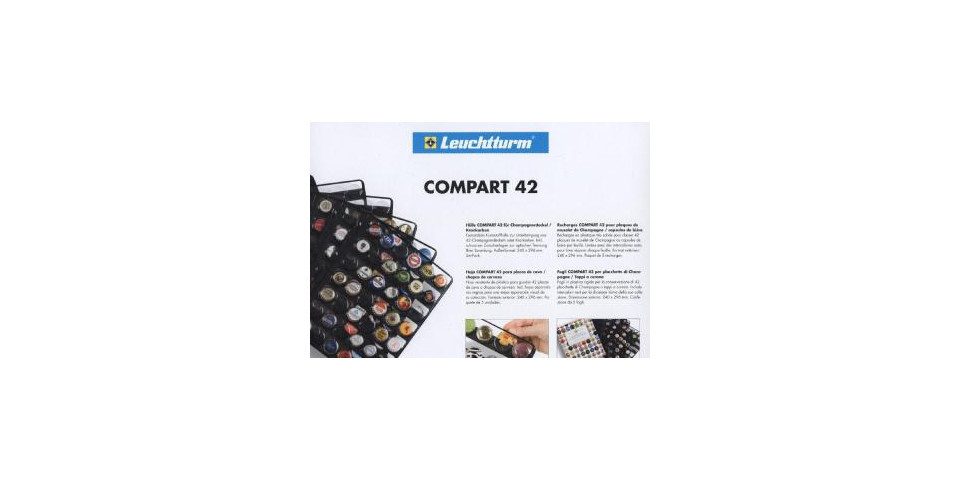 5 Hüllen und 5 schwarze Zwischenlagen für je 42 Champagnerdeckel oder Kronkorken. Zur Ergänzung der Leuchtturm Kronkorken- und Champagnerdeckelalben.