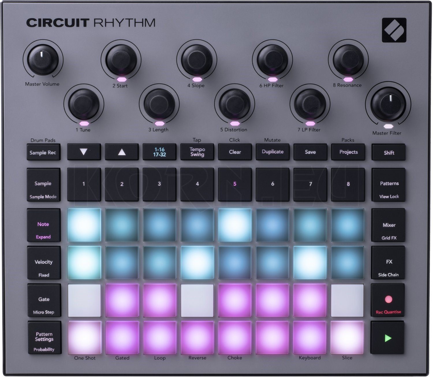 Novation Circuit Rhythm ist ein Standalone-Gerät mit welchem Samples direkt aufgenommen und auf alle erdenkliche Weise verarbeitet werden können. Resampling, Slices trennen, umdrehen und loopen stellt kein Problem dar, um nur einige Funktionen zu nennen. Mit den 8 Samplespuren sowie dem einfach nutzbarem Sequencer können Grooves quantisiert oder gar außerhalb des Rasters erfasst werden. Wahrscheinlichkeitsfunktionen und Möglichkeiten der Pattern-Mutation sorgen für eine stete Впередentwicklung und für einen kreativen Input in Sachen Beatproduktion. Der Novation Circuit Rhythm passt mit seinen verschiedenen Anschlussmöglichkeiten perfekt in jedes Studio-Setup. Der über USB wiederaufladbare Akku liefert bis zu 4 Stunden Laufzeit und macht den Novation Circuit Rhythm somit zu einem perfekten Begleiter in Sachen Beatproduktion. Mit Novation Components steht den Nutzern des Novation Circuit Rhythm eine Plattform zur Verfügung um Samples zu laden oder seine eigenen Arbeiten zu sichern.