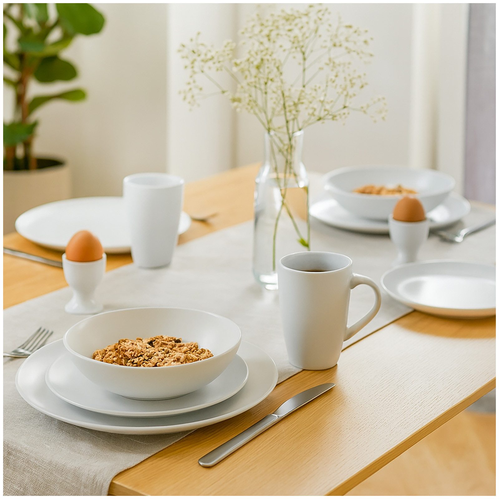 Lieferumfang (20-teilig): 4x Speiseteller Ø 27,5 x H 3 cm 4x Dessert-/Frühstücksteller Ø 20,8 x H 3,6 cm 4x Müsli-/Salatschüssel Ø 14,5 x H 7,7 cm 4x Tassen B/H 8,7 x 10 cm 4x Eierbecher Ø 5,5 x H 6,5 cm