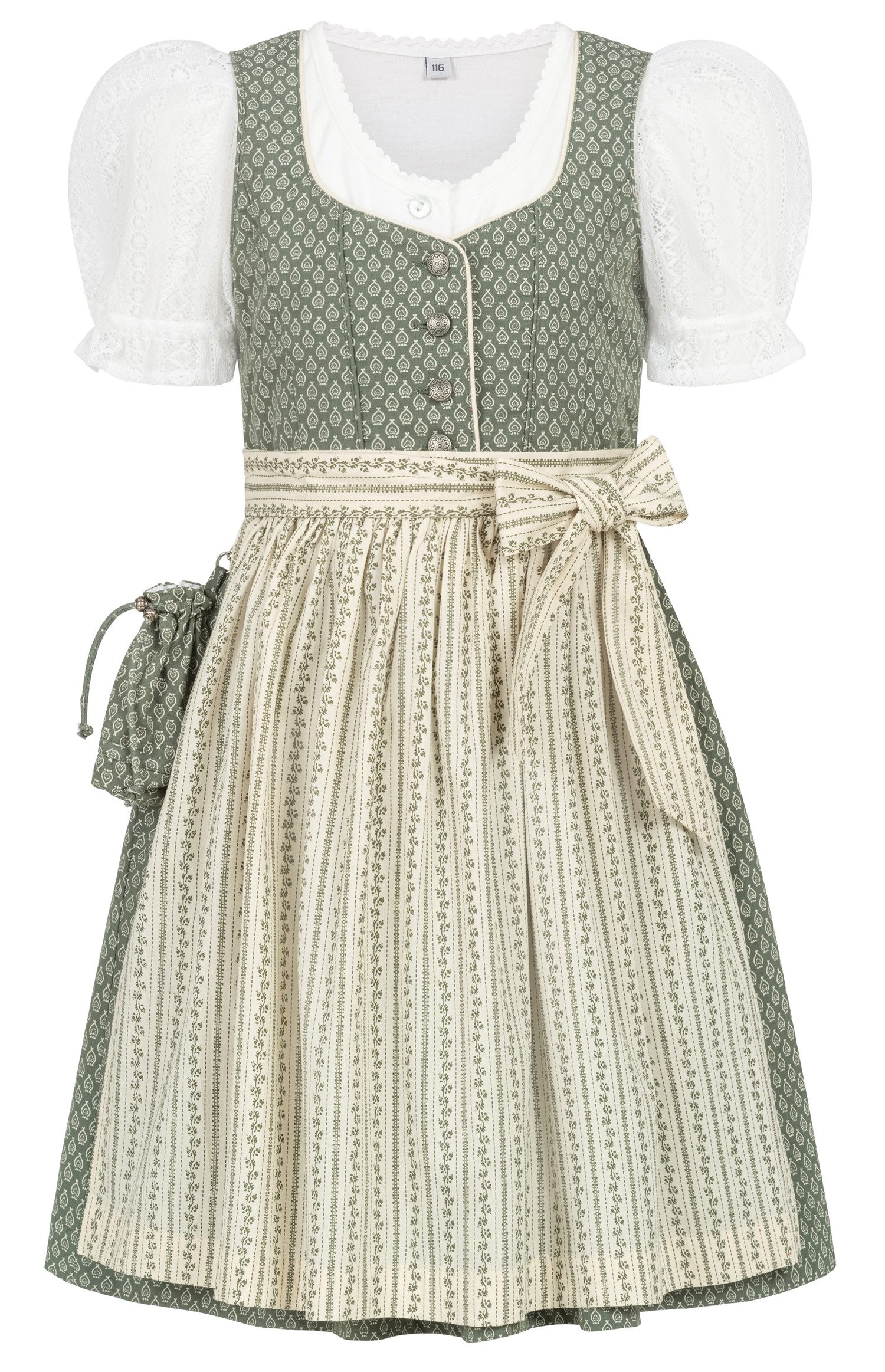 Sie suchen ein besonderes Outfit für Ihre kleine Maus?Dann ist unser 3-teiliges Kinderdirndl Fredericke in Salbei von Nübler genau das Richtige. Dieses Dirndl ist nicht nur traumhaft schön, sondern auch bequem und praktisch. Das Kleid ist aus weichem Baumwollstoff gefertigt und hat kleinen Ornamentenmuster. Der herzförmige Ausschnitt und die Knopfleiste sind von einer dezenten Borte umrandet. Ein richtiger Hingucker sind die edlen Knöpfe in Altsilberlook. Die Dirndlbluse hat perlmuttartige Verschlussknöpfe und Ärmel aus Spitze, die einen zauberhaften Look erzeugen. Der elastische Bund wiederum sorgt für einen optimalen Sitz und Tragekomfort. Auf der rechten Seite ist eine Tasche vorhanden, die durch einen Reißverschluss geschlossen wird. Das Kleid hat auch eine niedliche Tasche in demselben Muster wie das Kleid, die mit einem Karabinerhaken befestigt wird. Die leichte Stoffschürze hat ein Rankenmuster im Streifendesign und wirkt in Creme sehr erfrischend.