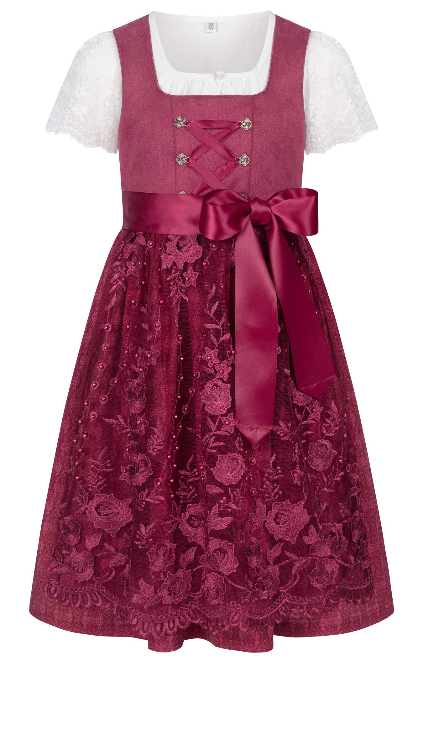 Unser 3-teiliges Kinderdirndl Gundi von Nübler im frischen Beere-Ton gehalten, bringt jede kleine Prinzessin zum Strahlen. Das samtweiche Oberteil hat mit Strasssteinen verzierte Miederhaken und ist mit einem edlen Miederband versehen, welches farblich dem Schürzenband angepasst ist. Auf der Rückseite wird das Dirndl durch einen Reißverschluss geschlossen. Der hohe Tragekomfort zeichnet das Kleid als besonders bequemes Kleidungsstück aus. Der Stoff ist weich und angenehm auf der Haut, sodass sich Ihre Kleine den ganzen Tag über wohlfühlt. Die entzückende weiße Knopfbluse mit kurzen elastischen Spitzenärmeln rundet das Dirndl harmonisch ab und verleiht dem Outfit eine Extraportion Verspieltheit. Die Schürze aus transparentem Netzstoff ist mit Blumenstickerei und dezenten Perlen verziert und veredelt noch zusätzlich das wunderschöne Rockmuster. Insgesamt ist dieses Kinderdirndl nicht nur ein modisches Statement, sondern auch ein Kleiderstück, das Tradition und Stil vereint. Wir freuen uns auf Ihre Bestellung.