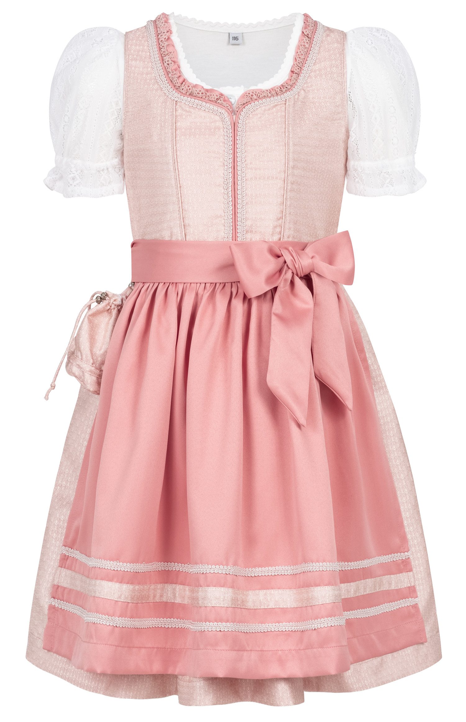 Dieses wunderschöne Kinderdirndl Lisa in Peach von Nübler ist das perfekte Outfit für jede kleine Prinzessin, die sich gerne traditionell kleidet. Das Dirndl besteht aus drei Teilen: dem Kleid, der Schürze und der Bluse. Das Kleid ist aus einem hochwertigen Material in Peach gefertigt, das mit einem dezenten rautenförmigen Muster verziert ist. Der herzförmige Ausschnitt ist mit einer sehr eleganten zweifarbigen Borte eingefasst, die dem Dirndl einen edlen Touch verleiht. Auf der Rückseite befindet sich der Reißverschluss. Die weich fliesende Dirndlschürze ist in passenden Farbton gehalten, der das Gesamtbild harmonisch abrundet. Die Bluse ist aus einem weißen Stoff, der angenehm auf der Haut liegt. Die Bluse hat einen runden Ausschnitt und kurze Ärmel, die mit einem elastischen Bund versehen sind. Die Bluse hat auch perlmuttartige Verschlussknöpfe und einen ebenfalls elastischen Bund am Saum. Dieses Kinderdirndl ist ideal für alle festlichen Anlässe wie Oktoberfest, Volksfeste oder Familienfeiern. Es lässt sich leicht an- und ausziehen und bietet viel Bewegungsfreiheit. Das Dirndl ist in verschiedenen Größen erhältlich.