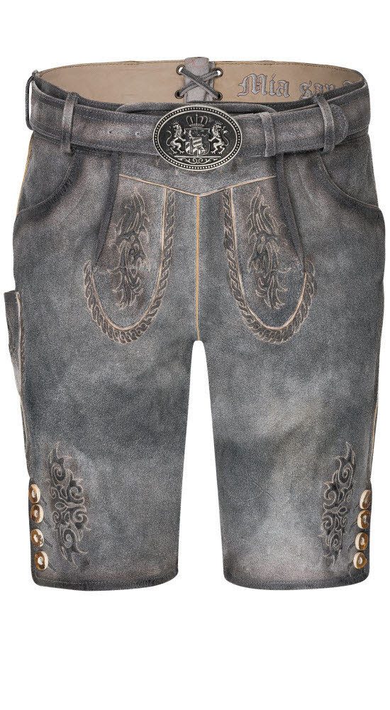 Diese Lederhose muss man einfach lieben. Zünftige Stickereien am Latz und an den Beinen sorgen für ein edles Aussehen auf dem antiken Grau. Die Lederhose verfügt über zwei praktische Eingriffstaschen und ein besticktes Messertascherl auf der rechten Seite. Am Gesäß ist eine Tasche für Ihren Geldbeutel. Die Knöpfe am Latz, sowie an den Beinabschlüssen sind in Hirschhornoptik gehalten. Auf der Rückseite befindet sich die Brotzeitfalte, die dem Verstellen der Ширина пояса dient. Der absolute Hingucker ist das Bayern-Wappen auf dem Ledergürtel. In dieser Lederhose sind Sie der Blickfang auf jedem Fest.
