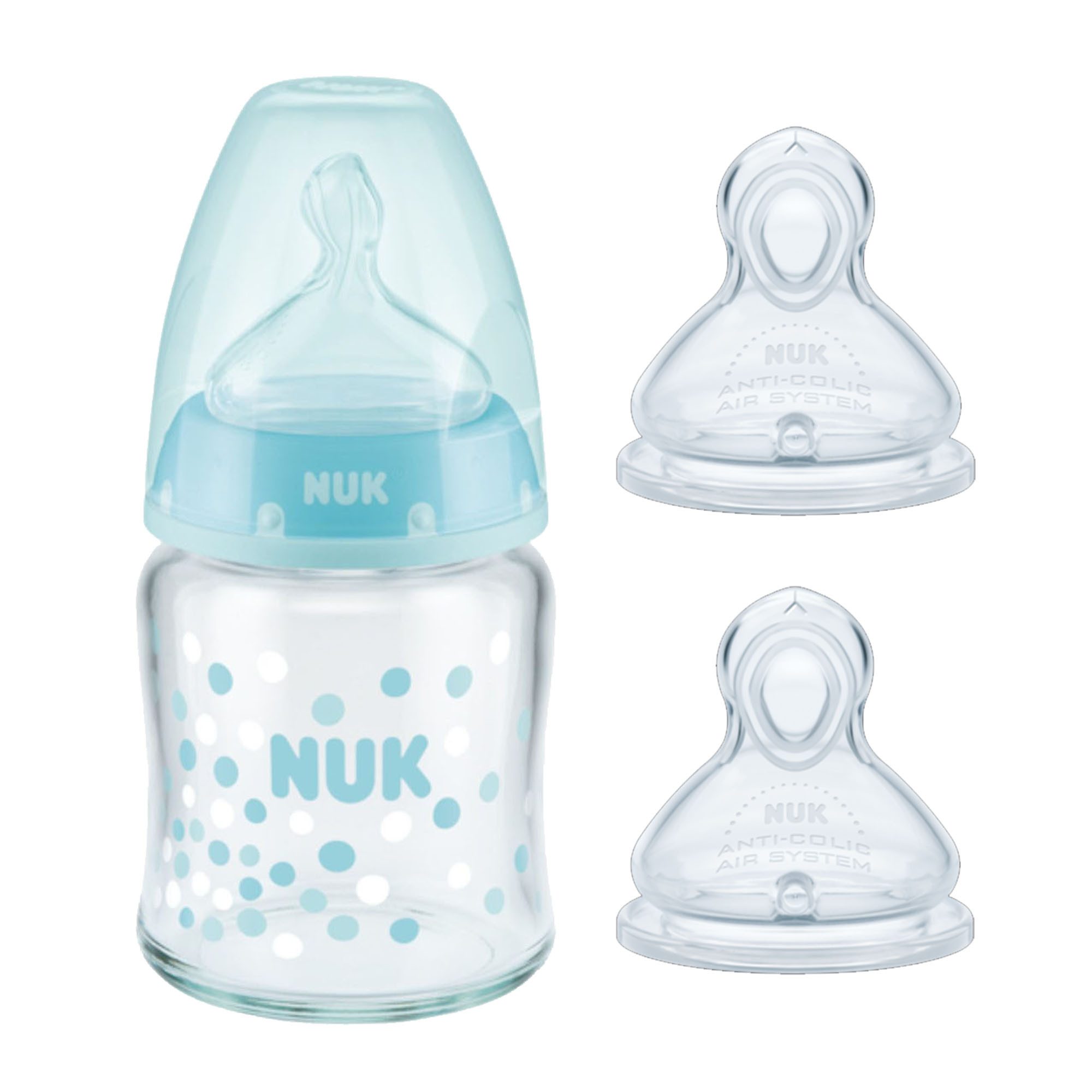 1 x First Choice Glasfasche 120ml 0+ 1 x First Choice 2er Sauger 6-18M Die NUK First Choice+ Babyflaschen verfügen über einen physiologischen, kiefergerechten Sauger mit einer weichen Zone, die während des Stillens der Brustwarze geformt wird. Sehr gut akzeptiert von Säuglingen. Dieser Schnuller ist ideal für Mütter, die Stillen wechseln möchten. Dank seiner natürlichen Form passt sich der NUK Schnuller perfekt dem empfindlichen Gaumen des Kindes an und fördert die Entwicklung von Kiefern und Zähnen, während das Air System NUK Konzept Kolikschmerzen reduziert und verhindert, dass das Baby Luft verschluckt. Robust , diese Flasche verfügt über eine Verschlussplatte, um ein Auslaufen während des Transports zu verhindern.