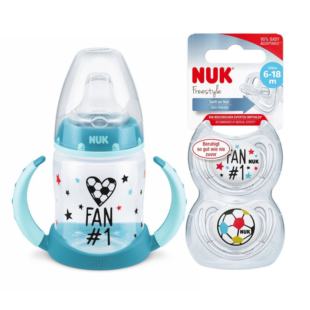 1 x First Choice Trinklernbecher 150ml 1 x Freestyle Schnuller 6-18M 1 x Schnullerkette Must-Have für kleine Fußballfans – die NUK Fußball-Edition Rechtzeitig zum großen Sportereignis des Jahres bringt NUK eine liebevoll gestaltete Fußball-Edition heraus. Perfekt für Public Viewing oder den Fußballplatz, diese Produkte vervollständigen das Outfit kleiner Minifans. NUK First Choice Trinklernflasche Der ideale Begleiter für den Übergang vom Stillen zum selbstständigen Trinken: Die NUK First Choice Trinklernflasche mit auslaufsicherer Silikon-Trinktülle und NUK Air System, das Säuglingskoliken vermindert. Ergonomische Griffe mit Anti-Rutsch-Noppen sorgen für sicheren Halt. Die Flasche ist leicht zu reinigen und ideal für die Nahrungszubereitung. Все Teile sind frei kombinierbar mit der NUK First Choice Reihe. NUK Freestyle Silikon-Schnuller Für Geborgenheit und Beruhigung: Der NUK Freestyle Schnuller ist der weiblichen Brust nachempfunden und minimiert Druck auf Zähne und Kiefer. Mit großen Belüftungsöffnungen und einem flachen Knopf ist er besonders sanft zur Haut und leicht zu greifen. Die NUK Fußball-Edition – perfekt für kleine Fußballfans und ihre Eltern!