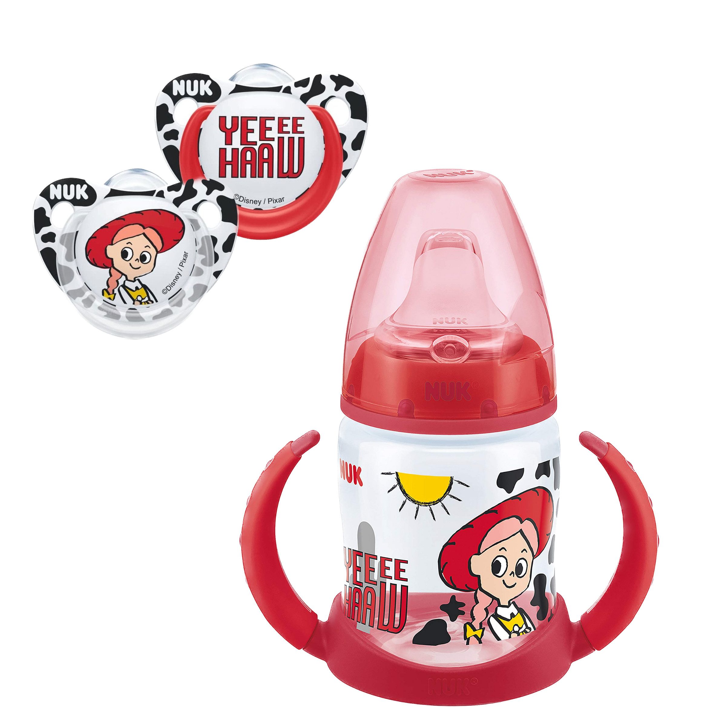 Set bestehend aus: 1. NUK Disney Pixar Toy Story Trendline Silikon-Schnuller 6-18: Dieser Schnuller ist der weiblichen Brust beim Stillen nachempfunden und bietet Ihrem Baby ein beruhigendes und vertrautes Sauggefühl. Das flache, dünne Lutschteil reduziert den Druck auf Zähne und Kiefer und fördert eine gesunde orale Entwicklung. Hergestellt aus klarem Silikon, ist er kochfest und leicht zu reinigen. Das NUK Air System sorgt dafür, dass der Schnuller weich bleibt und die Kieferbelastung minimal ist. Das Disney Pixar Toy Story Design macht ihn zu einem besonderen Lieblingsstück für kleine Fans. 2. NUK First Choice Trinklernflasche (150 ml): Diese Trinklernflasche ist perfekt für Kinder ab 6 Monaten, die den Übergang vom Stillen oder Flaschenfüttern zum selbstständigen Trinken meistern. Die weiche Silikon-Trinktülle mit integrierter Softzone sorgt für ein angenehmes, natürliches Trinkgefühl. Das Anti-Colic Air System verhindert Luftschlucken und Koliken, während die ergonomischen Griffe sicheren Halt bieten. Die Flasche ist , auslaufsicher und leicht zu reinigen.