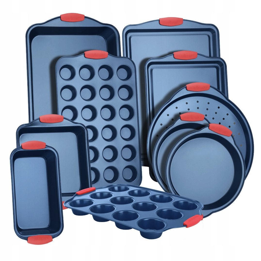 10-ELEMENT KIT: Das 10-teilige Backset bietet komplettes hochwertiges Zubehör zum Backen von Kuchen, Brot und Muffins. Es enthält ein Backblech, ein Pizzablech, 2 runde Formen, eine quadratische Form, eine Brotform, kleine und große Keksbleche und Muffinformen (12 und 24 Löcher).