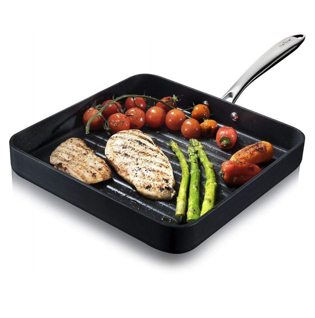 GLEICHMÄSSIGES KOCHEN: Die quadratische Grillpfanne besteht aus dickem Aluminium mit einer eloxierten Oberfläche, die die Hitze effektiv verteilt und speichert, so dass heiße Stellen vermieden werden und ein gleichmäßiges Kochen auf der gesamten Oberfläche gewährleistet ist.