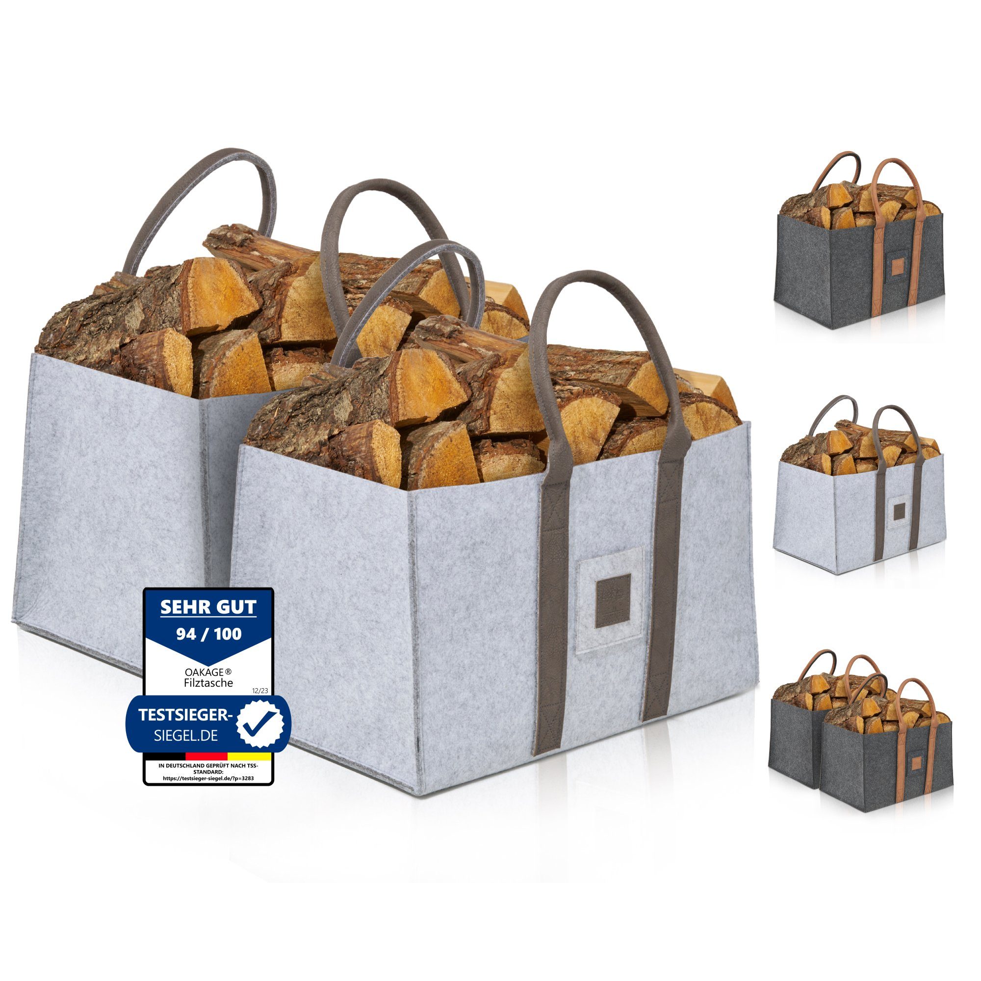 Der OAKAGE Kaminholzkorb… Der erste Holzkorb, der auch zum Tragen von Kaminholz gedacht ist! Hätten Sie nicht auch gerne einen stylischen Ersatz für Ihre Holzeimer und würden gerne für Ihr ordentliches Wohnzimmer und die Kaminlandschaft angesprochen werden? Dann werden Sie lieben, wie sich unser moderner Brennholzkorb nahtlos in jedes Wohnambiente einfügt und zum stilvollen Blickfang wird, der gleichzeitig Umweltbewusstsein und Funktionalität vereint. Was wir Ihnen nicht versprechen dürfen, ist dass der voll gefüllte, große Korb aus Leder, Weide oder Filz genügend Holzscheite für den ganzen Tag fassen kann und Sie sich somit den kalten Weg zum Holzlager sparen, niemand kann das. Aber wir können Sie auf tausende unserer zufriedener Kunden verweisen, die uns berichten, dass Sie dank unserem Feuerholzkorb deutlich weniger Feuerholz holen müssen und dadurch mehr magische Momente mit Ihren Liebsten vor dem Kamin verbringen können. Und dank dem patentierten, ergonomischen Tragesystem durch die abstehenden, ausreißsicheren Holzgriffen fällt selbst ein langer Weg zurück ins Warme mit einem prall gefüllten Tragekorb kinderleicht. Egal ob beim Einkaufen, beim Holz holen oder innen vor dem Kamin, mit OAKAGE haben Sie immer den richtigen Begleiter zur Holzaufbewahrung an Ihrer Seite. Dazu kommt noch, dass Sie mit jedem Kauf etwas Gutes für die Umwelt tun und das bequem vom Sofa, denn mit einem Teil des Umsatzes forsten abgeholzte Regionen in Deutschland wieder auf. Jetzt bestellen und das Knistern in und vor Ihrem Kamin wieder erleben.