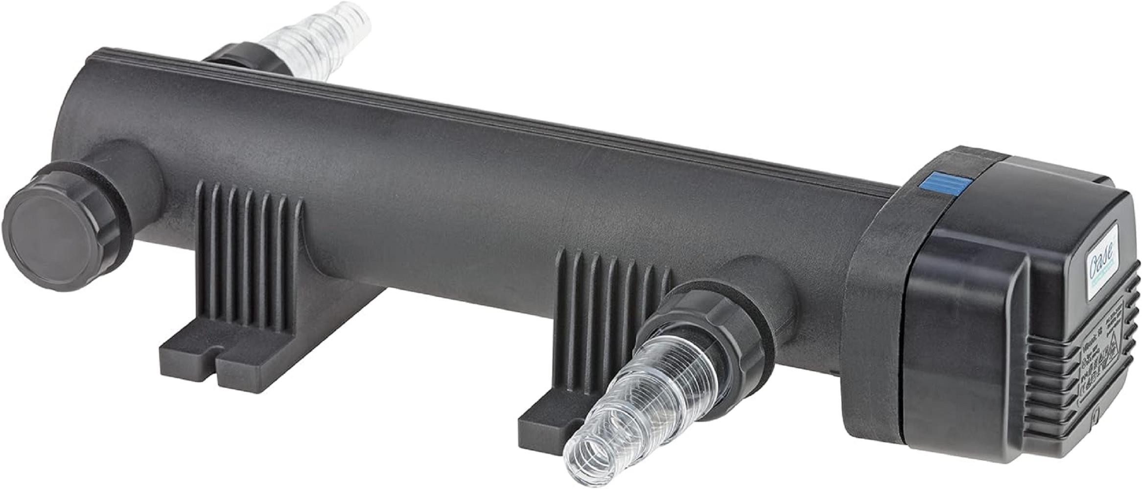 Das UVC-Vorklärgerät OASE Vitronic 36 W beseitigt Schwebealgen, reduziert schädliche Bakterien und sorgt so für klares Wasser. Jetzt ganz neu: Einfache Montage direkt an die BioSmart und BioTec Filter! Das Vorklärgerät mit Bypass-Technik ist geeignet für max. Durchlaufleistungen bis zu 6000 l/h und hat eine Leistungsaufnahme von 36 Watt. Für eine hohe Funktionssicherheit sorgt ein Kontrollfenster. Die praktische Schnellverschlusstechnik erleichtert die einfache Quarzglasreinigung. Das UVC-Vorklärgerät OASE Vitronic 36 W gibt es komplett mit Universal-Stufenschlauchtüllen für den Anschluss von Schlauchdurchmessern von 1" (25 mm) bis 1 ½" (38 mm). Umfangreiches Anschlusszubehör ermöglicht die einfache Montage. Das Kabel ist 5 m lang. Die Nennspannung beträgt 220-240 V/50-60 Hz. Die Garantie beträgt 2 Jahre.