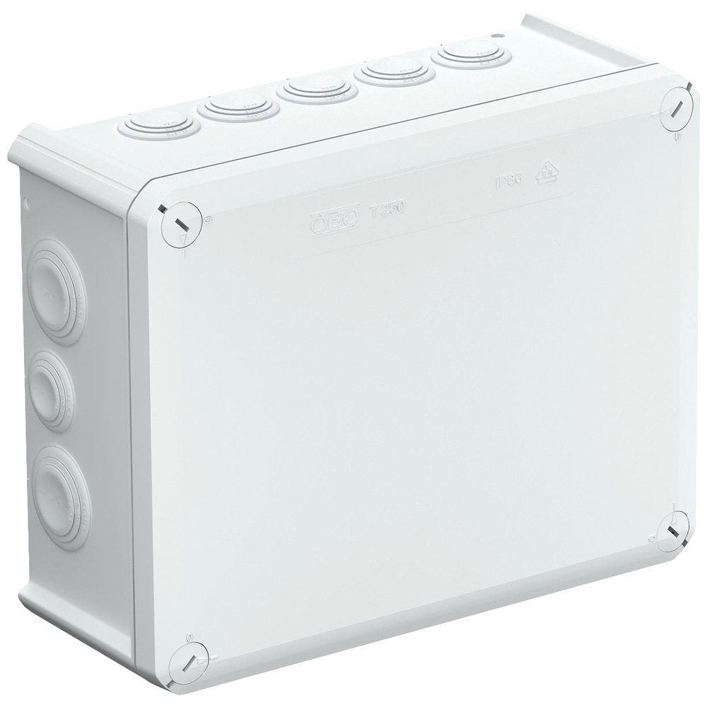 Die Kabelabzweigkästen der T- Serie sind alle UV-beständig. Sie bestehen aus einem thermoplastischem Kunststoff Polypropylen mit Einsteckdichtungen aus Ethylenvinylacetat EVA. Somit können Leitungen durch die 9x M25 + 7x M32 Dichtungen installiert werden oder die Dichtungen werden mit einem Messer an der vorgesehenen Stellen eingeschnitten, um eine Einführungsöffnung für Leitungen oder Rohre herzustellen. Alternativ können Kabelverschraubungen anstelle der Dichtungen durch die Öffnungen gesteckt und von innen mit einer Gegenmutter gekontert werden. Die Kabelabzweigkästen können mit Blechschrauben 3,5 x 9,5 in Öffnungen am Boden auf Montageblechen montiert werden. Lichte Innenmaße: 225 x 173 x 86 mm. Deckel mit Beschriftungsfeld und plombierbar