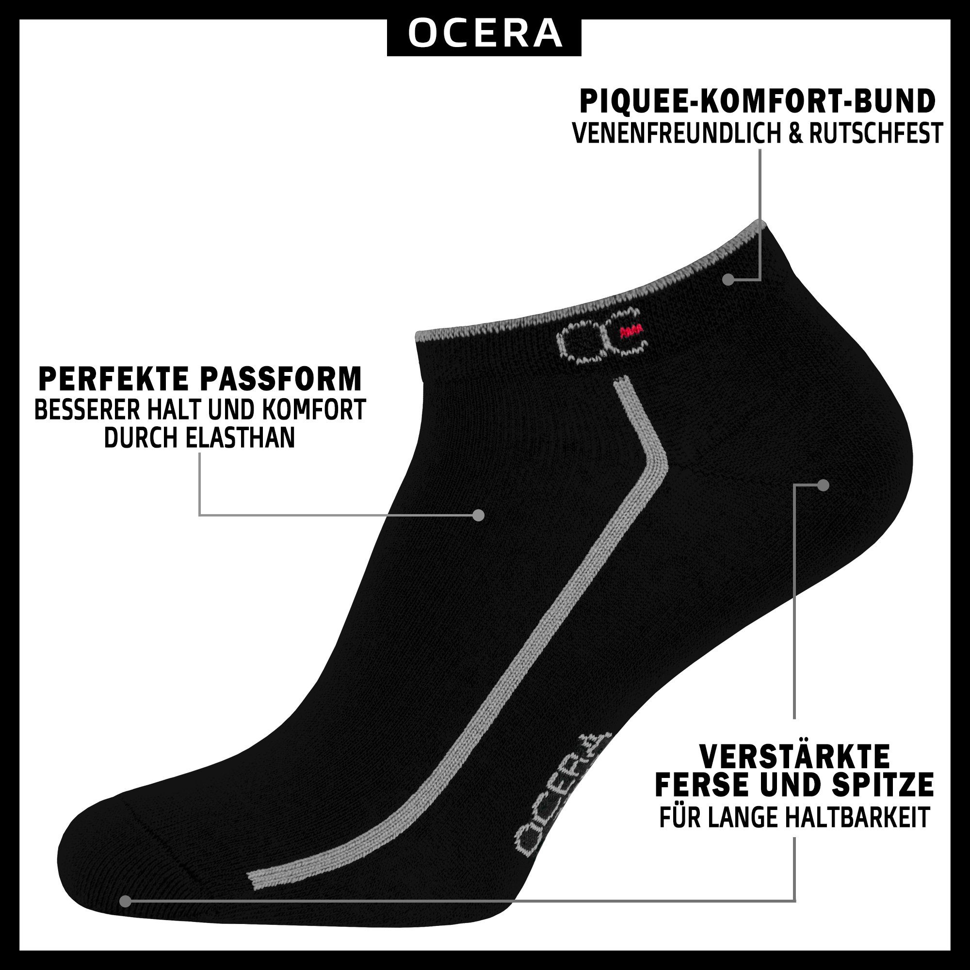 OCERA 10x schwarze Sneaker Socken Unisex für Damen und Herren mit stylischen, modernen Streifen in gedeckten und bunten Neon Farben
