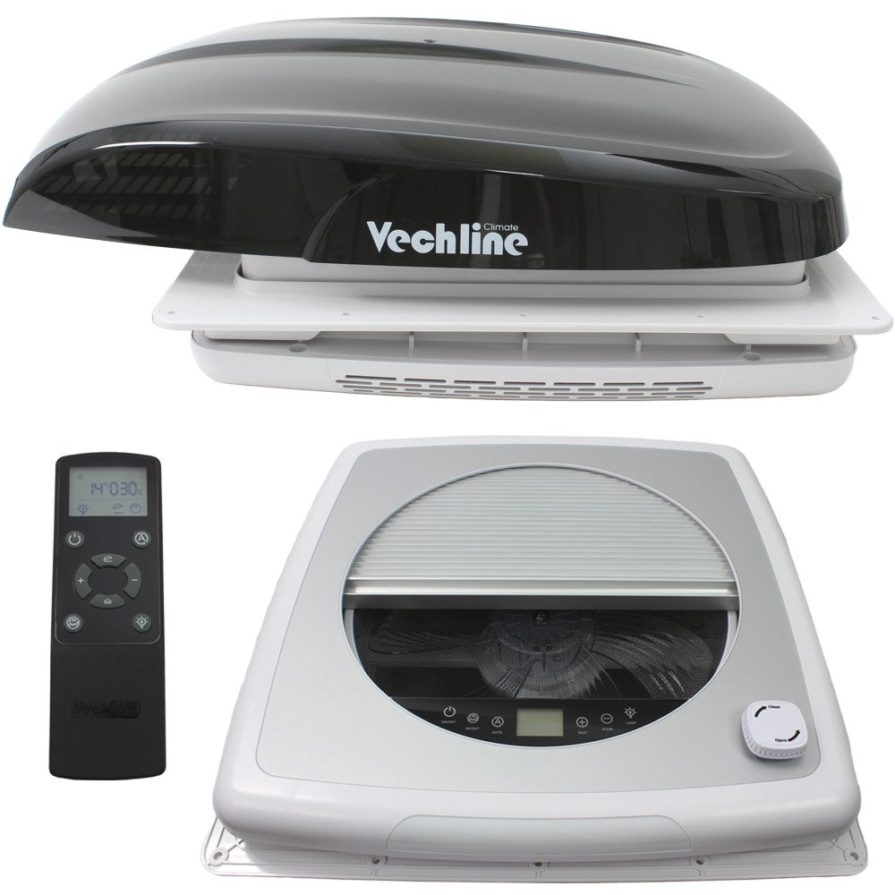 12 Volt Vechline Dachhaube mit schwarzer Klarglas-Haube, Ventilator, Innenrahmen mit Verdunkelungsplissee, LED Beleuchtung und Funk Fernbedienung