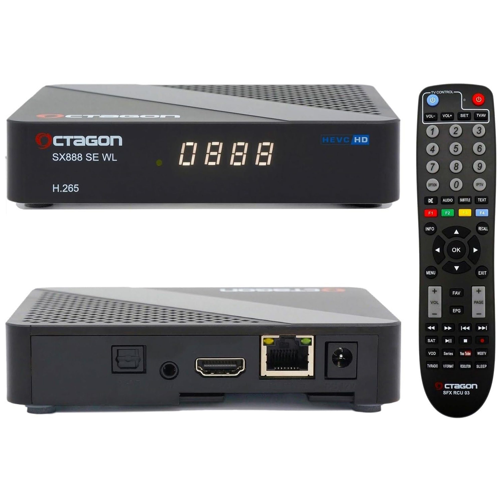 „Die OCTAGON SX888 SE V2 WL HD H.265 IP bietet eine umfassende Schnittstellenvielfalt für eine herausragende Konnektivität. An der Seite der Multimedia-Box befinden sich 2 USB-Ports, während auf der Rückseite ein HDMI 1.4b-Anschluss, eine S/PDIF-Schnittstelle und ein Ethernet LAN-Anschluss vorhanden sind. Zusätzlich verfügt die Box über einen integrierten IR-Sensor und einen Anschluss für den mitgelieferten externen IR-Empfänger, um Ihre Bedienungsmöglichkeiten zu erweitern.“