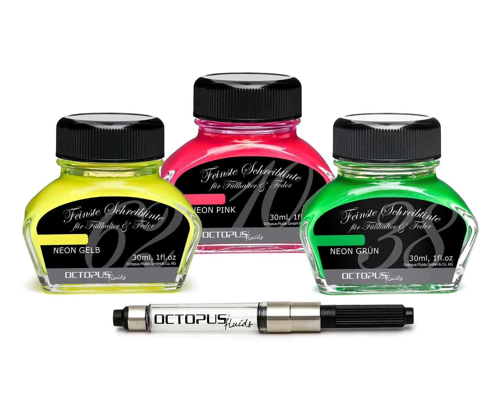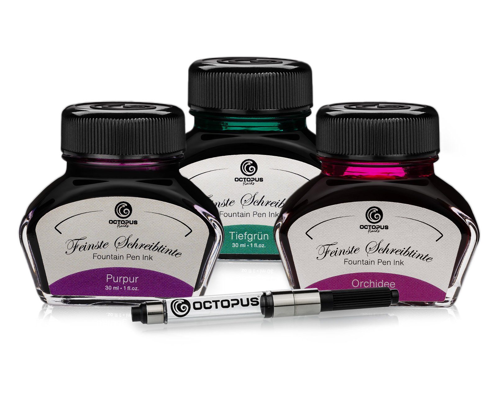 3 x 30 ml Feinste Schreibtinte im Tintenglas für Füllhalter - mit praktischem Tintenkonverter