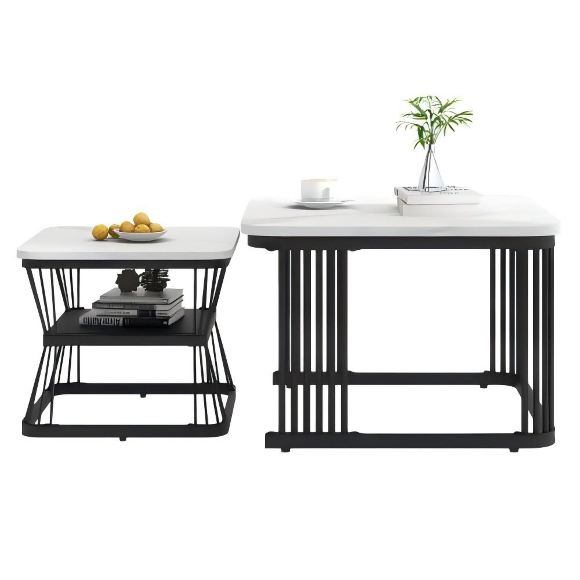 Mit unserem 2er Set moderner Beistelltische holen Sie sich zeitgenössische Eleganz und praktischen Stauraum in Ihr Zuhause. Die Tischplatten bestehen aus hochwertigem PVC in Marmoroptik, was diesen Tischen einen luxuriösen Look verleiht. Das Schwarz-Stahlrohr-Gestell verleiht diesen Tischen eine robuste Struktur und eine matte, geschliffene Oberfläche für ein angenehmes, taktiles Erlebnis.