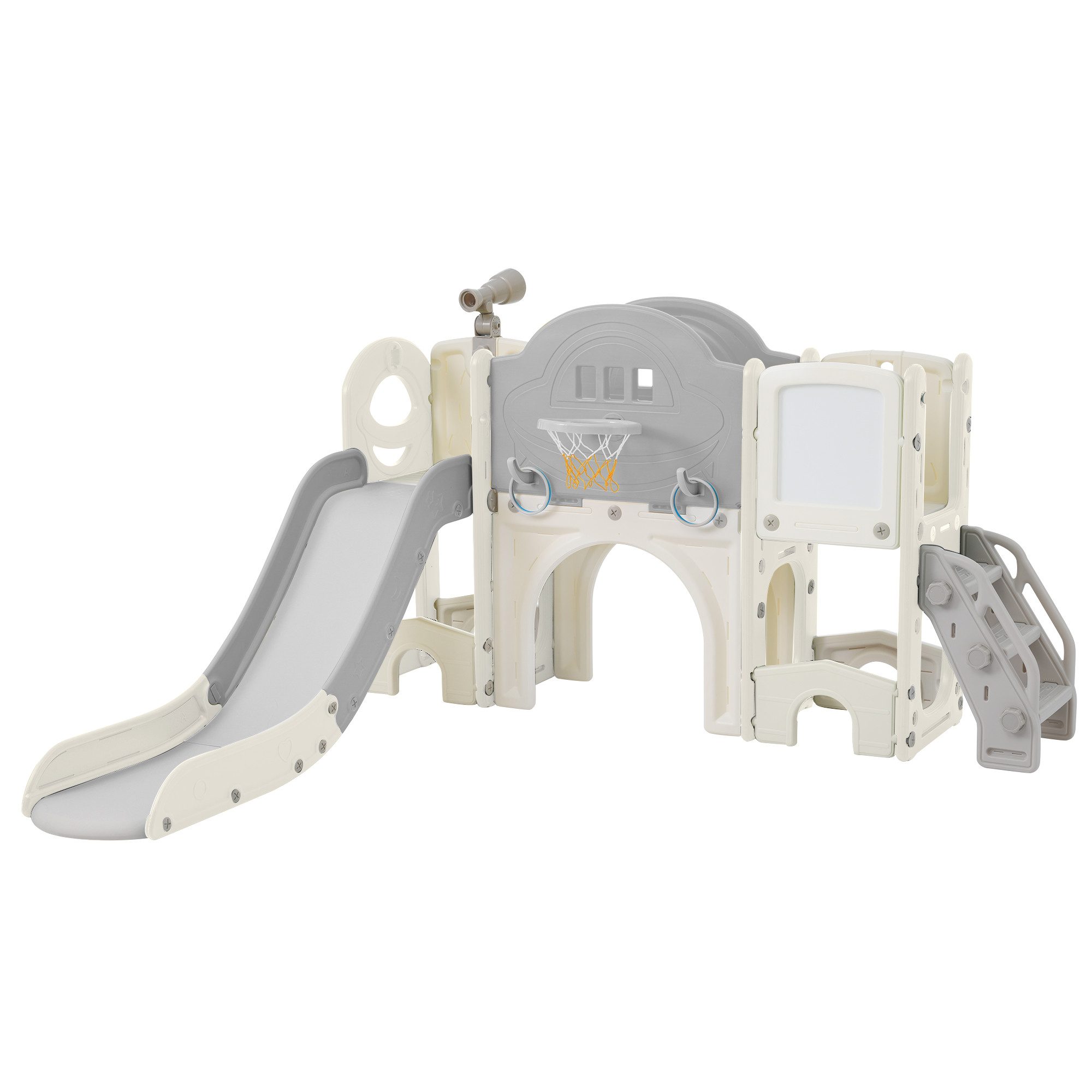 1.Der ultimative Spielplatz für Kinder!Bringen Sie den Spaß eines großen Spielplatzes in Ihren Garten mit unserem 10-in-1 Rutschenset! Dieses umfangreiche Set enthält alles, was Ihre Kleinen für stundenlangen Spielspaß brauchen. Mit aufregenden Rutschen, einer Kletterleiter, einer geräumigen Plattform, einem aufregenden Lasso-Spiel, Reißbrett, Golfspiel, Aufbewahrungsschränken, einem Fernglas und sogar einem Basketballkorb ist dem Spaß kein Ende gesetzt.