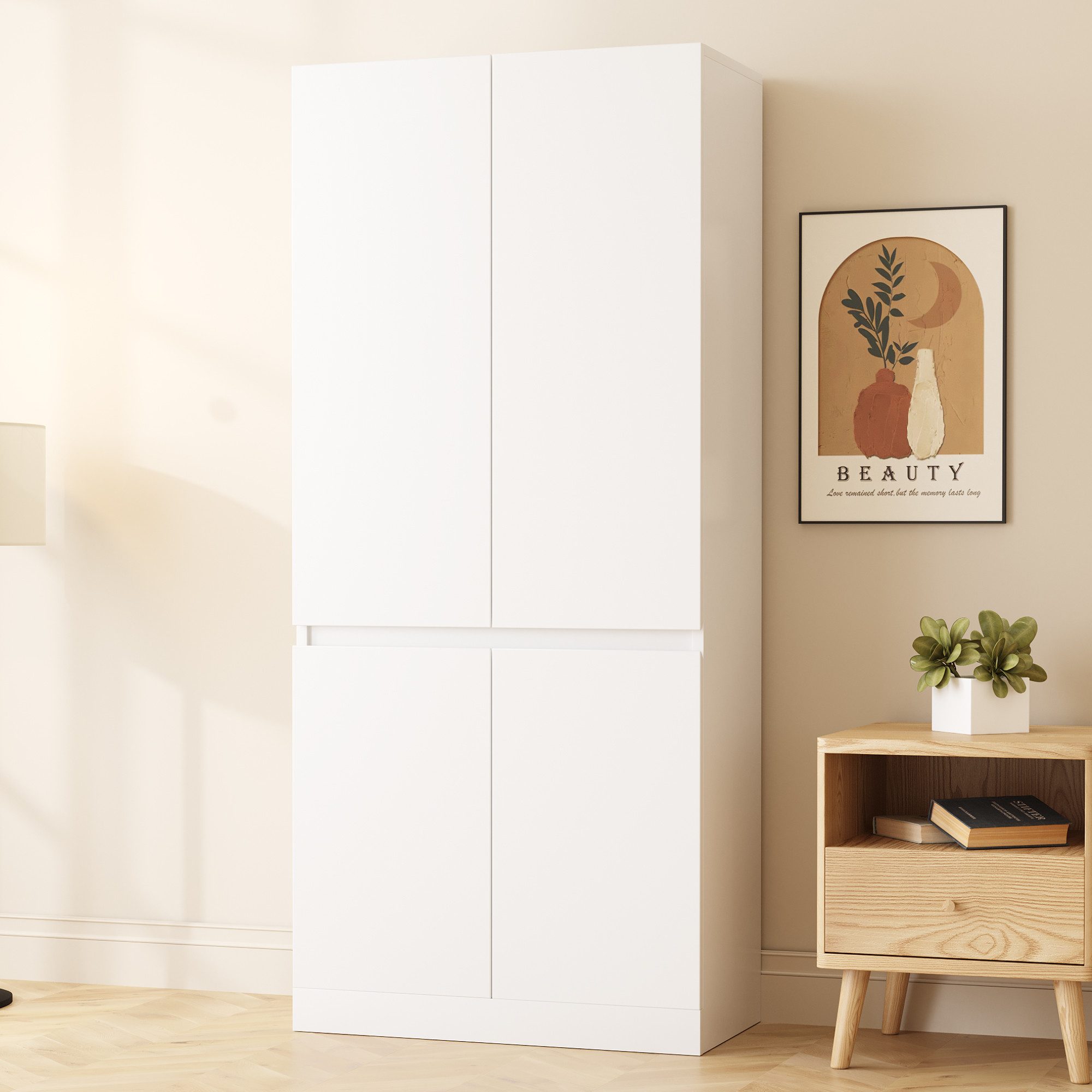 Dieser Kleiderschrank (70x40x170 cm) im modernen Doppeltür-Design bietet großzügigen Stauraum für Kleidung, Taschen und Accessoires. Die weiße Oberfläche passt perfekt zu verschiedenen Einrichtungsstilen und sorgt für eine helle, freundliche Optik.