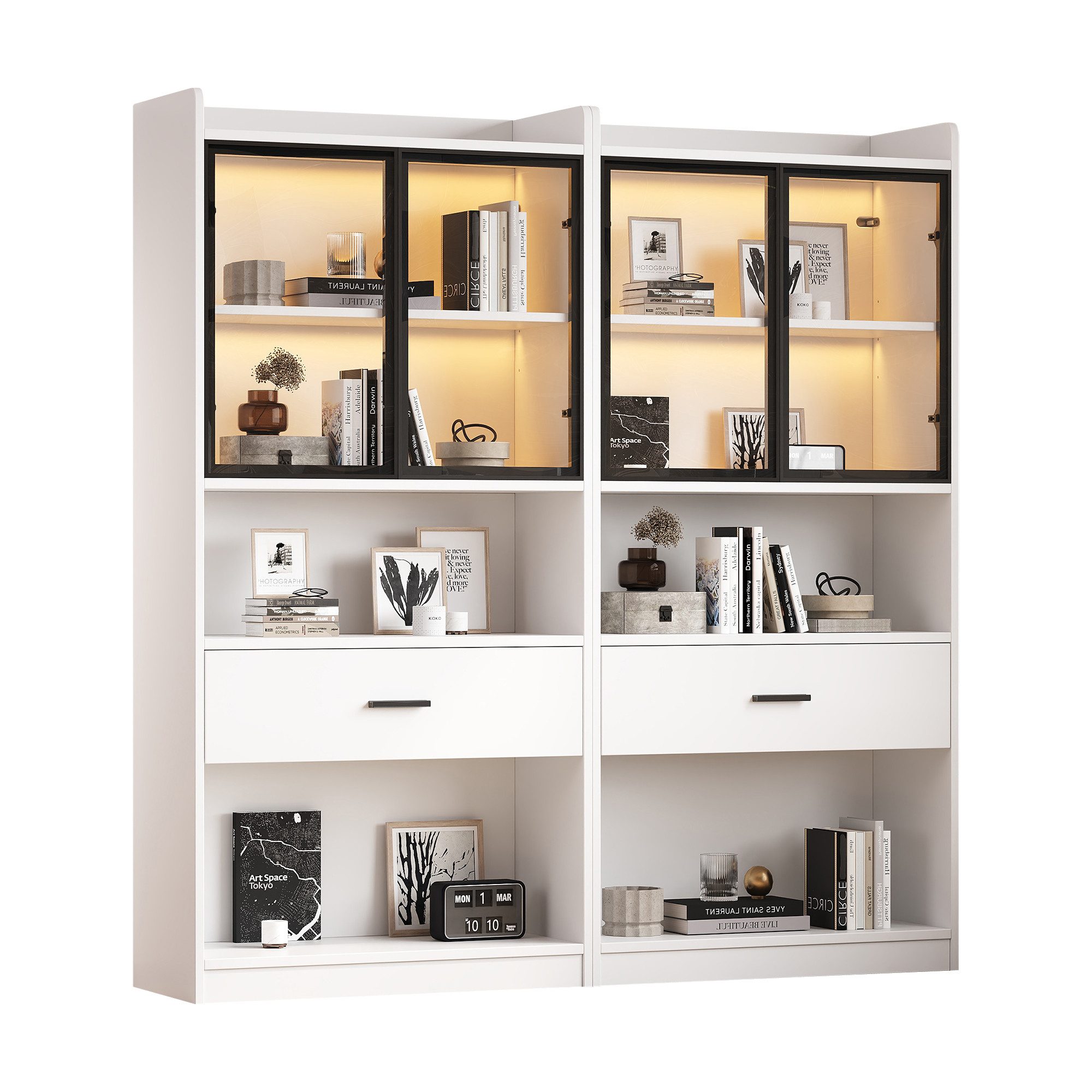 Curio Vitrine mit Licht, Aufbewahrungsregale mit Pop-up Glastüren, 1 große Schubladen & 16 Farben Licht, Sammlerstücke Schrank Display Regal, Bücherregal Vitrine für Wohnzimmer, weiß, schwarzer Fenste